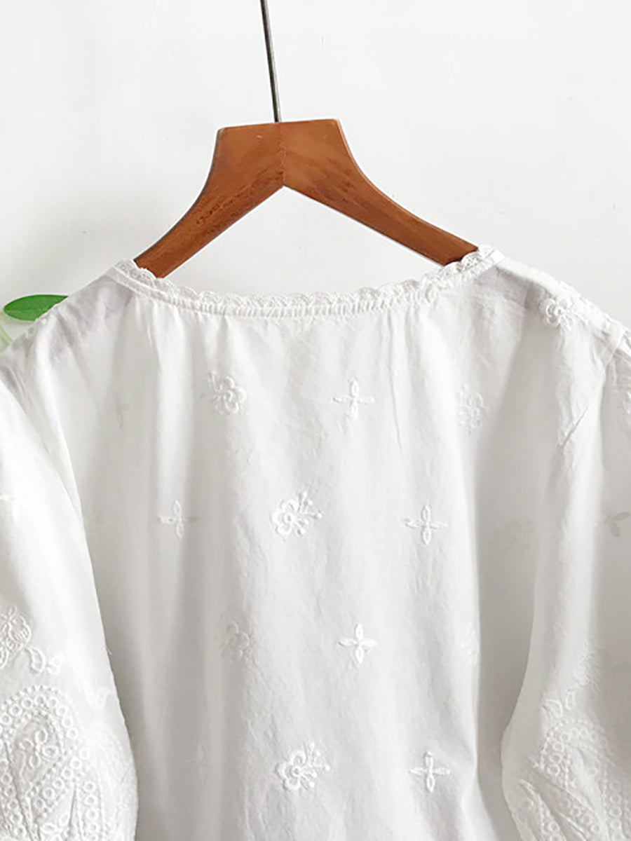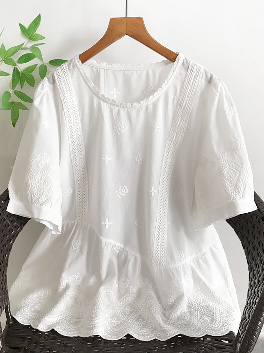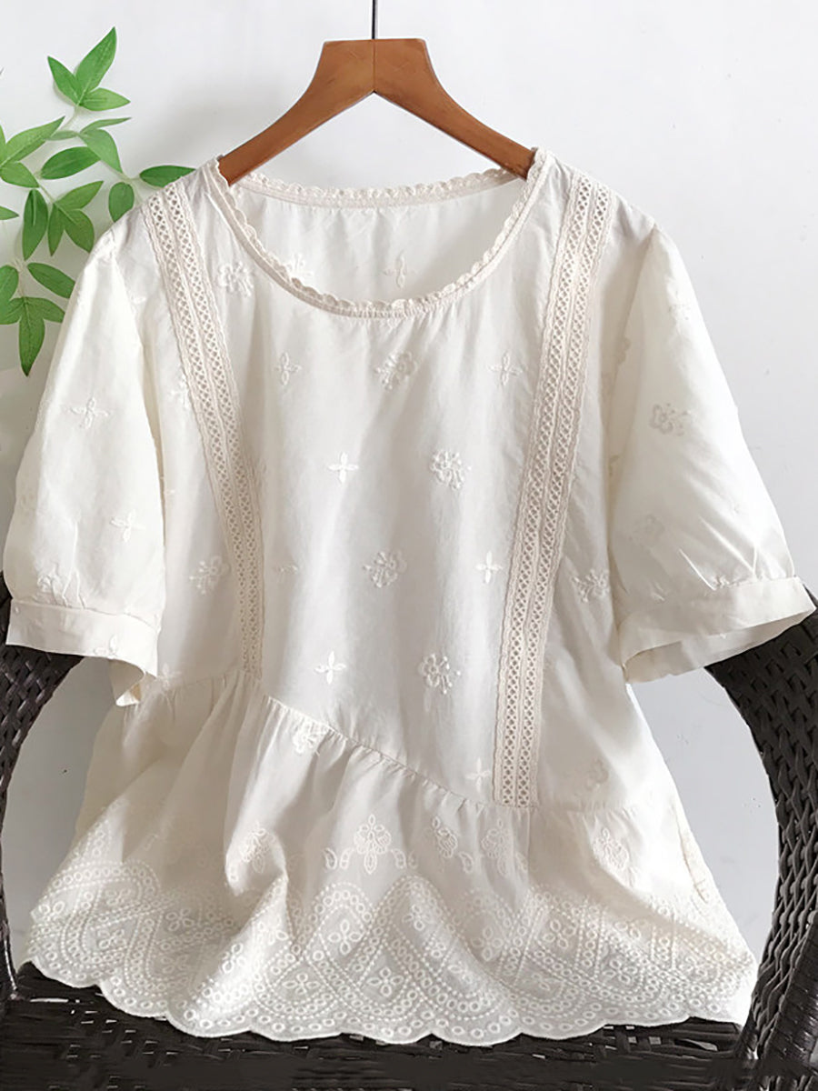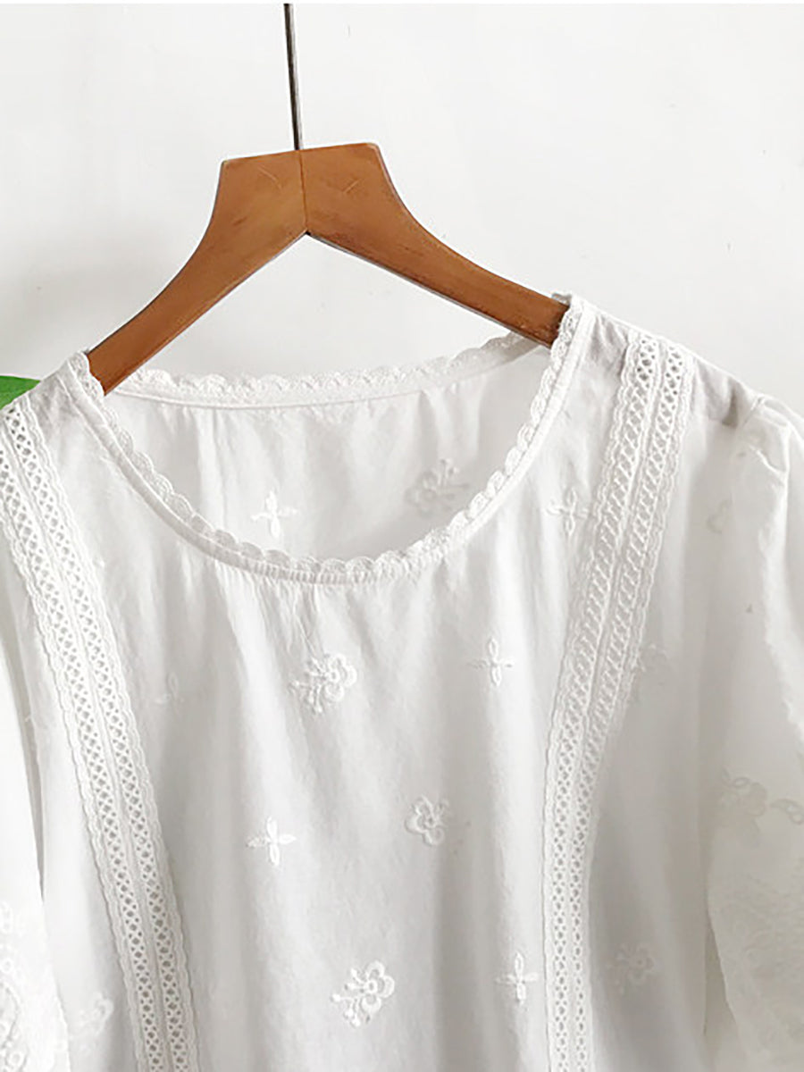 Blusa de verano para mujer con cuello redondo y bordado artístico, 100% algodón.