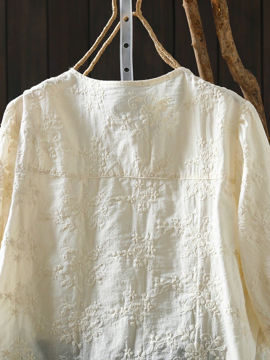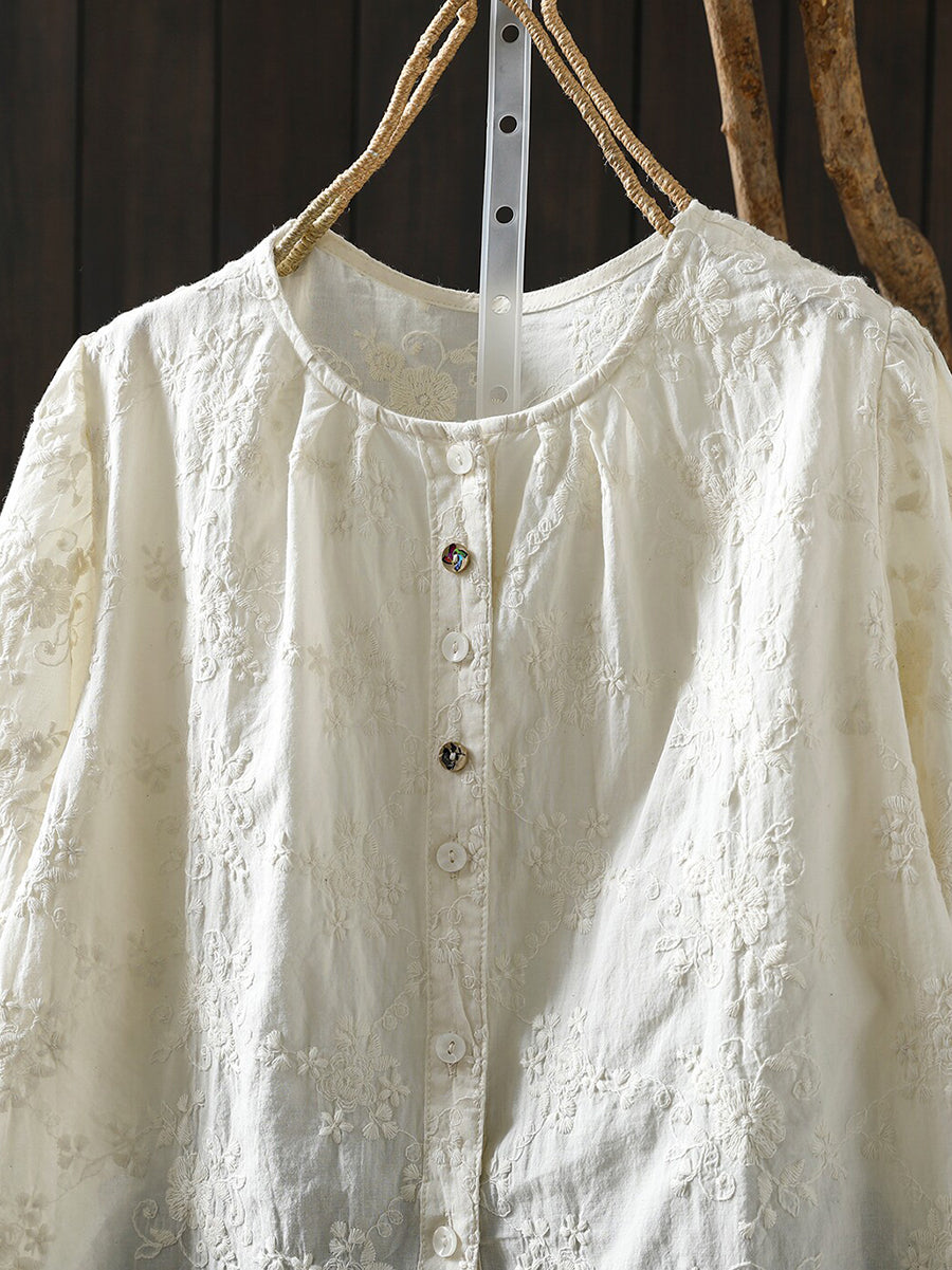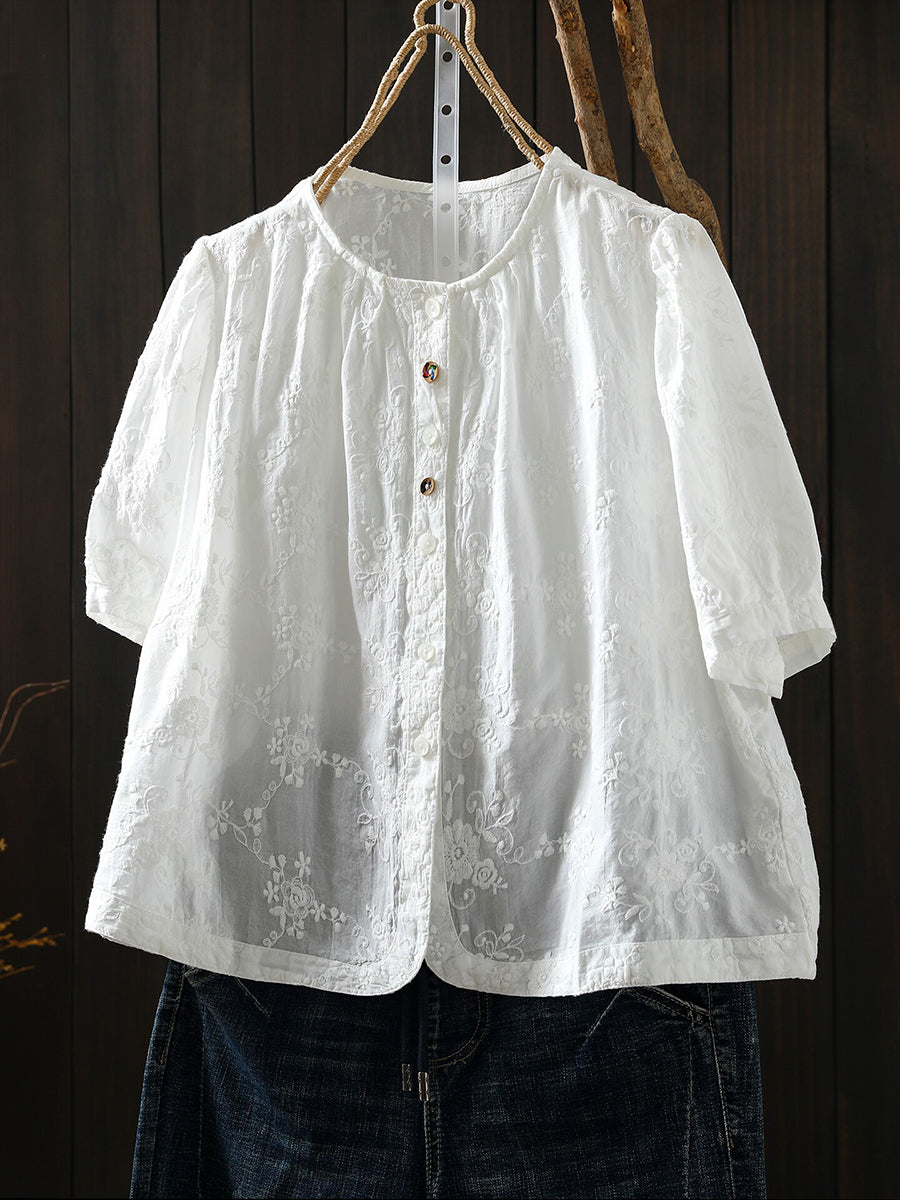 Camisa de verano para mujer con cuello redondo y bordado artístico, 100% algodón.