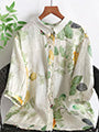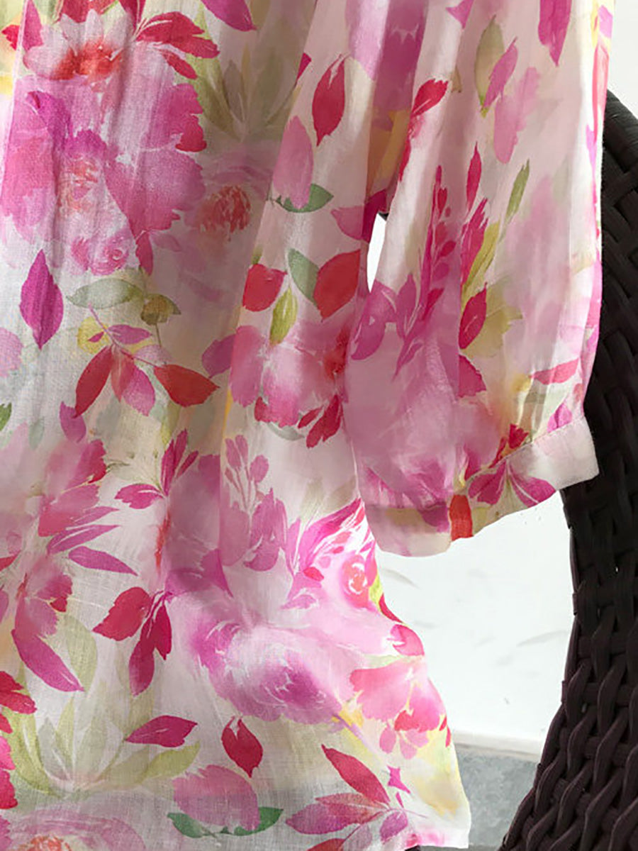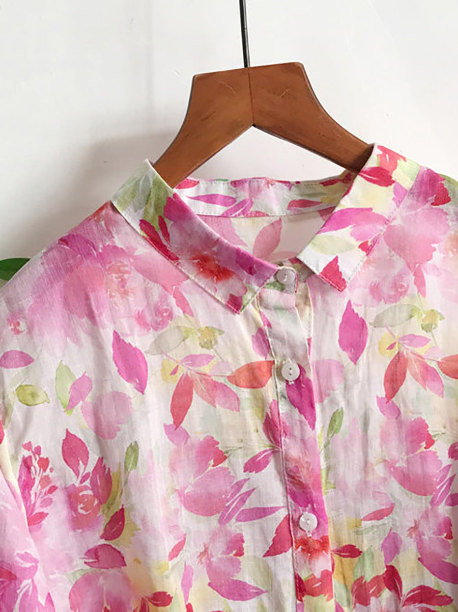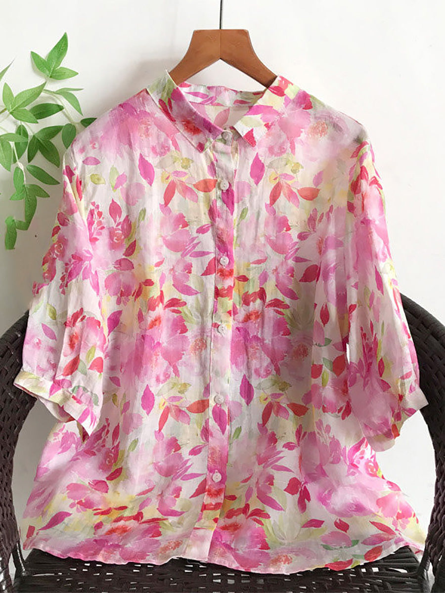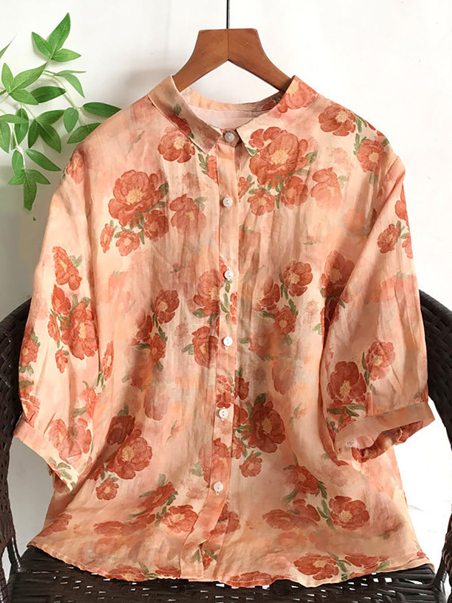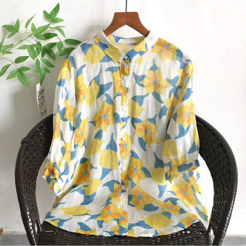 Camisa de verano para mujer con estampado floral artístico, 100% ramio.