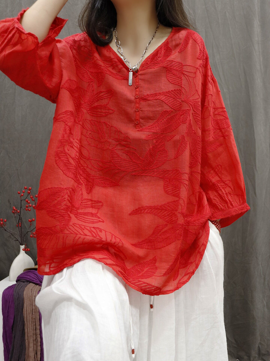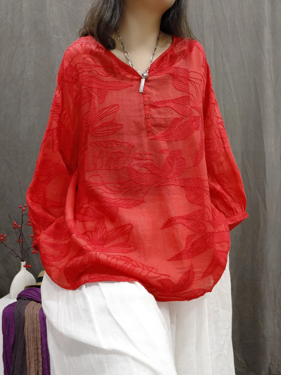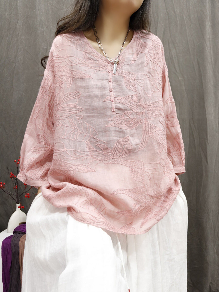 Blusa de verano para mujer con bordado floral artístico 100 % ramio