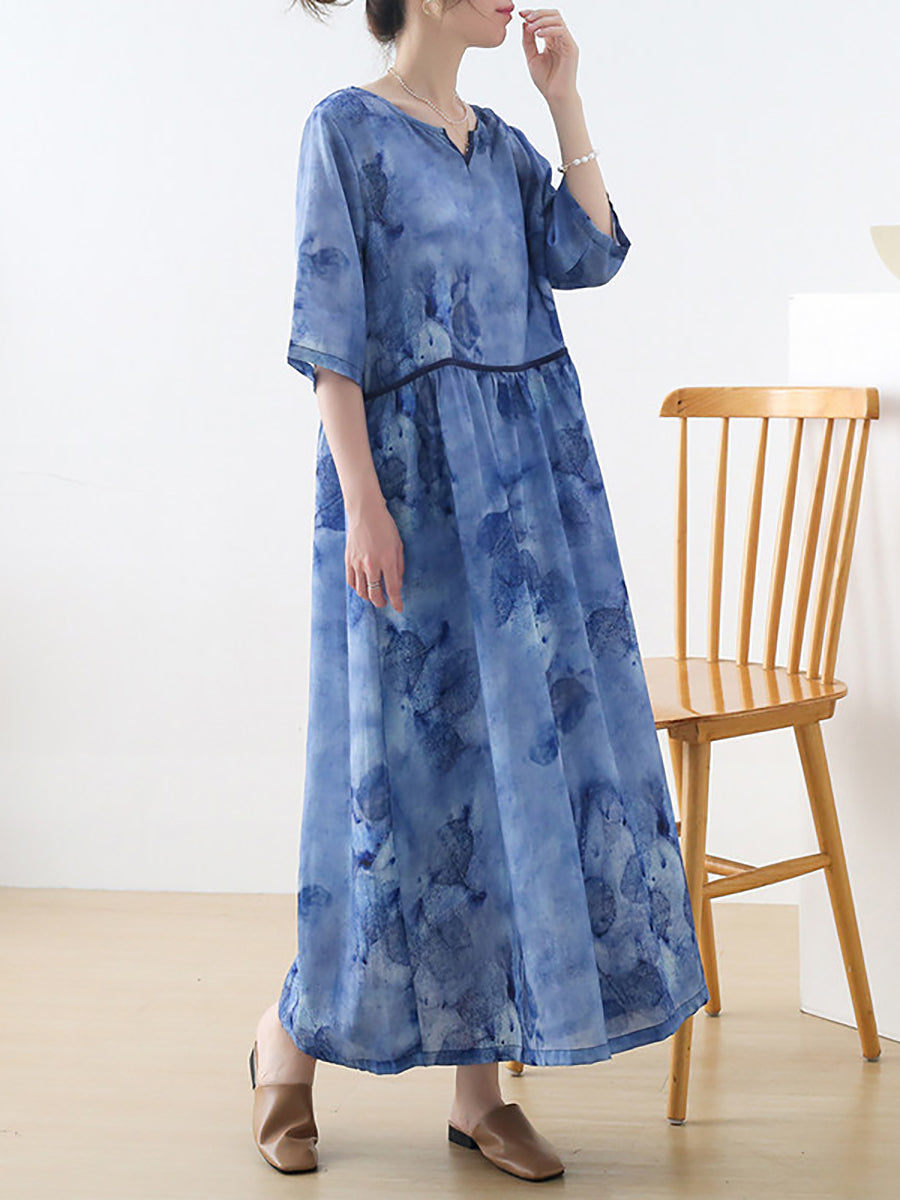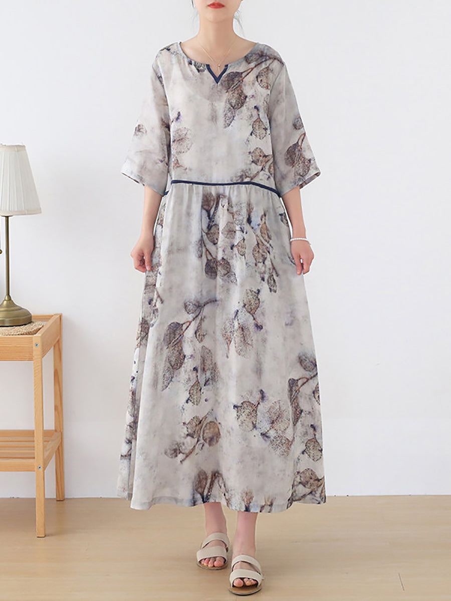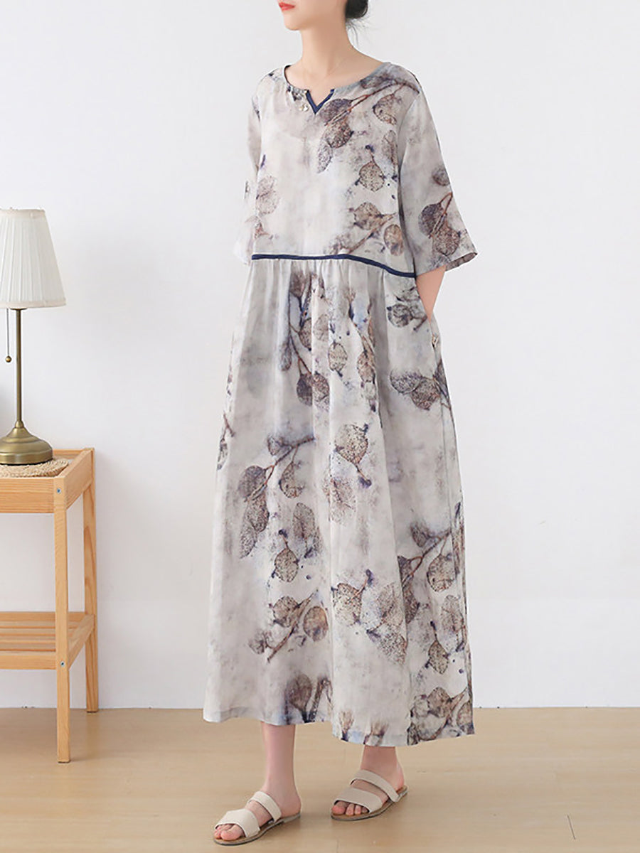 Vestido de verano para mujer, 100 % ramio, con escote en V y flores artísticas