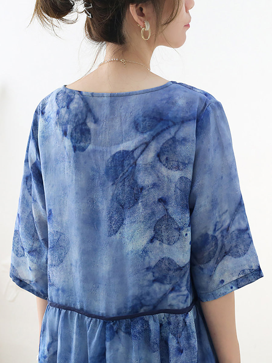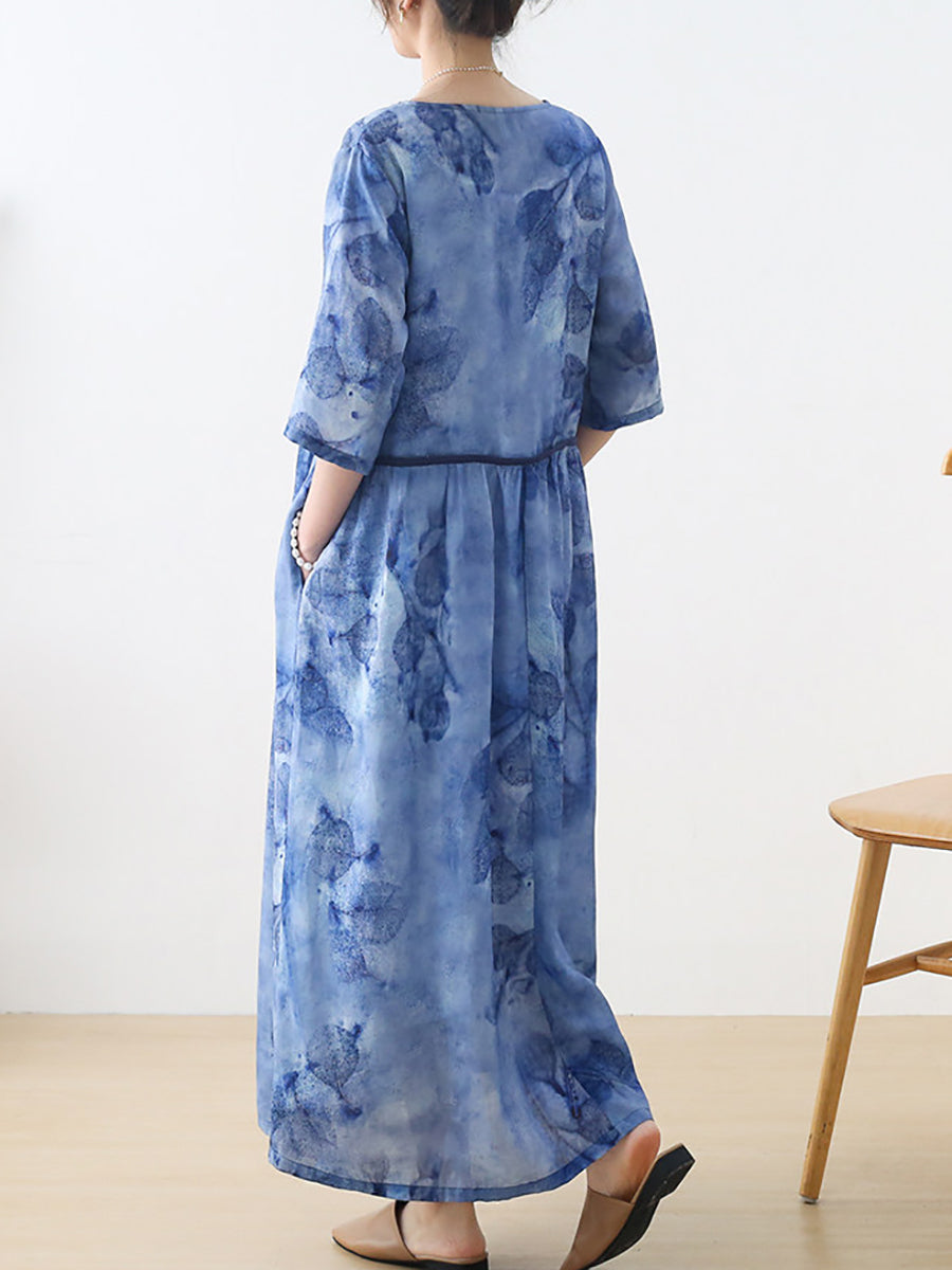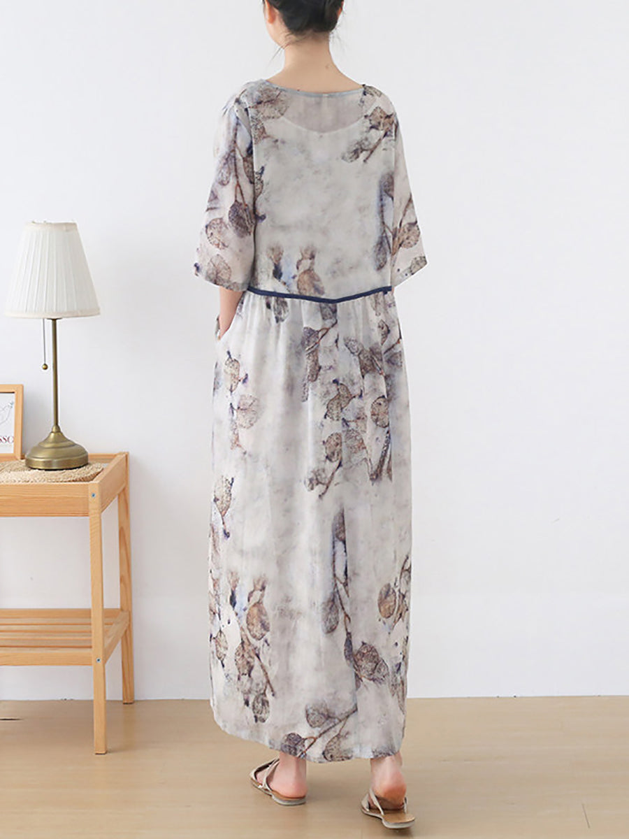 Vestido de verano para mujer, 100 % ramio, con escote en V y flores artísticas