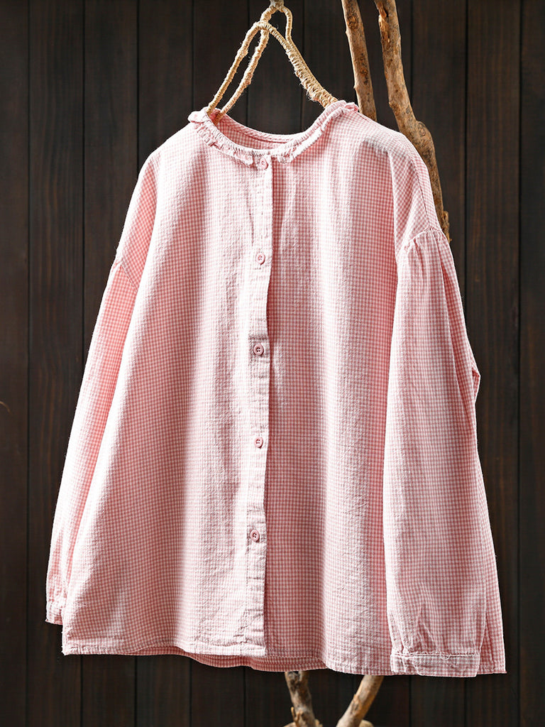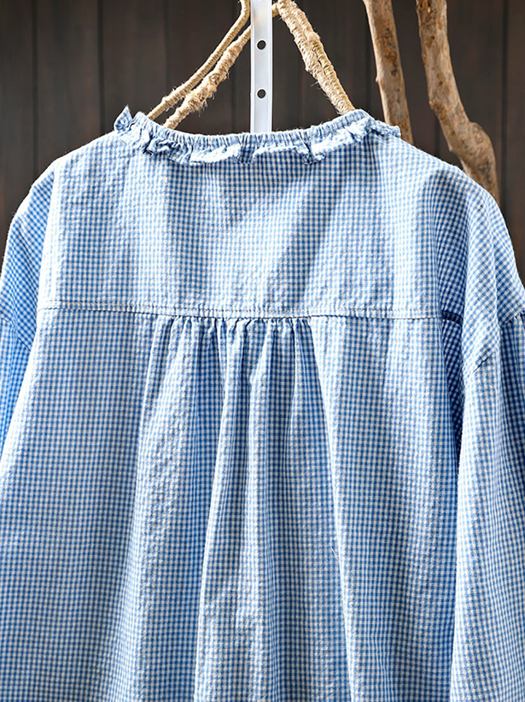 Camisa de verano para mujer, 100 % algodón, con cuello de encaje y cuadros artísticos