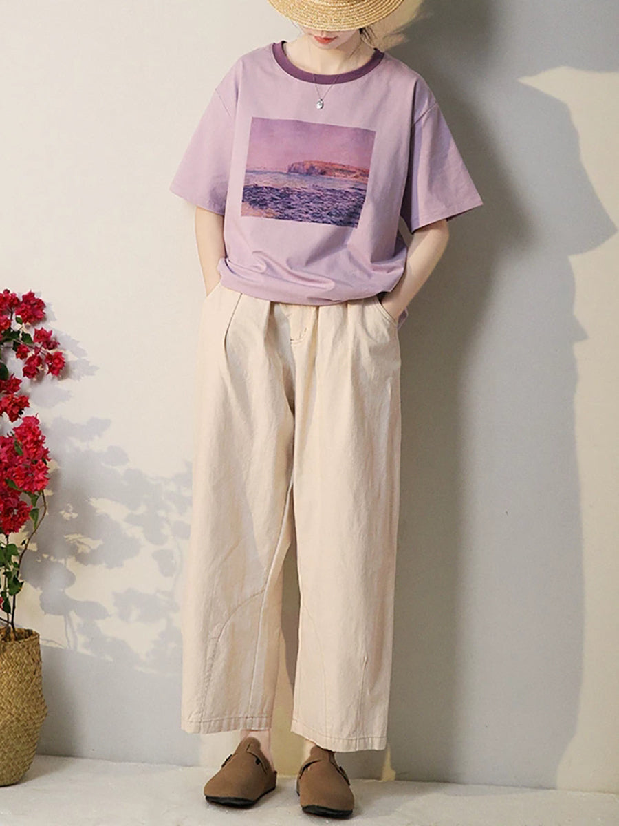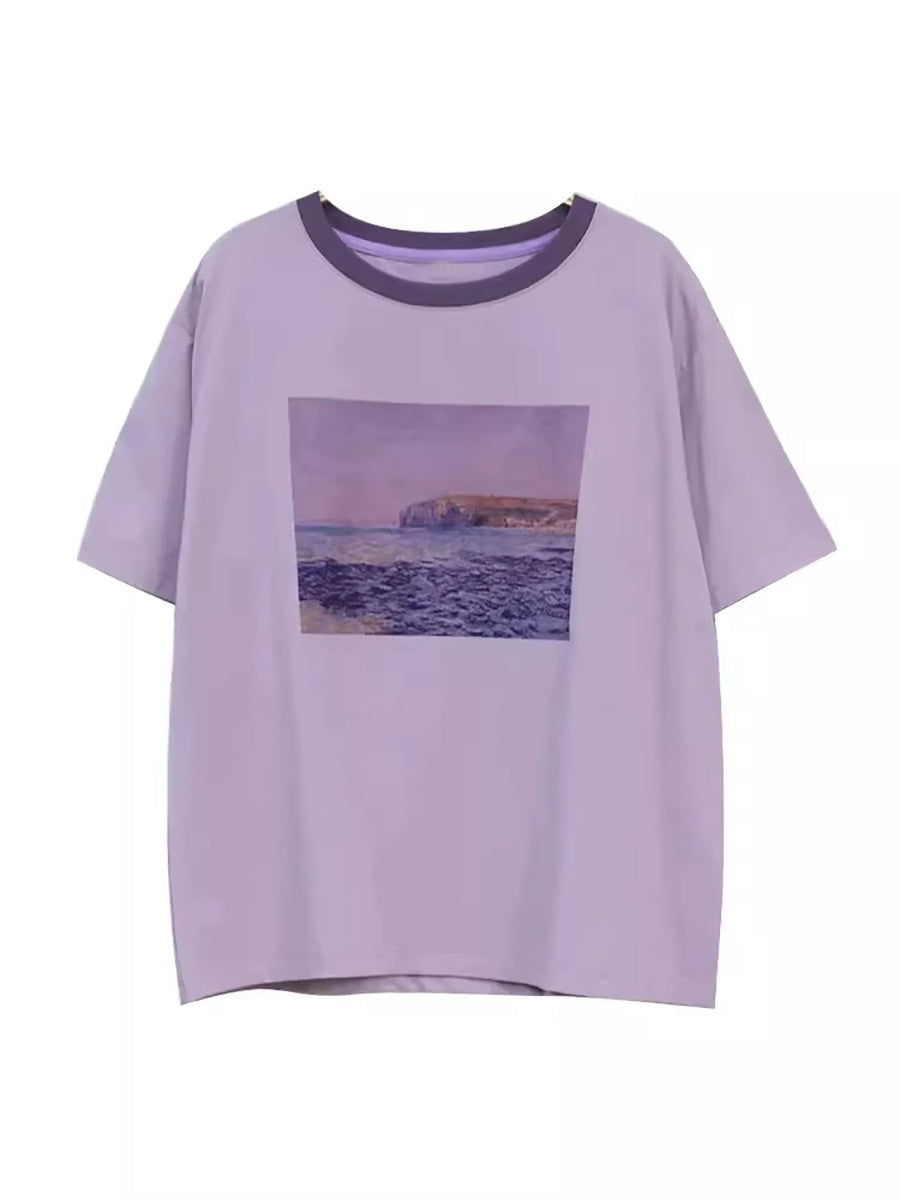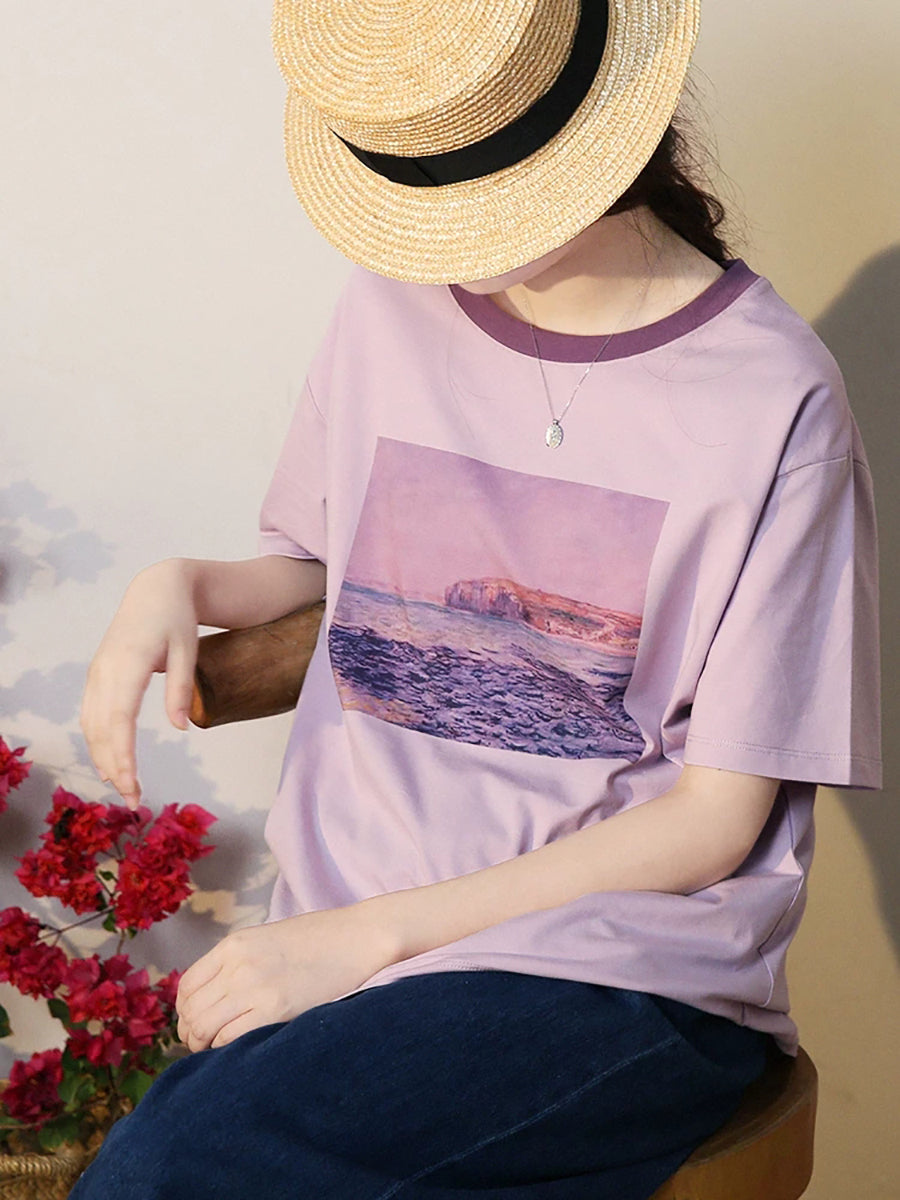 Blusa de algodón con cuello redondo y estampado artístico de verano para mujer