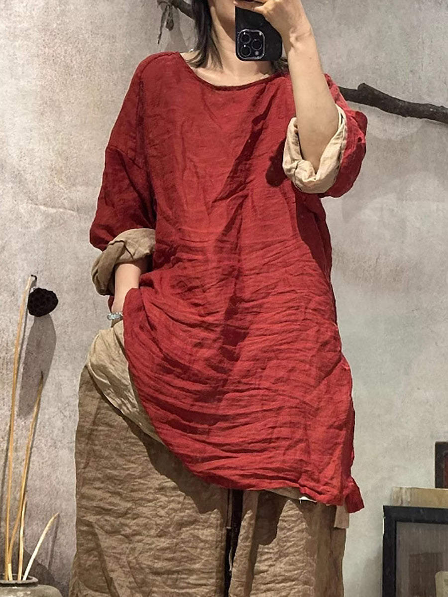 Camisa de ramio con cuello redondo, color puro y estilo artístico de verano para mujer