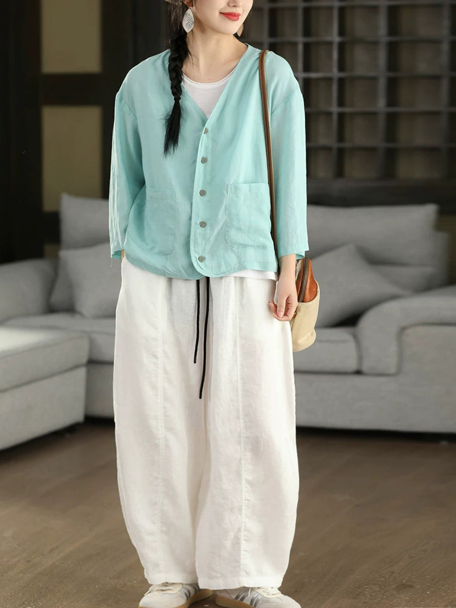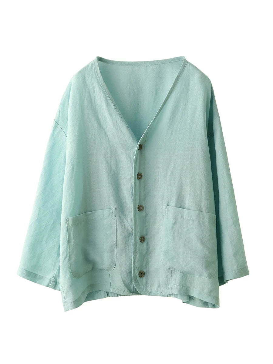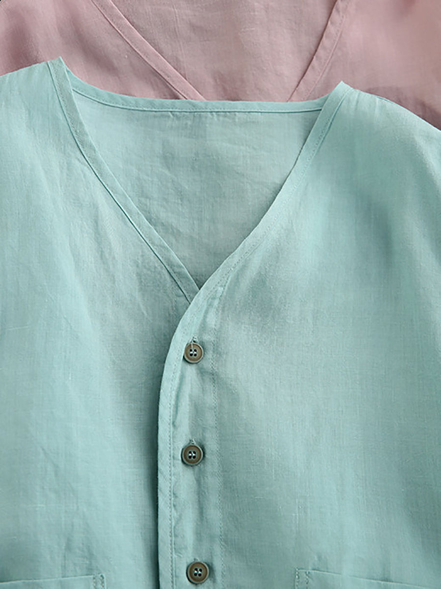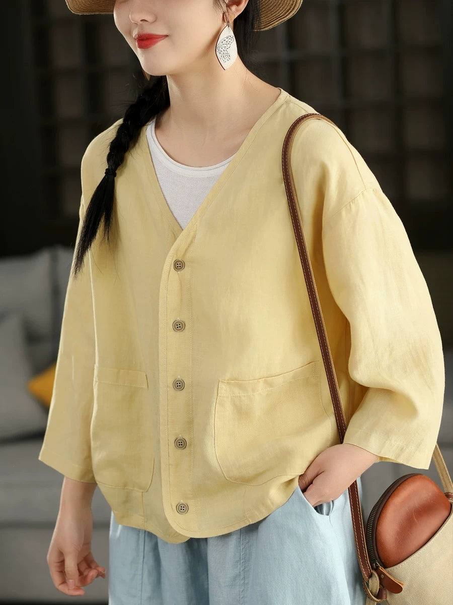 Camiseta de verano para mujer, estilo artístico, color liso, cuello en V, 100% ramio.