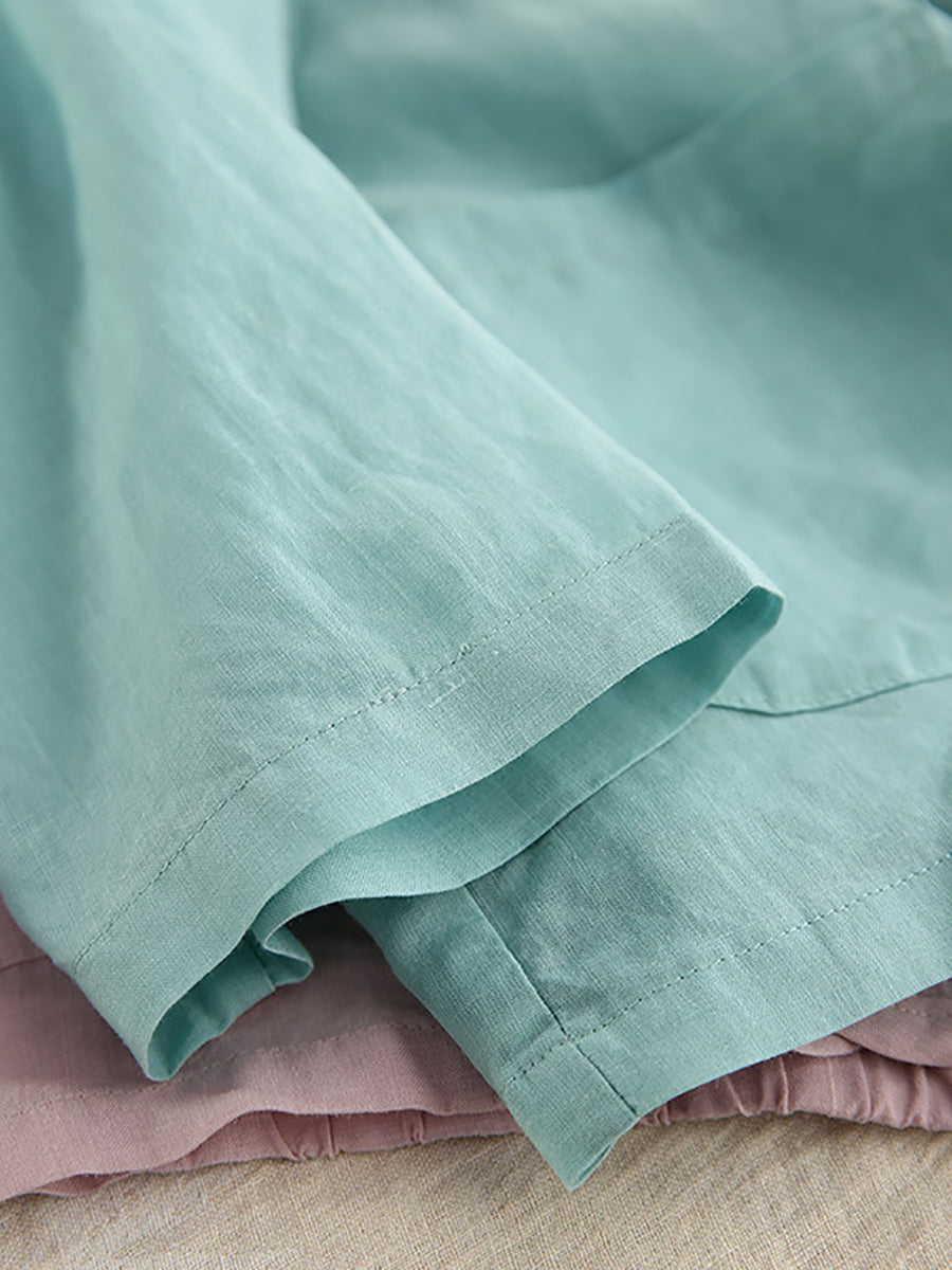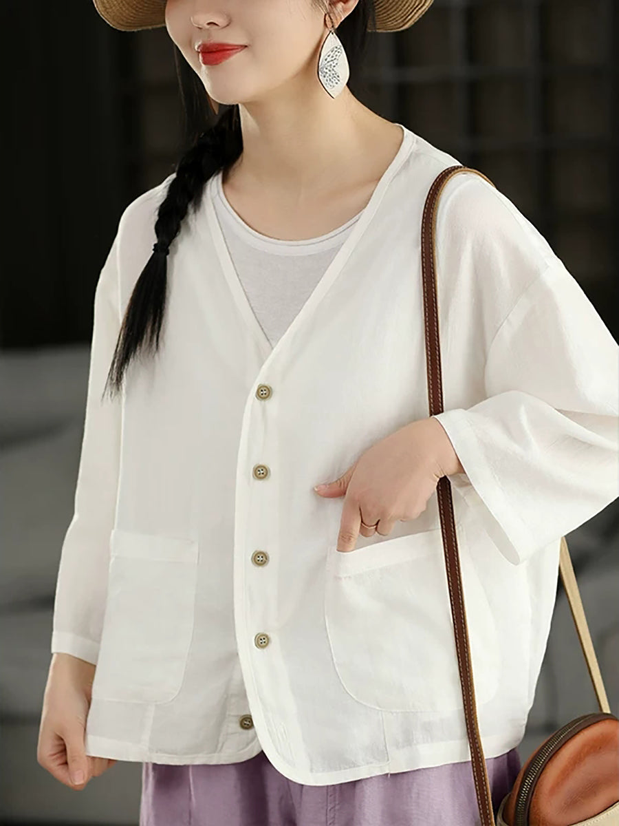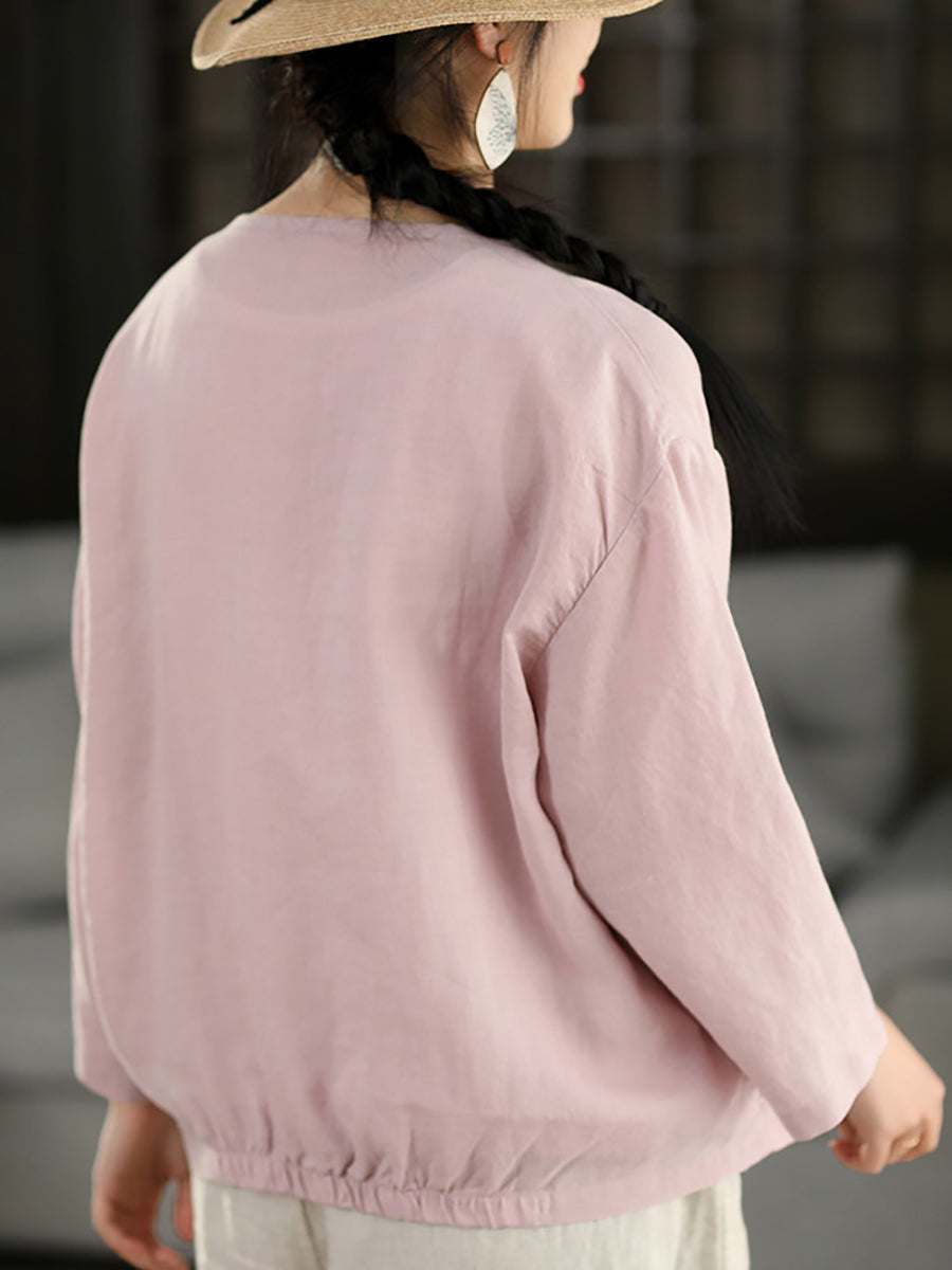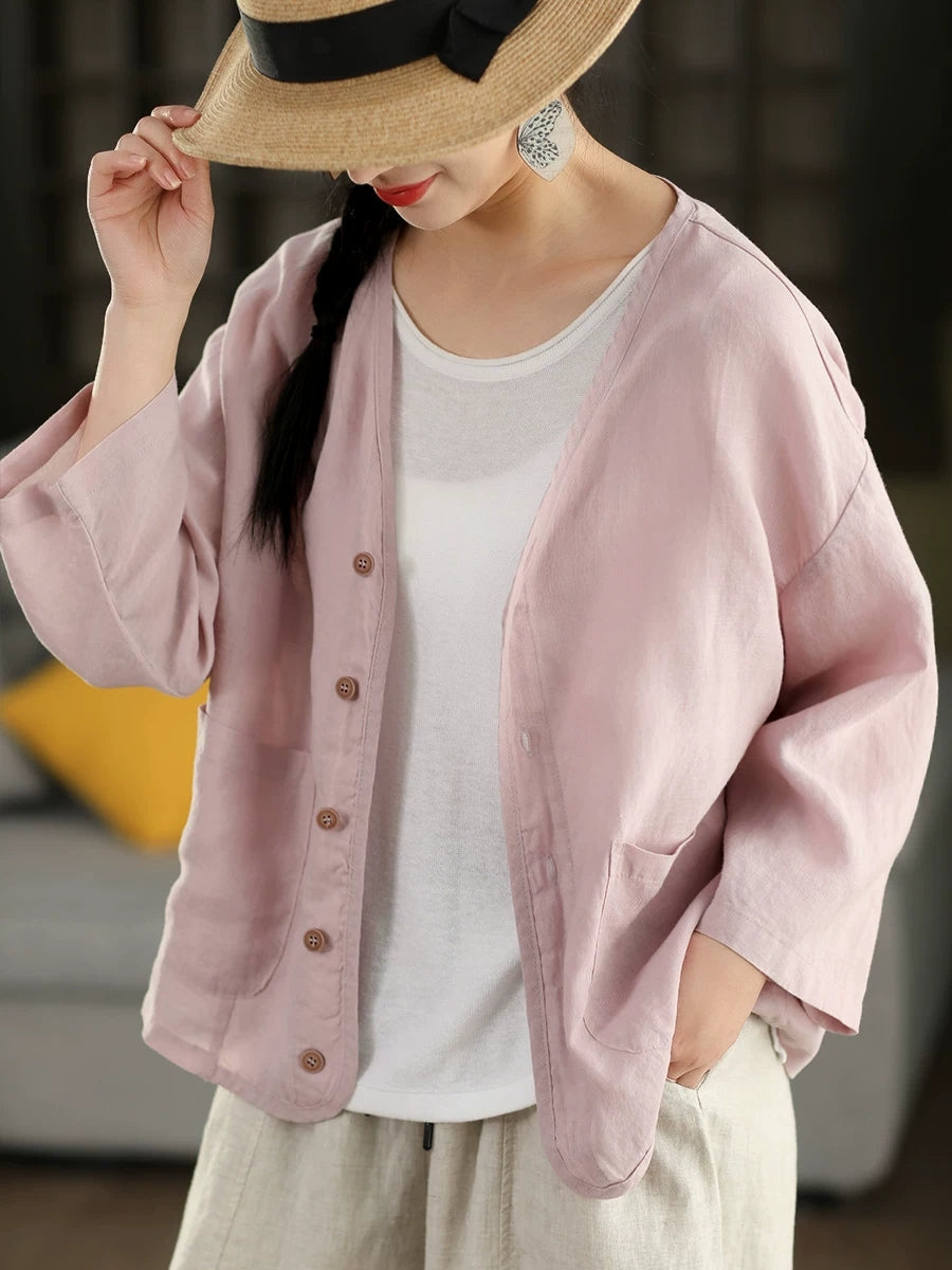 Camiseta de verano para mujer, estilo artístico, color liso, cuello en V, 100% ramio.