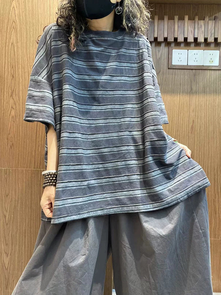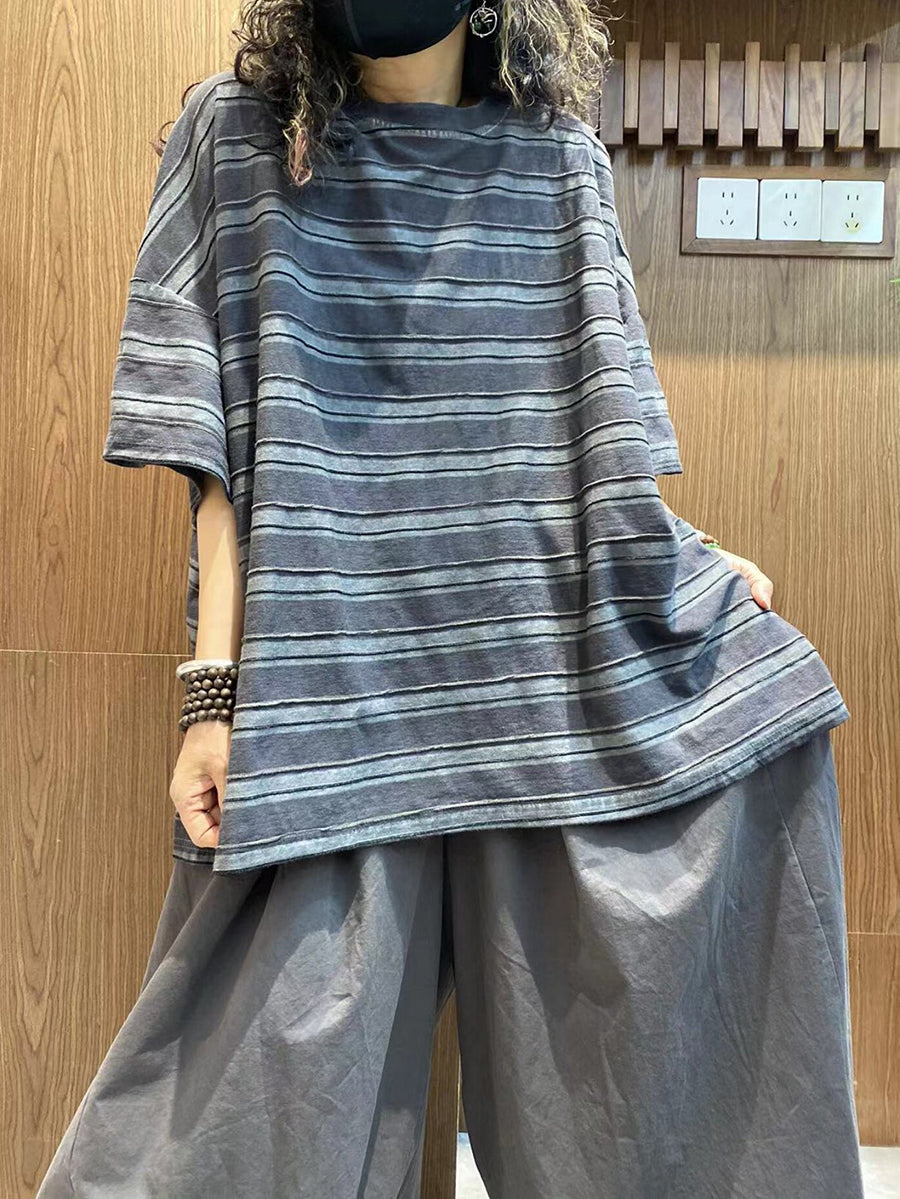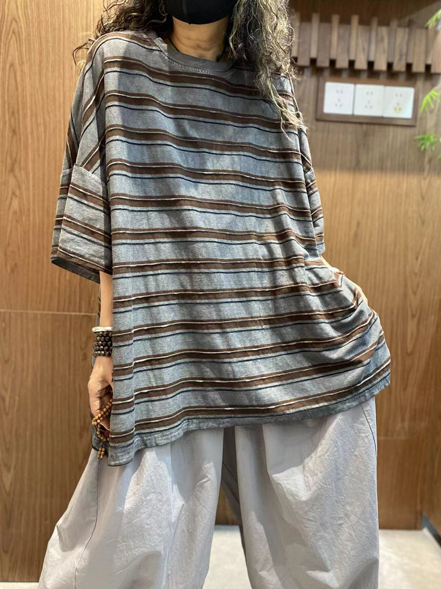 Blusa de algodón con cuello redondo y rayas artísticas de verano para mujer
