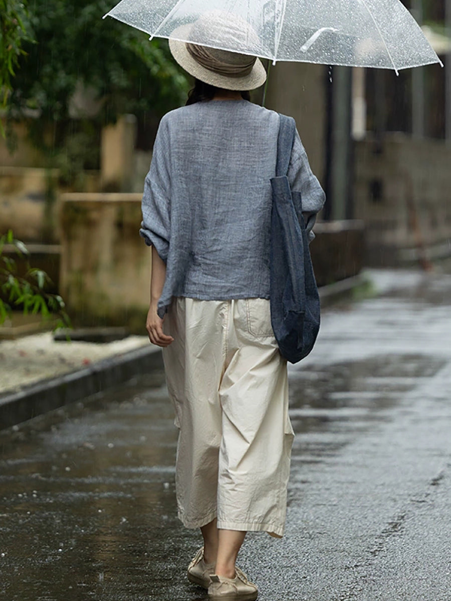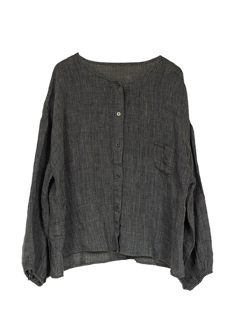 Camisa informal de verano para mujer, de lino 100 % con cuello redondo y color puro