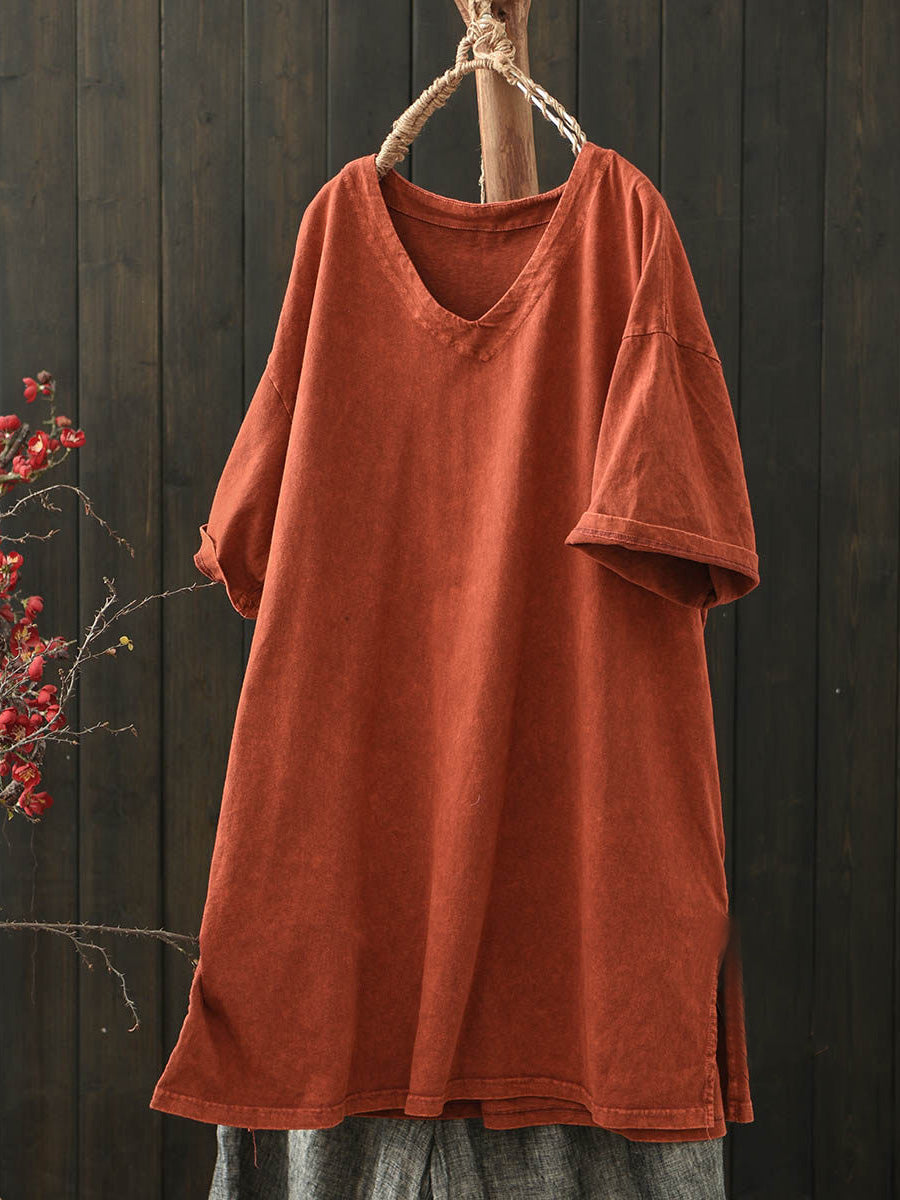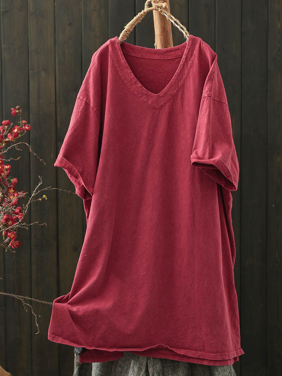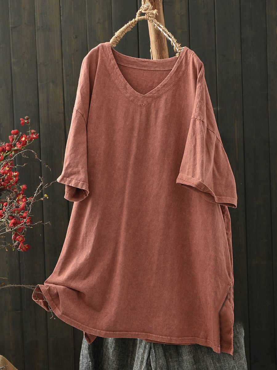 Camisa informal de algodón con cuello en V y color puro para mujer de verano