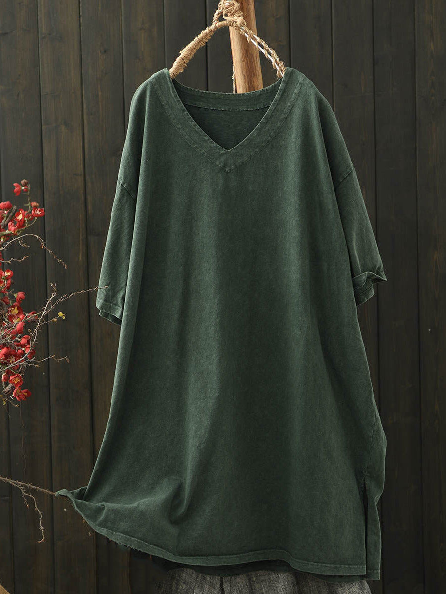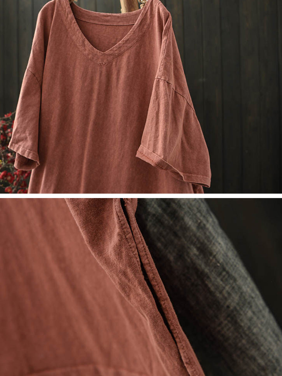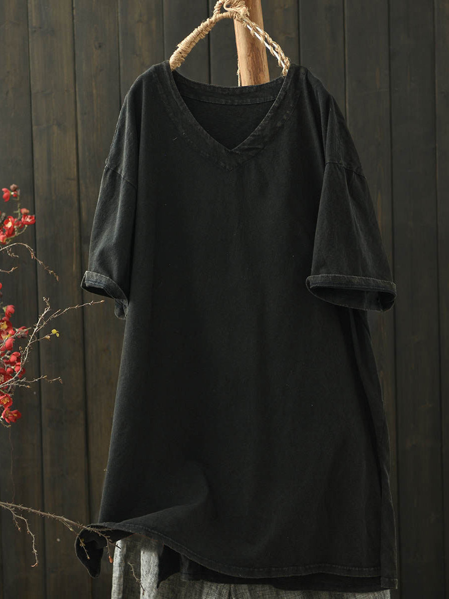 Camisa informal de algodón con cuello en V y color puro para mujer de verano
