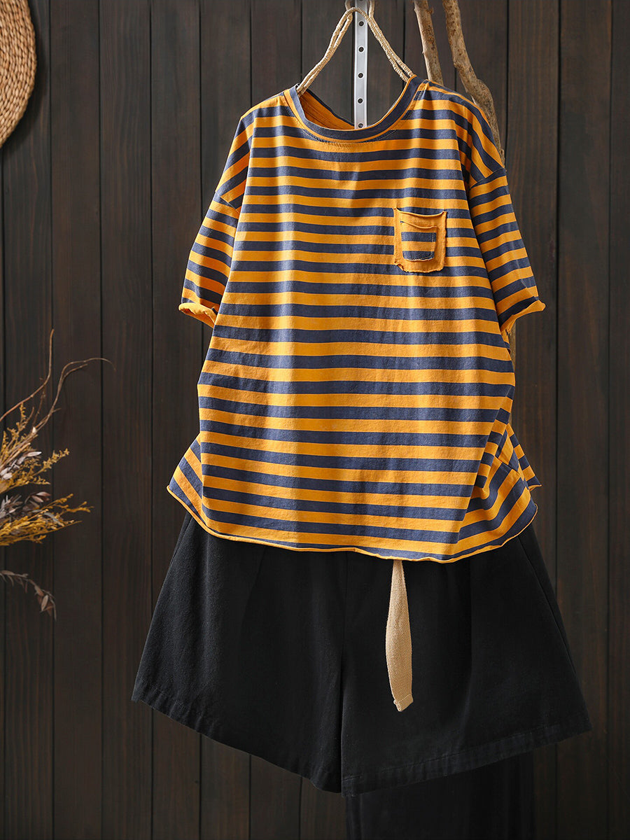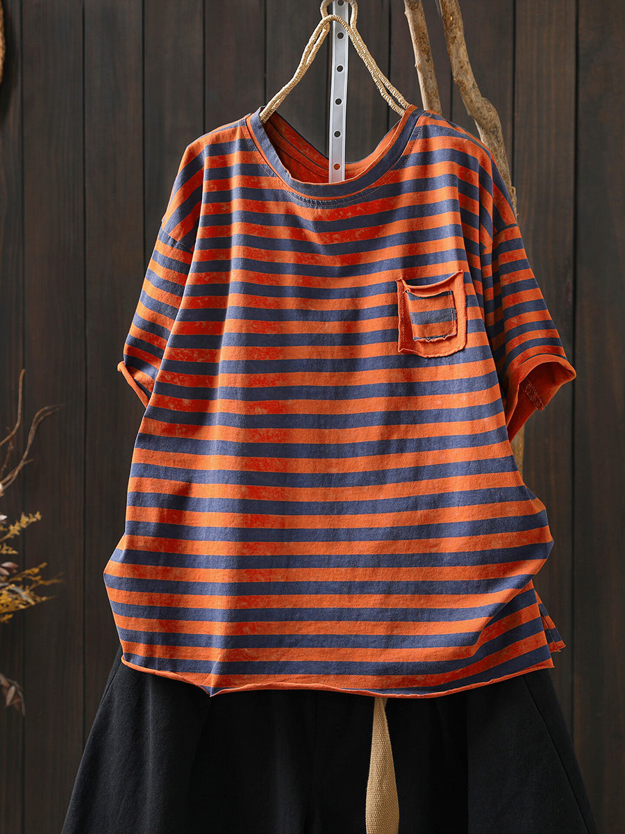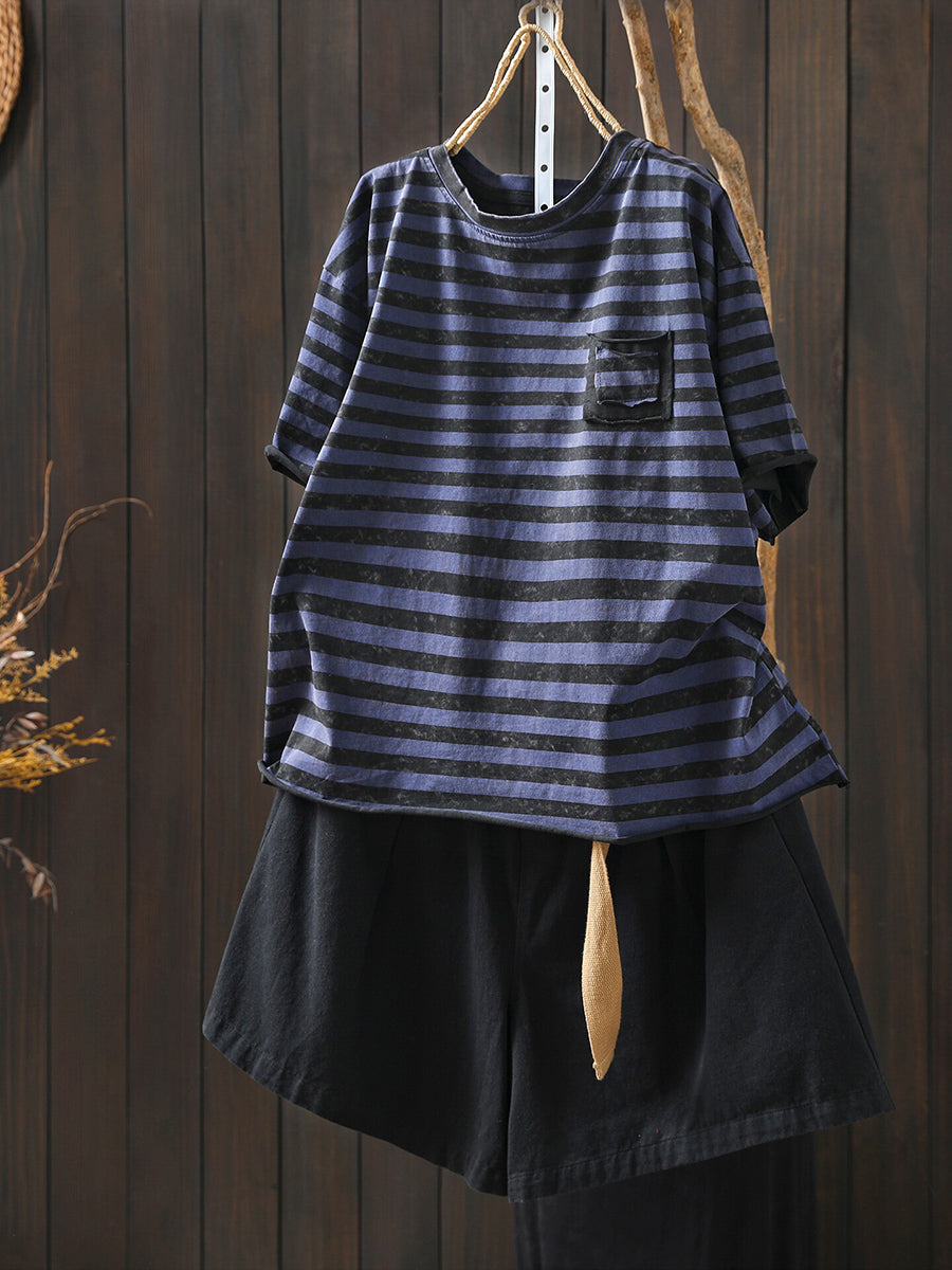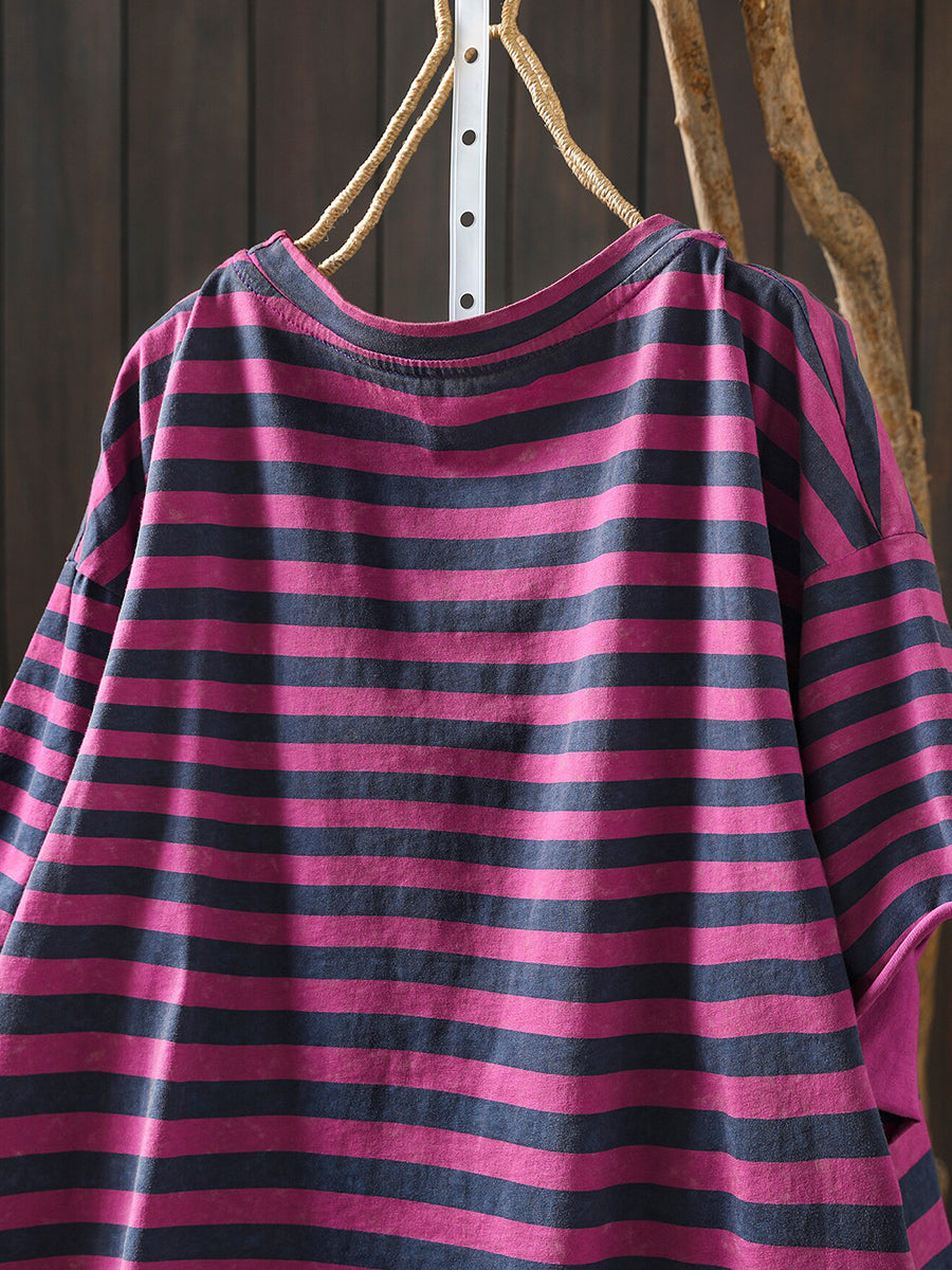 Camisa informal de verano a rayas con cuello redondo para mujer