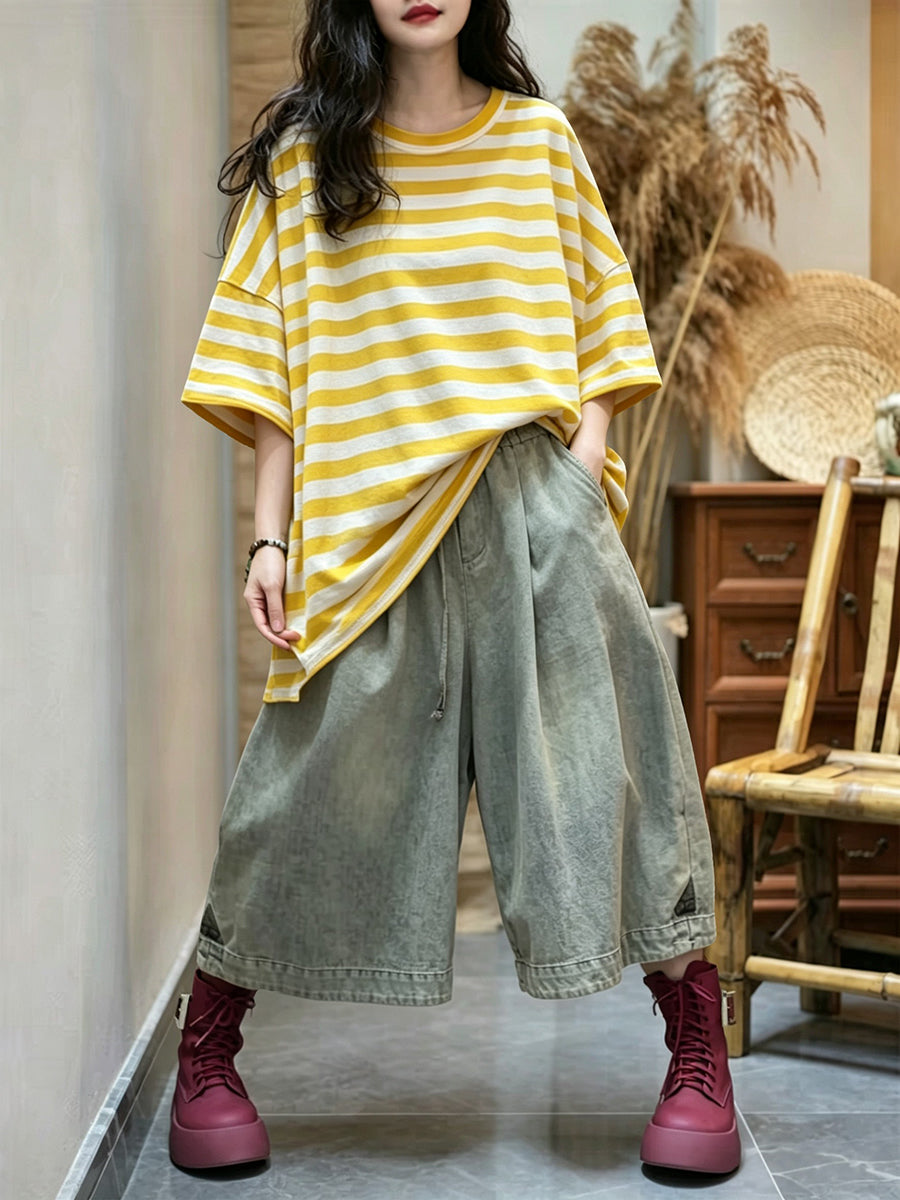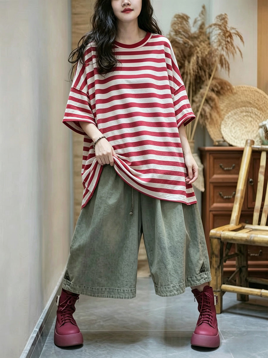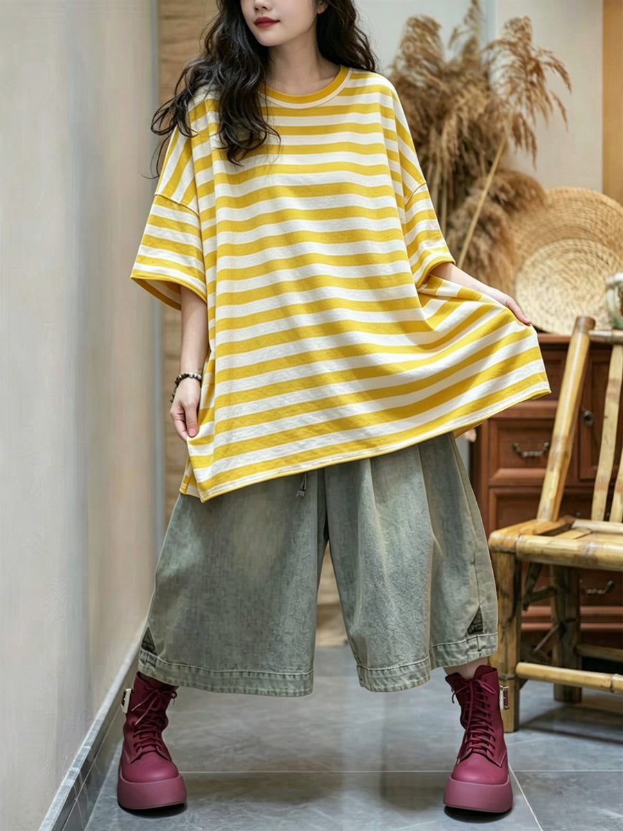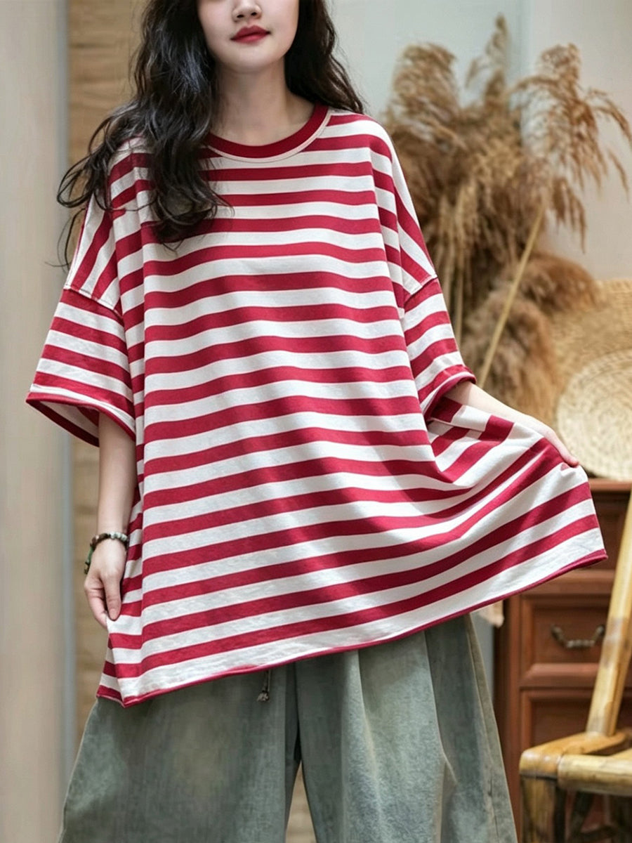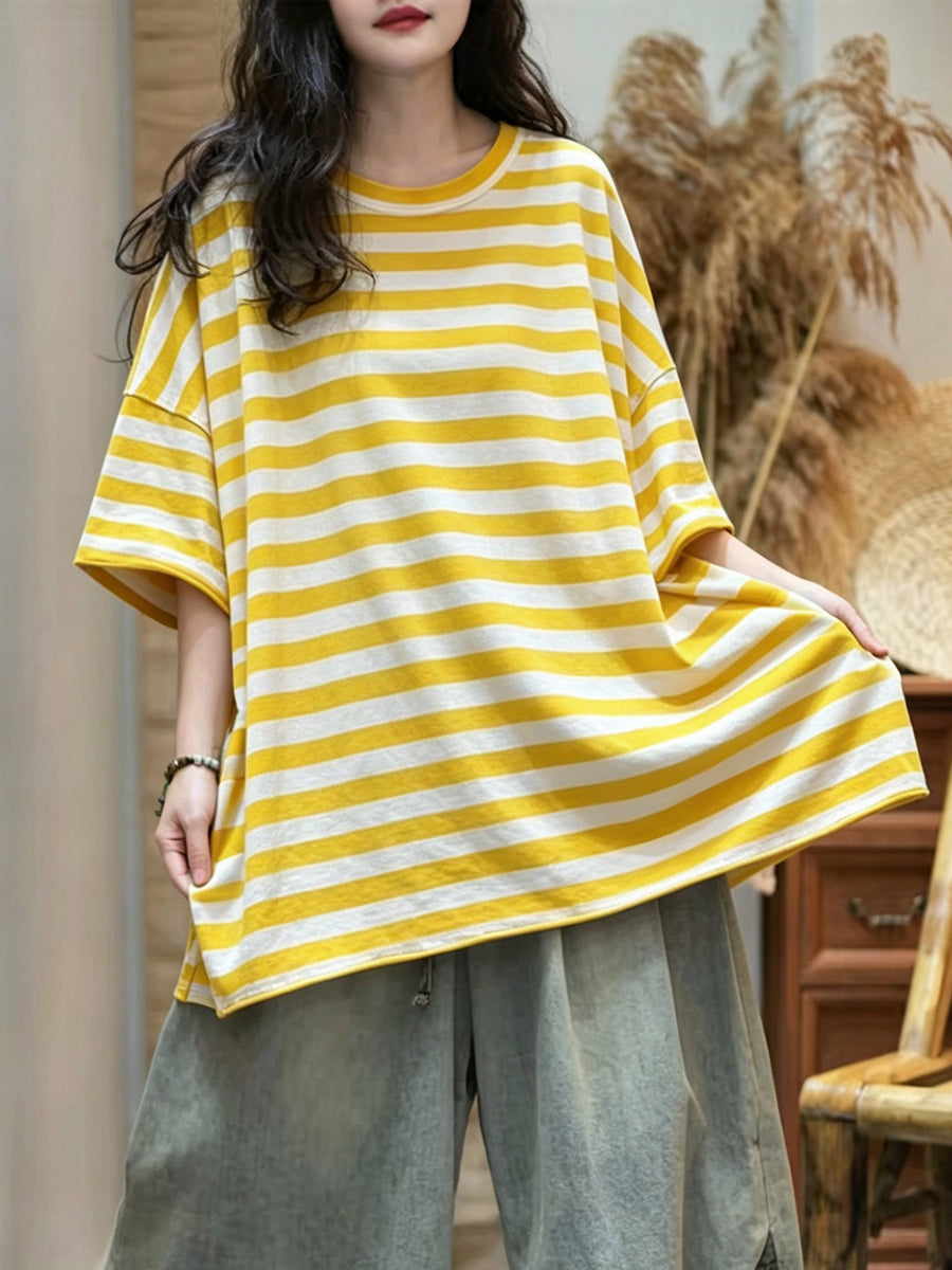 Camiseta de mujer informal de verano con cuello redondo y rayas