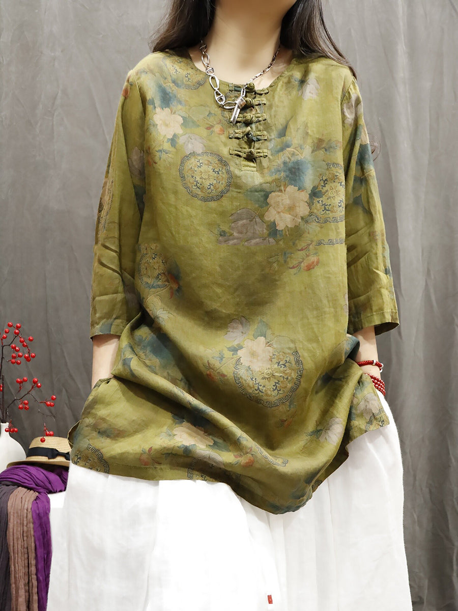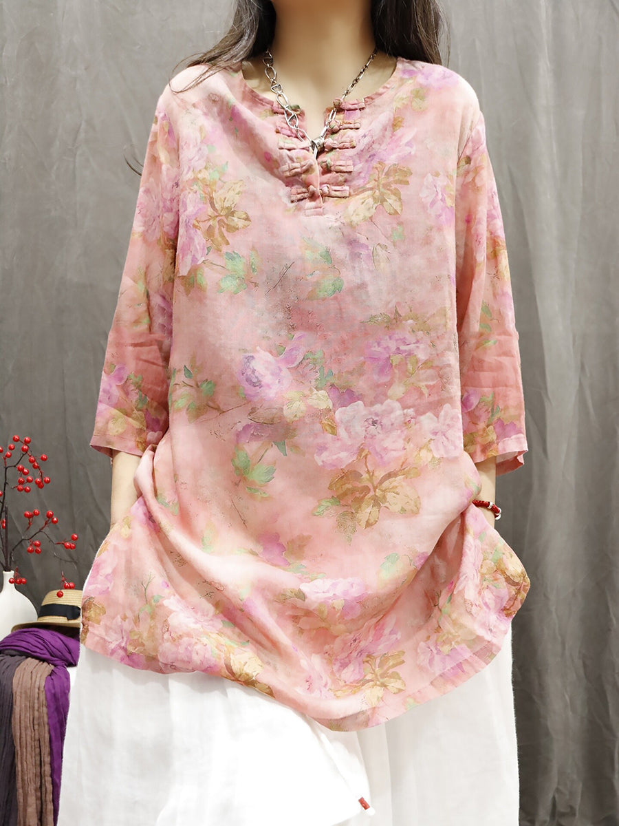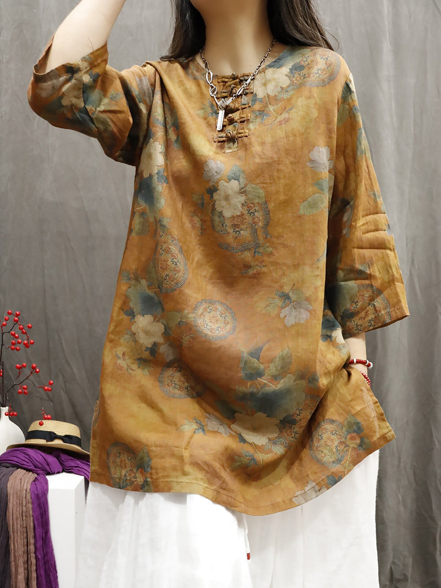 Camisa de verano para mujer, 100 % ramio, con cuello redondo y flores étnicas