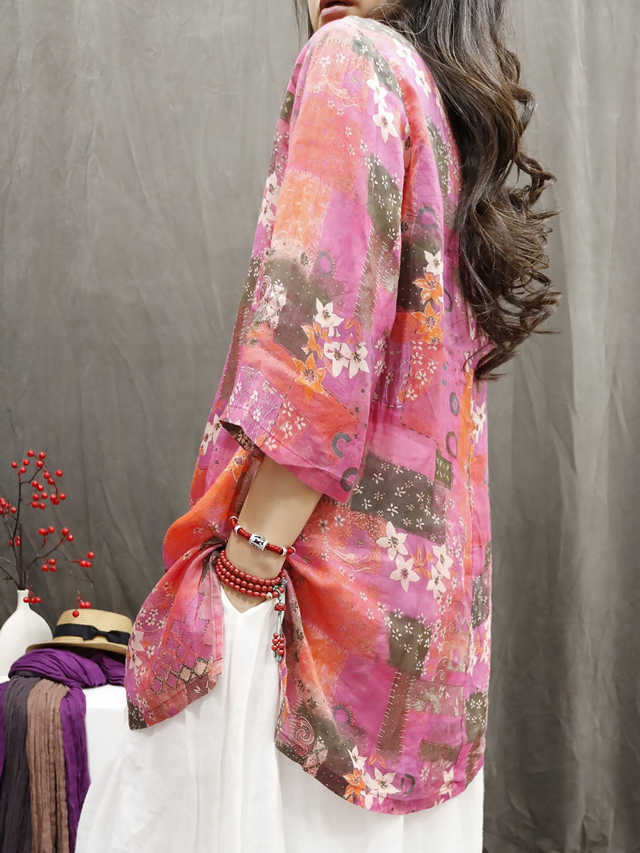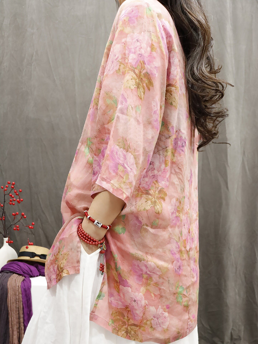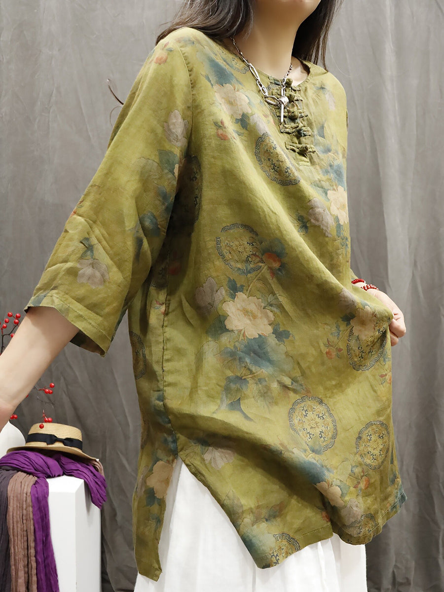 Camisa de verano para mujer, 100 % ramio, con cuello redondo y flores étnicas