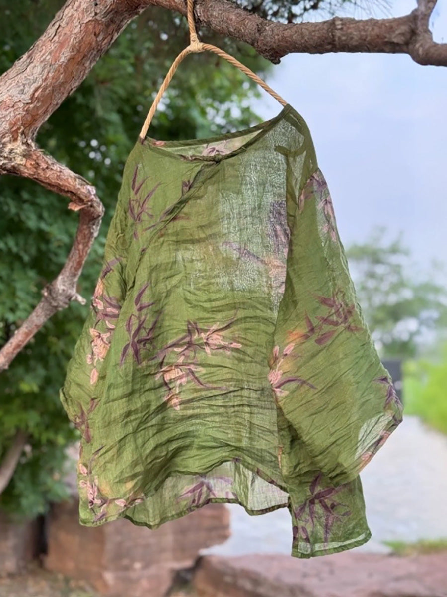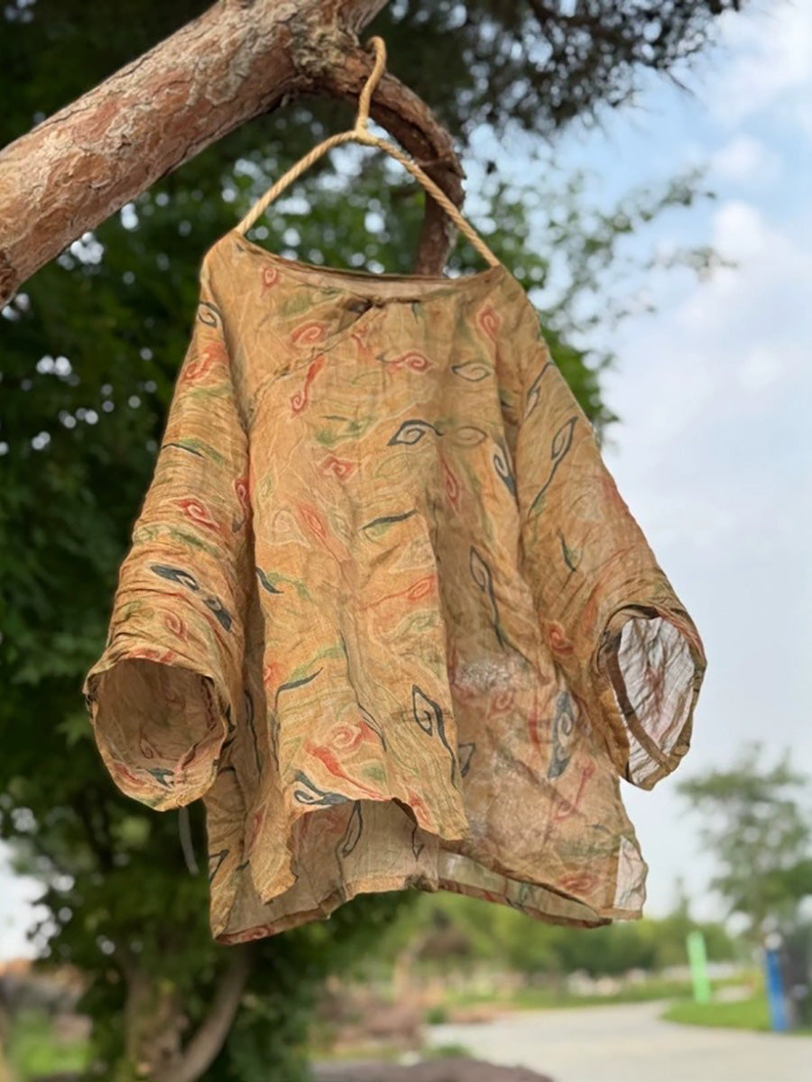 Camisa de verano con cuello redondo y estampado étnico de ramio para mujer