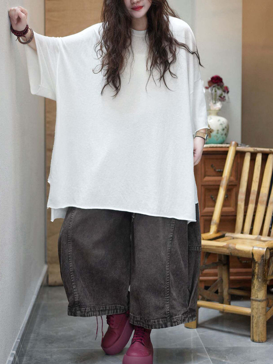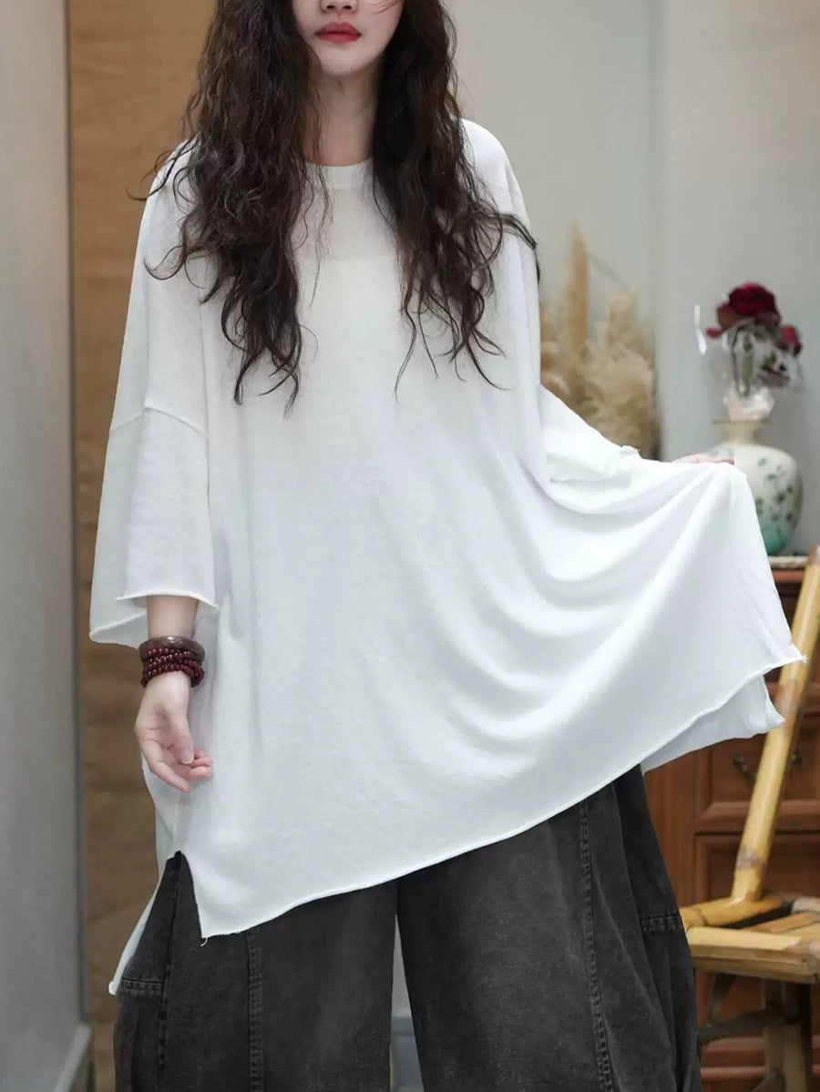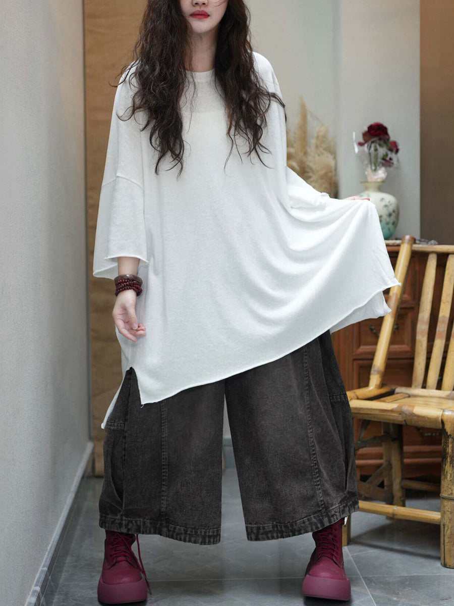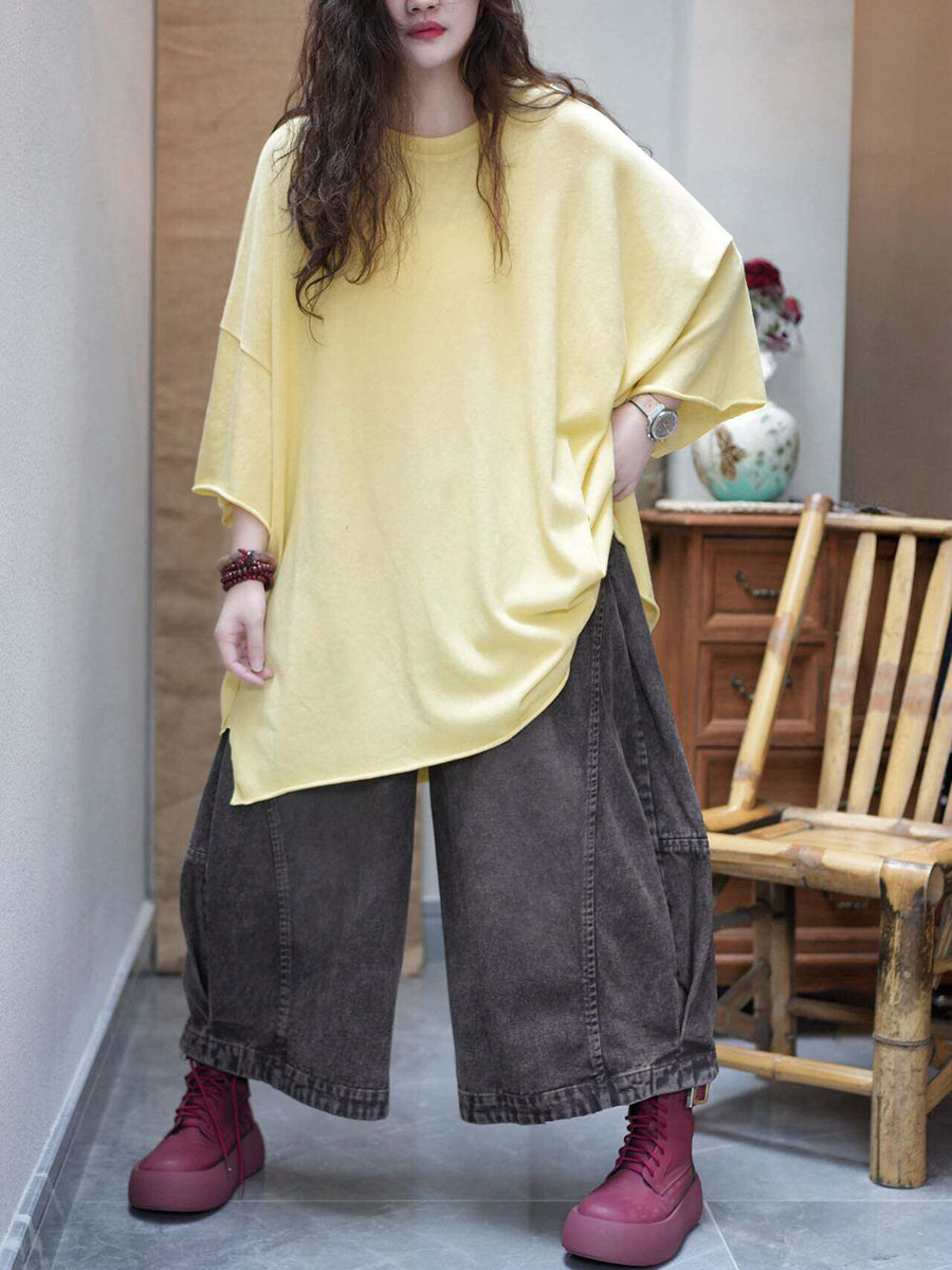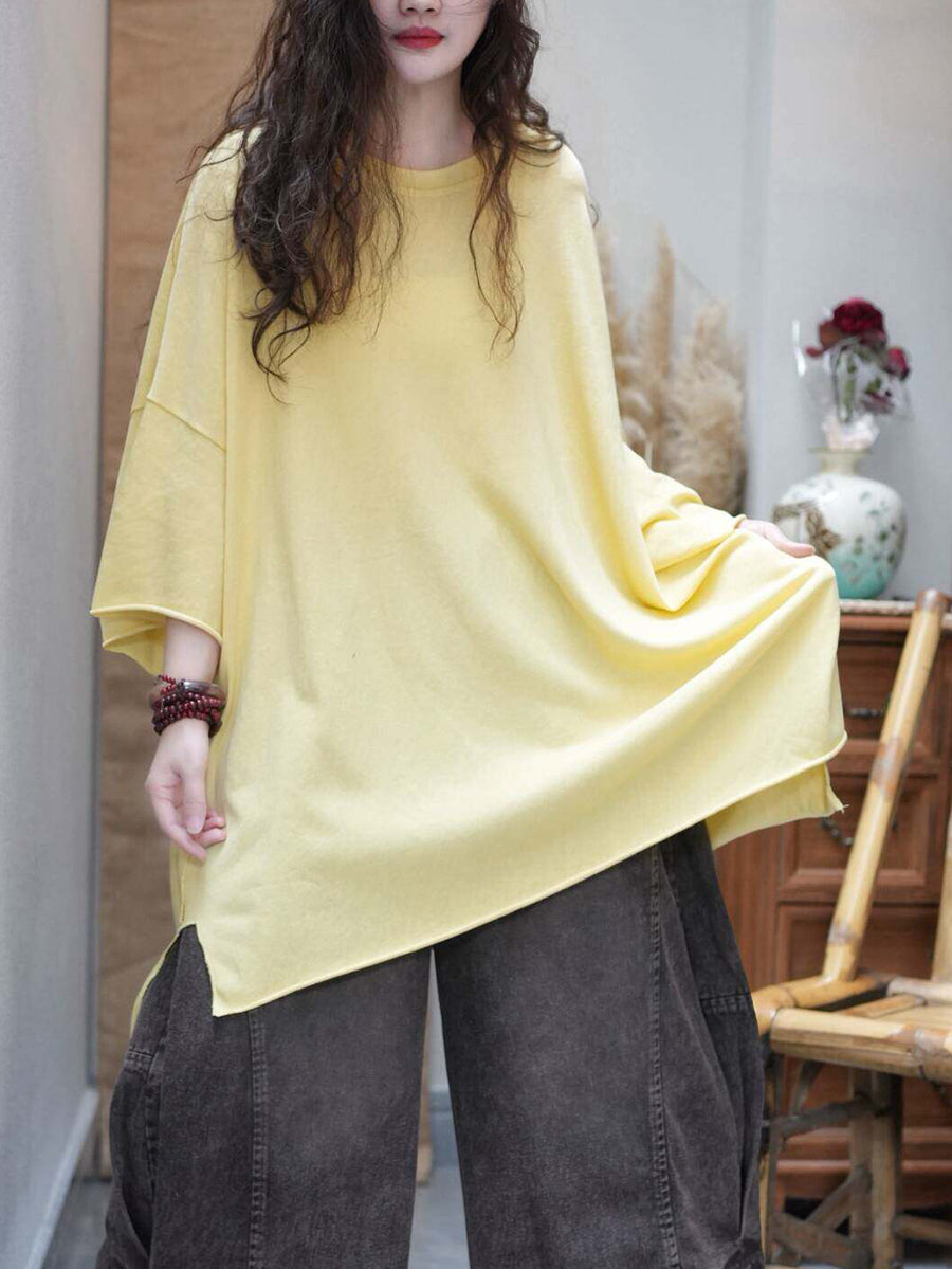 Camiseta de verano para mujer, color liso, cuello redondo, algodón, corte holgado.