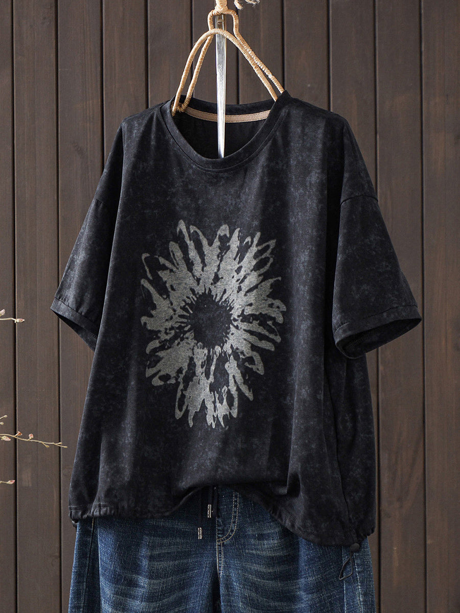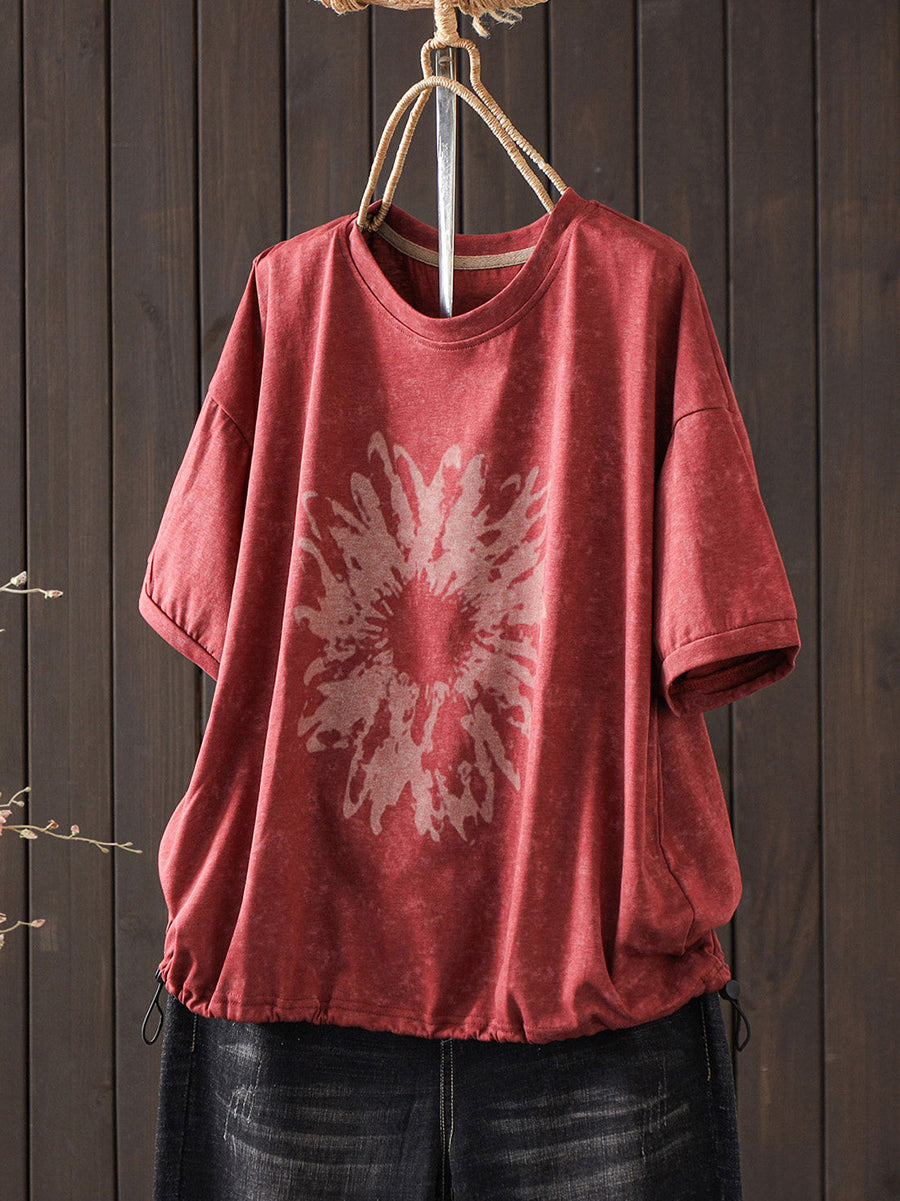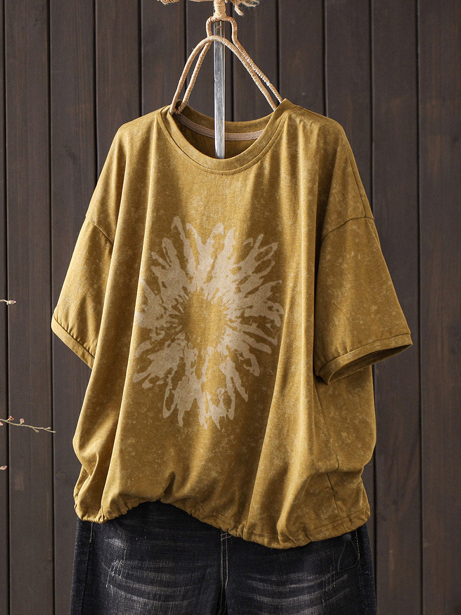 Camiseta de mujer de algodón con cuello redondo y estampado floral retro de verano