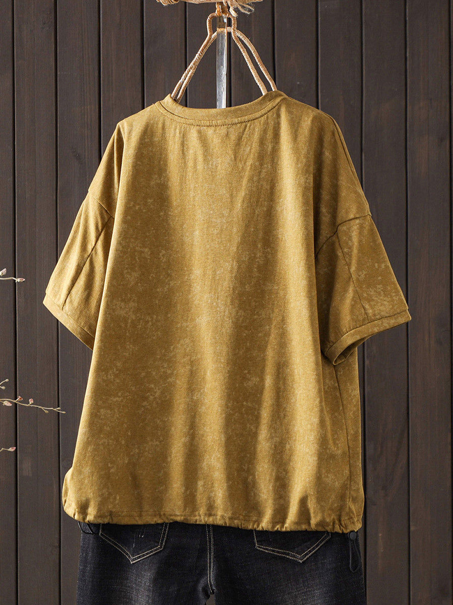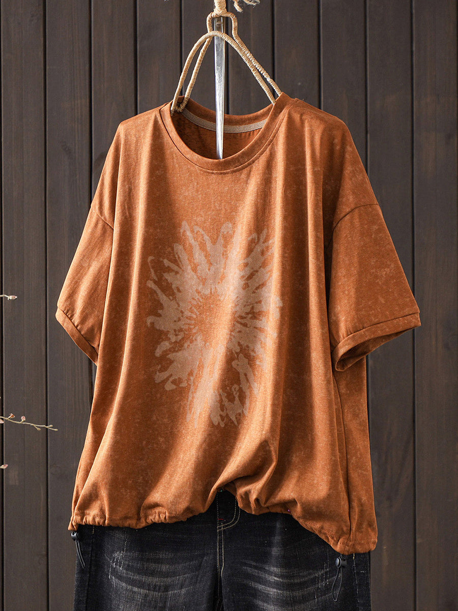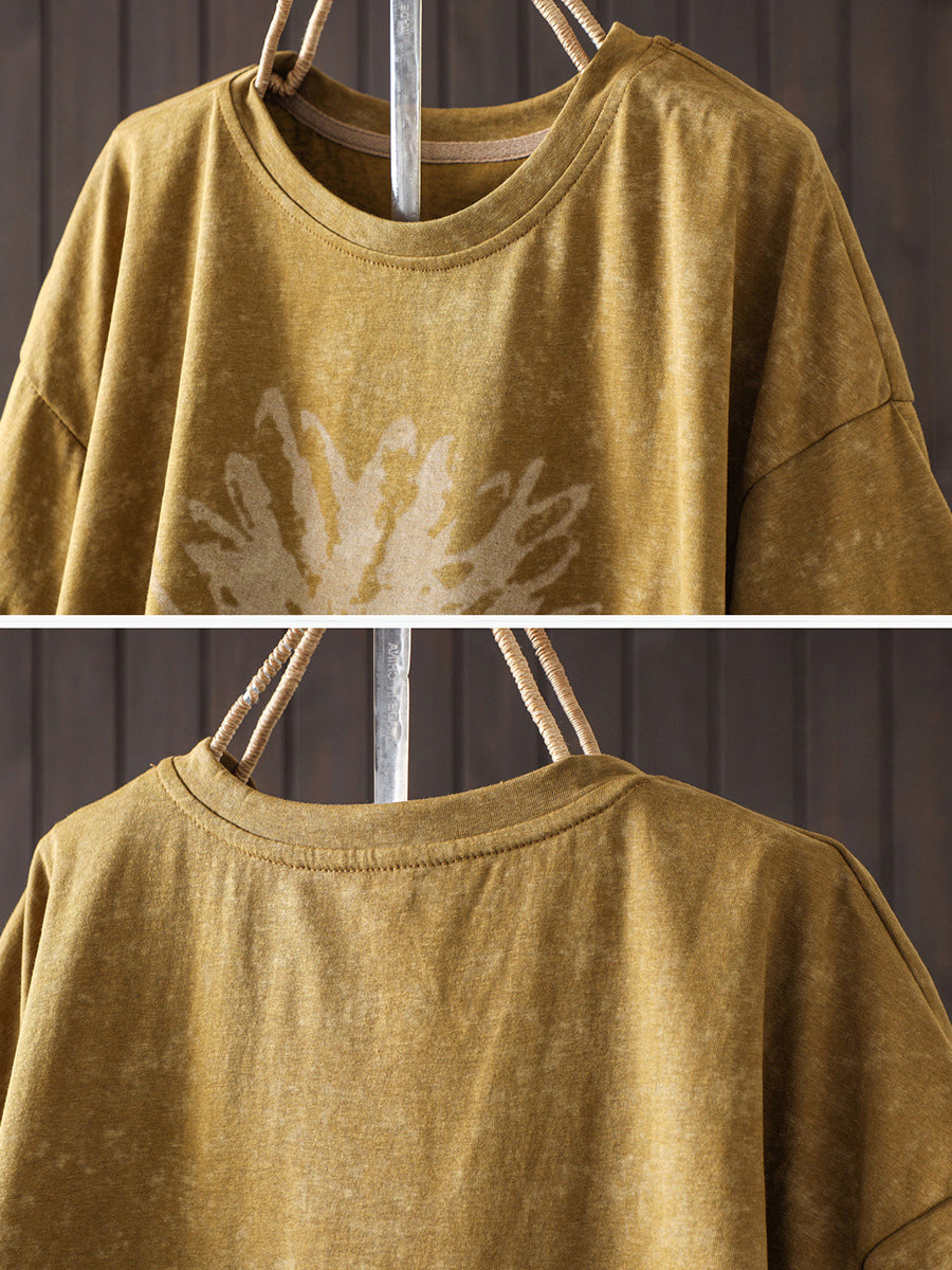 Camiseta de mujer de algodón con cuello redondo y estampado floral retro de verano