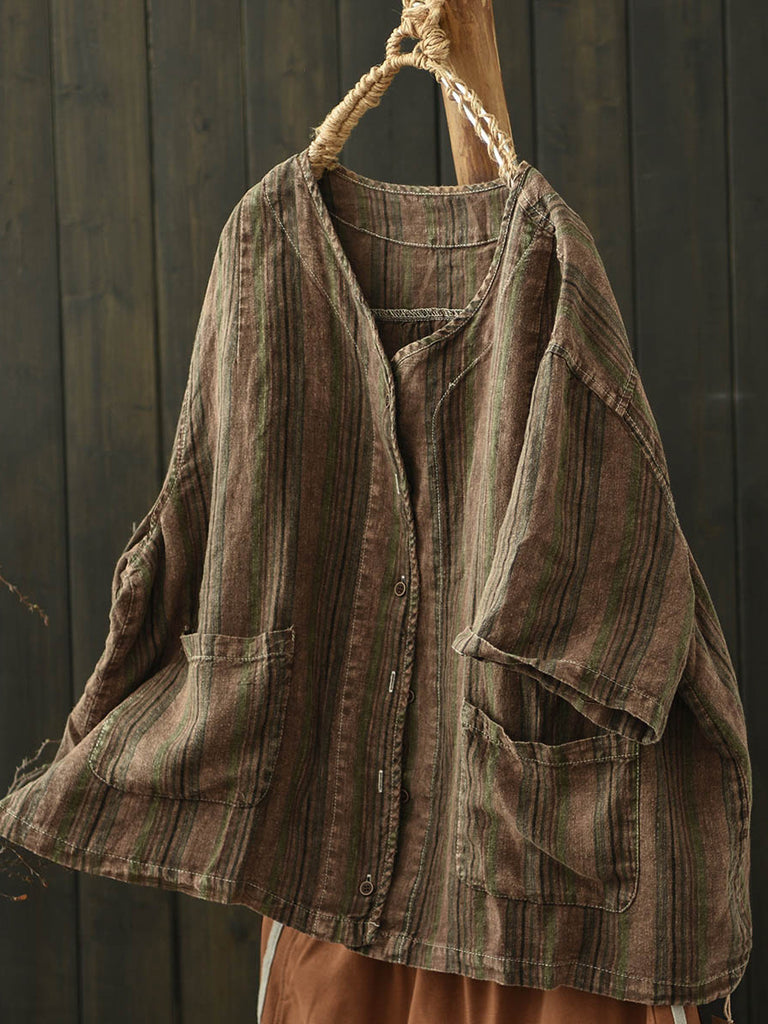 Camisa de lino con cuello en V y rayas retro de verano para mujer