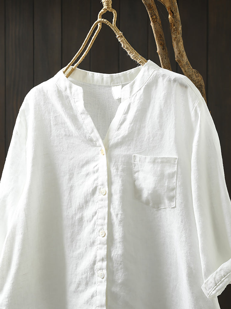 Camisa de verano para mujer, cuello en V, color puro, 100 % lino