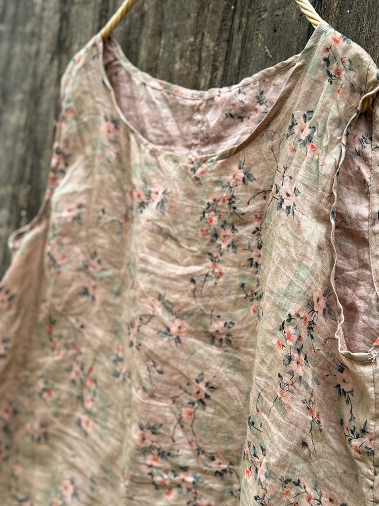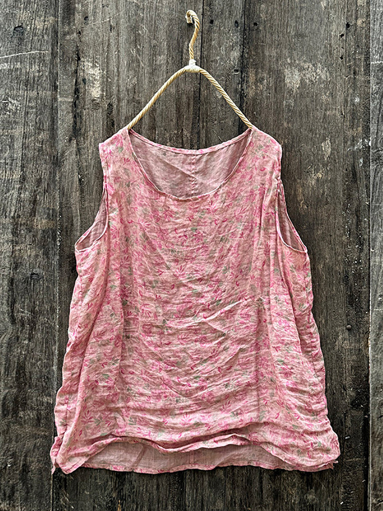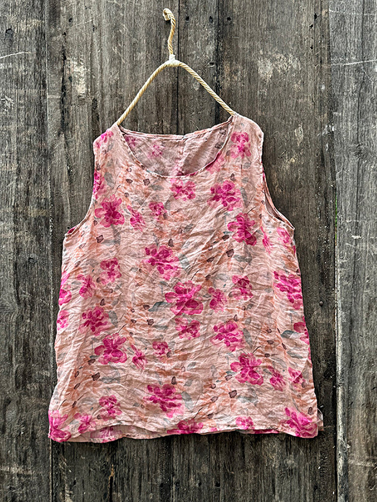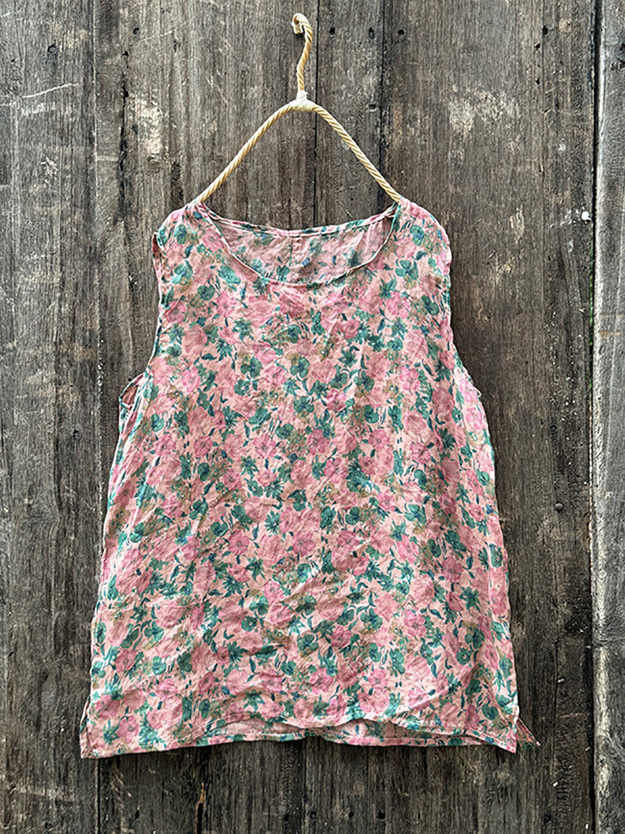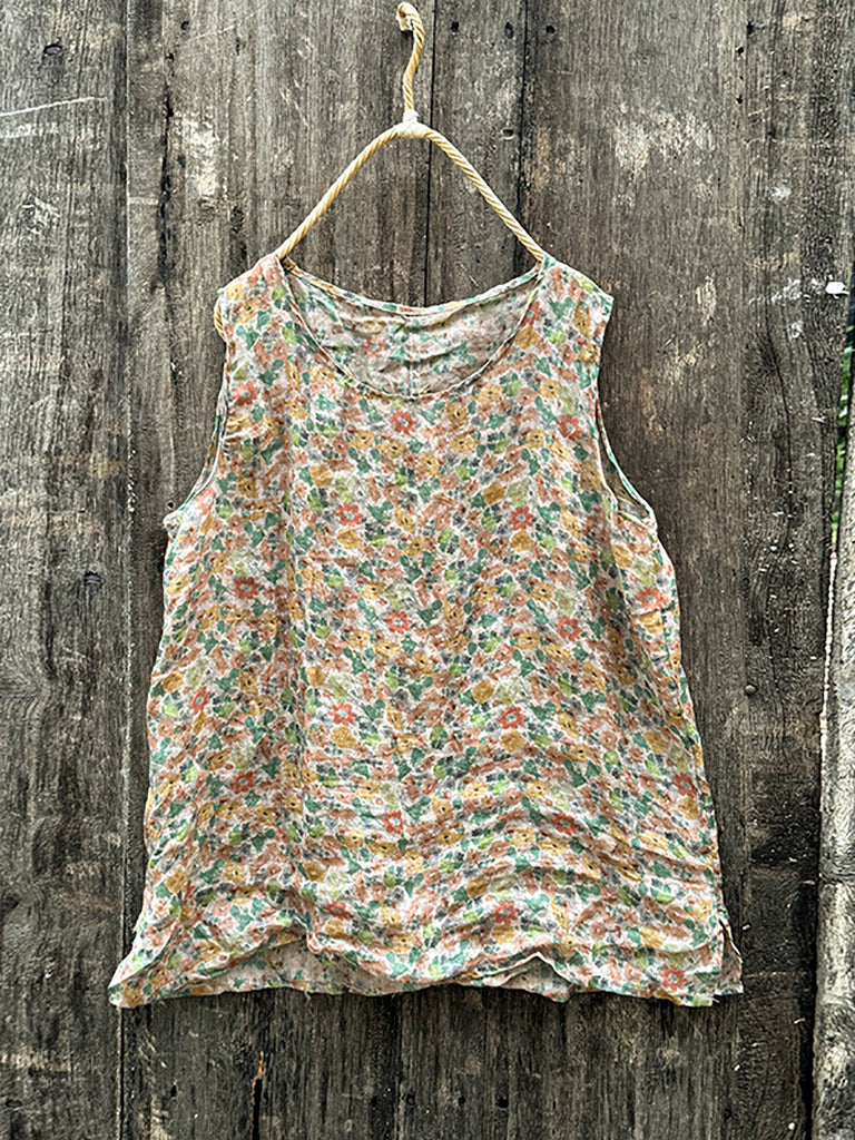 Chaleco de ramio con cuello redondo y estampado floral vintage de verano para mujer