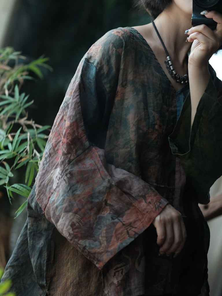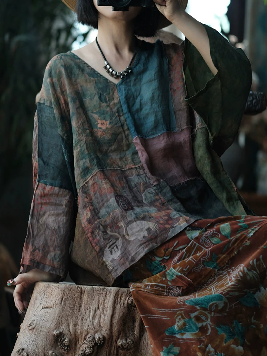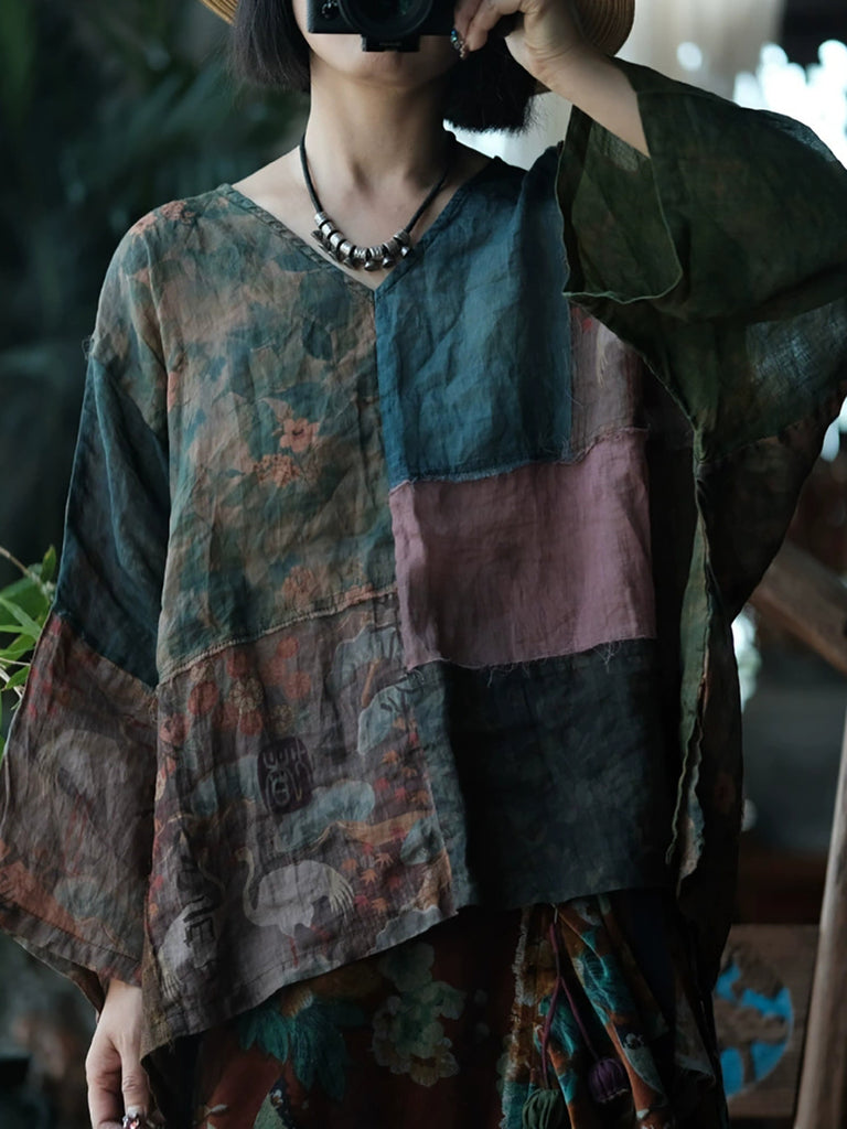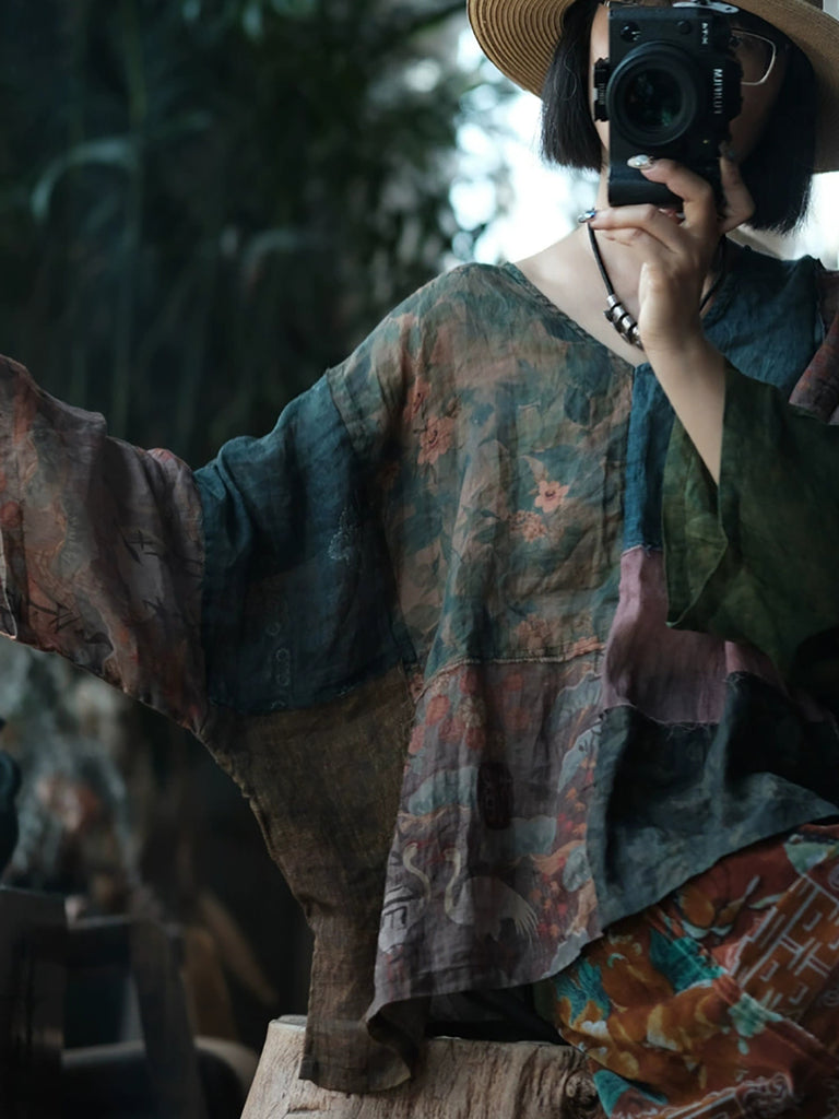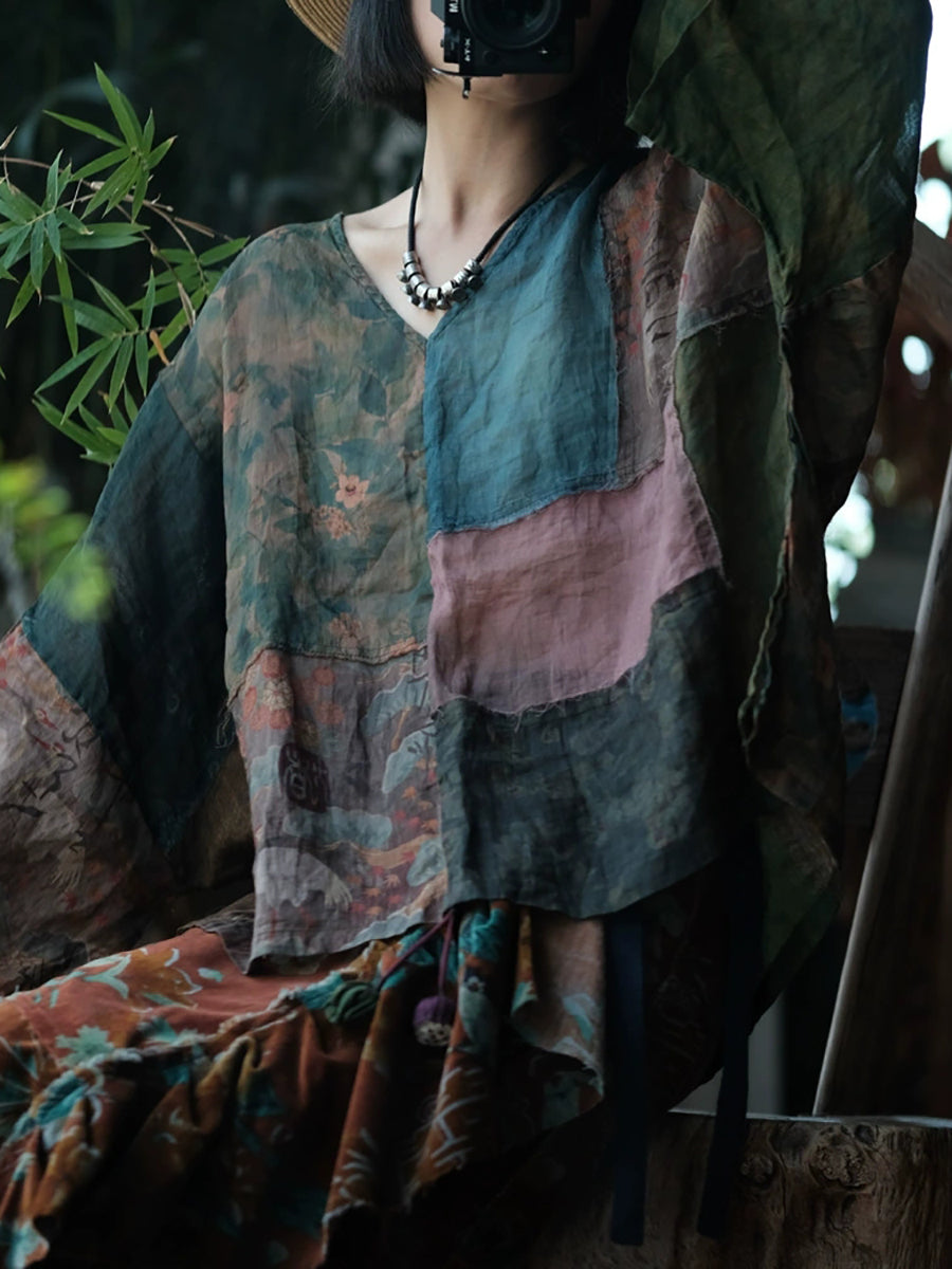 Camisa de ramio con patchwork de flores vintage de verano para mujer
