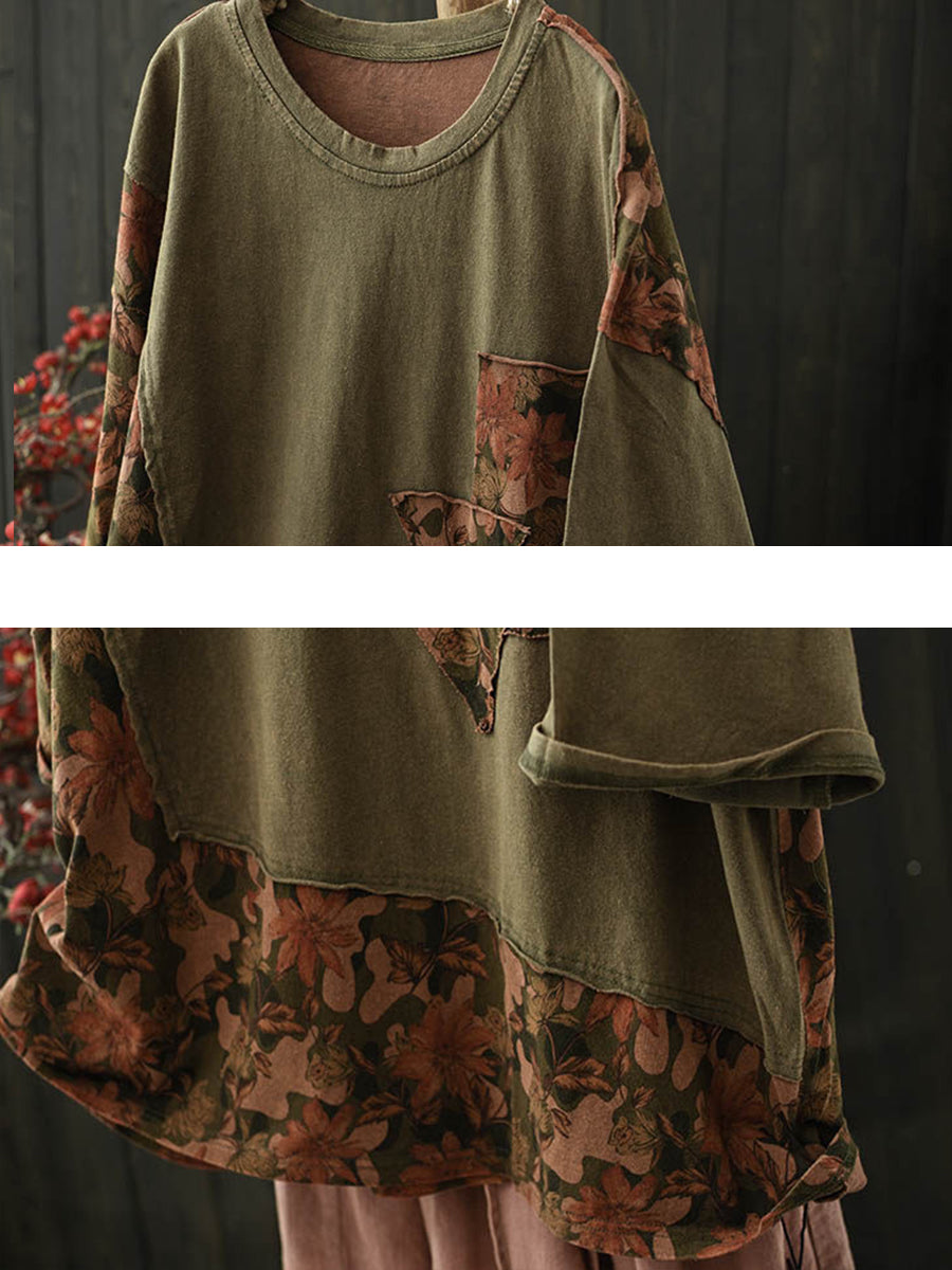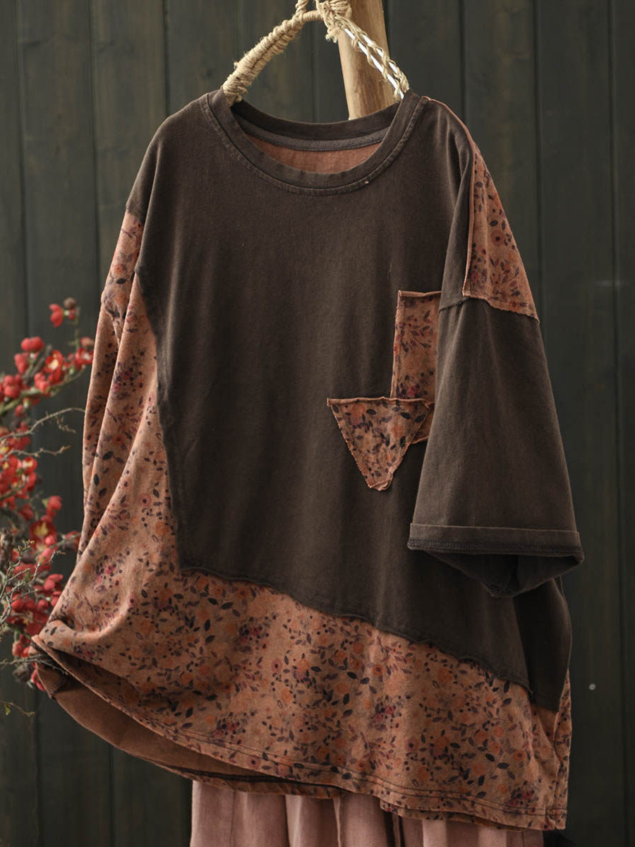 Camisa vintage de verano con cuello redondo y estampado floral para mujer