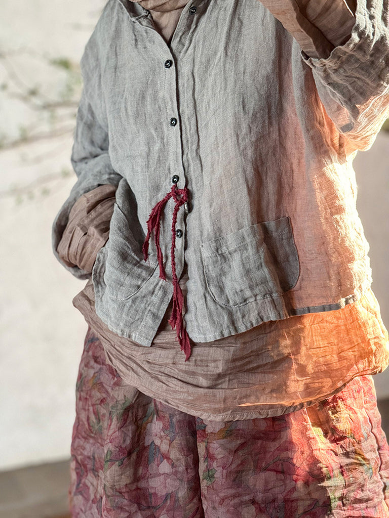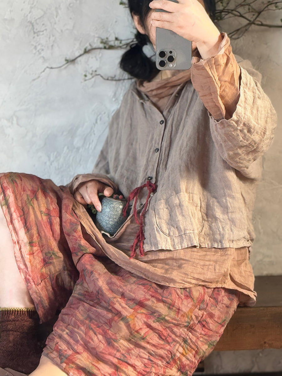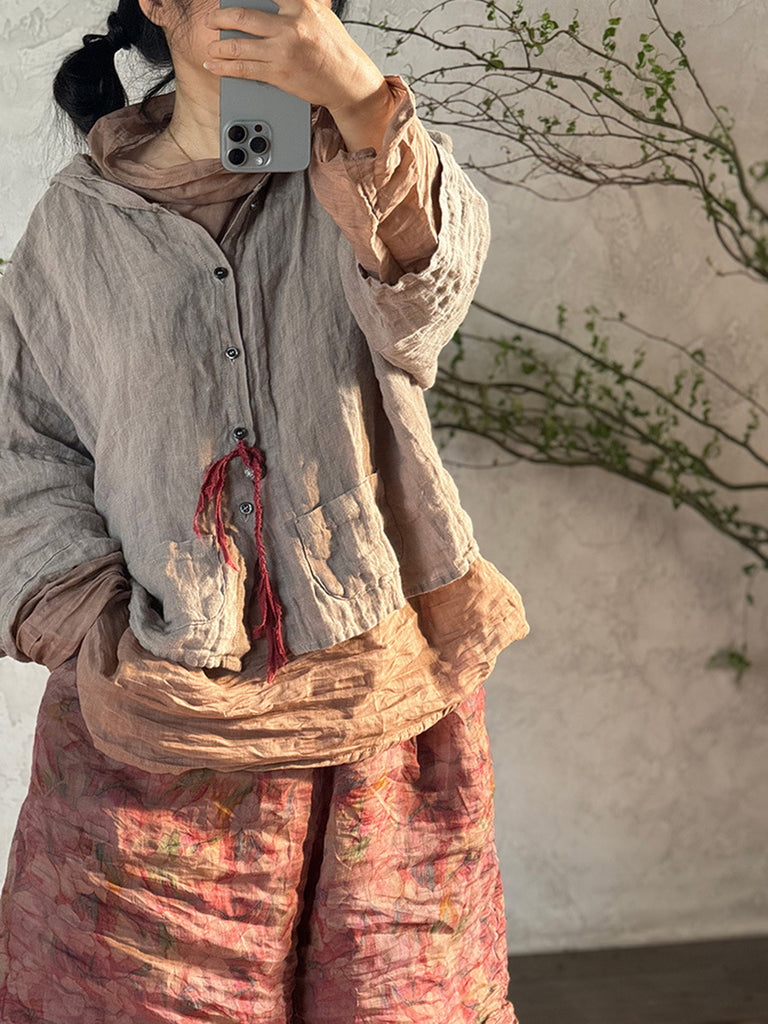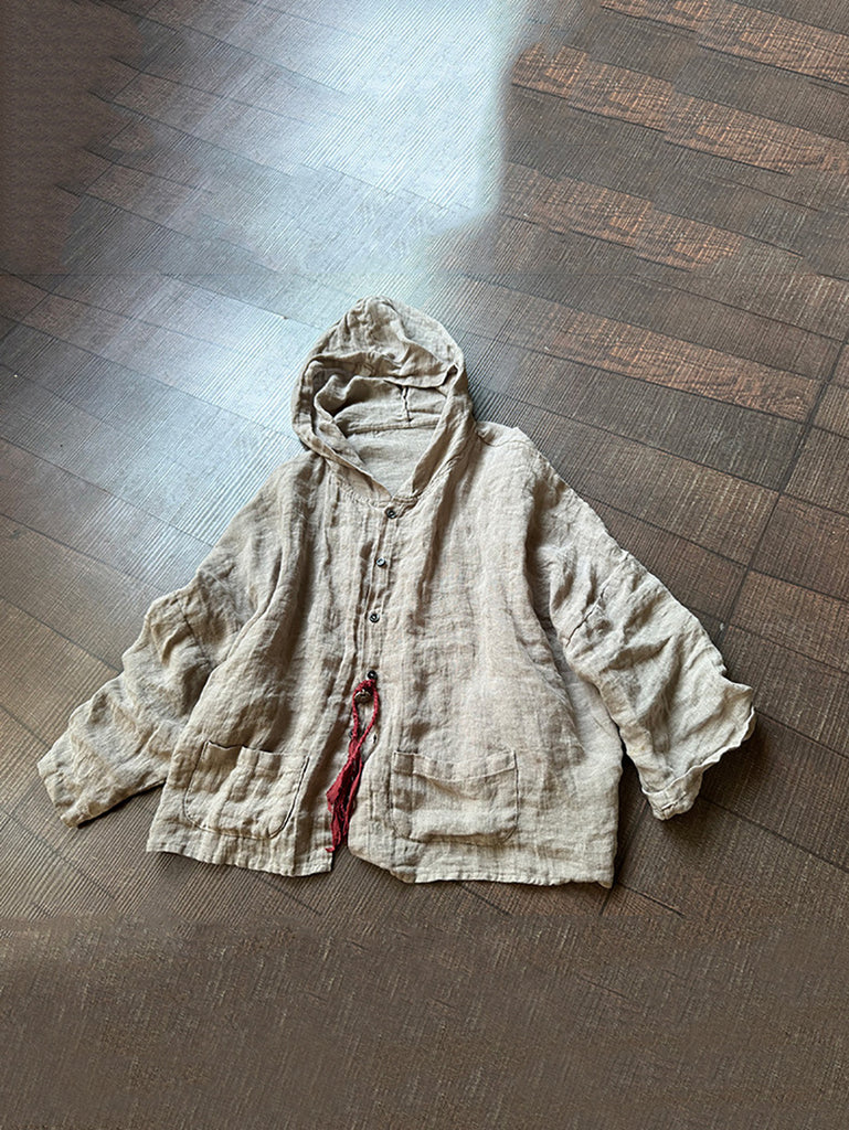 Camisa con capucha y botones de lino vintage de verano para mujer de talla grande
