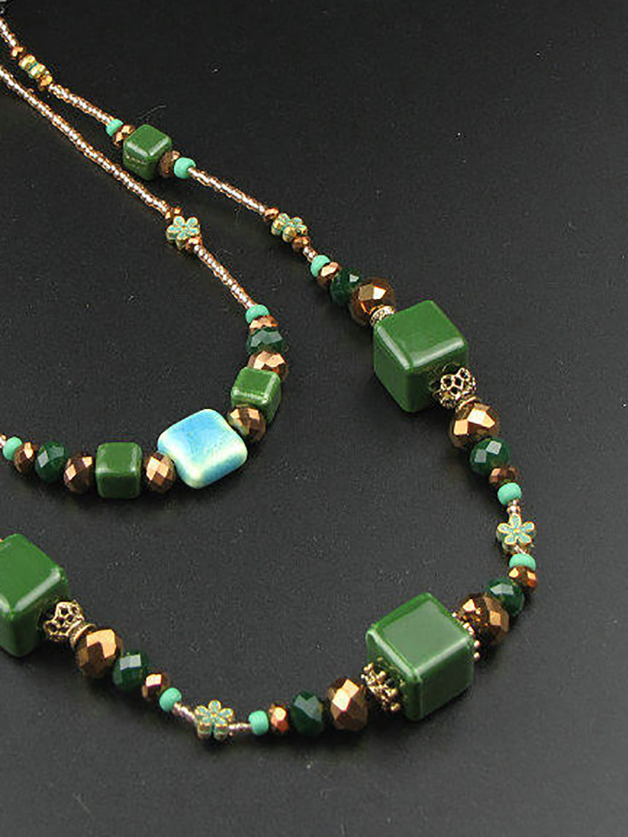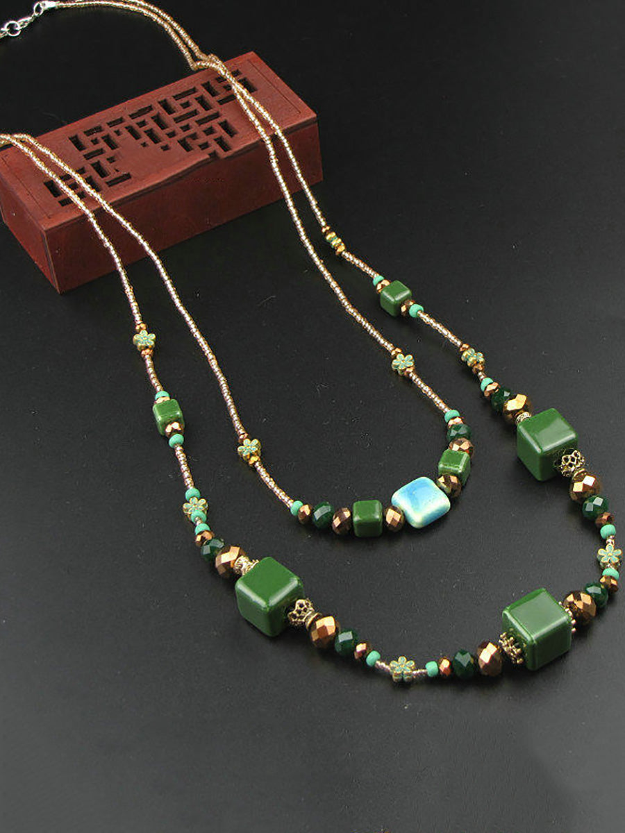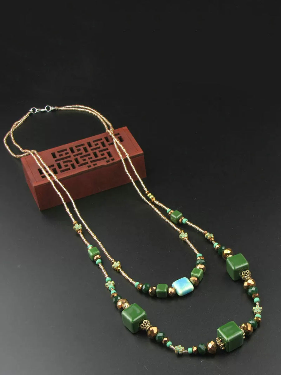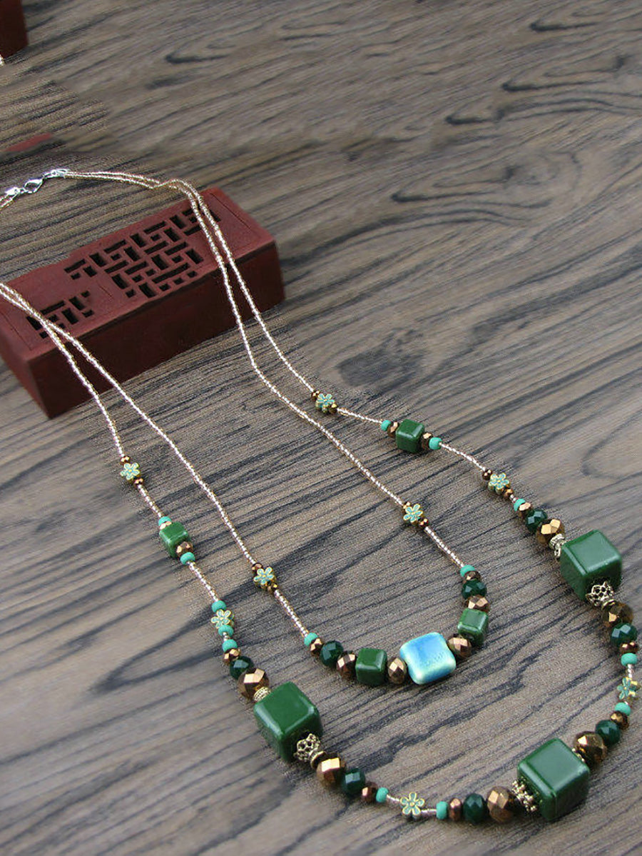 Collar vintage de dos capas con cuentas de cerámica verde para mujer