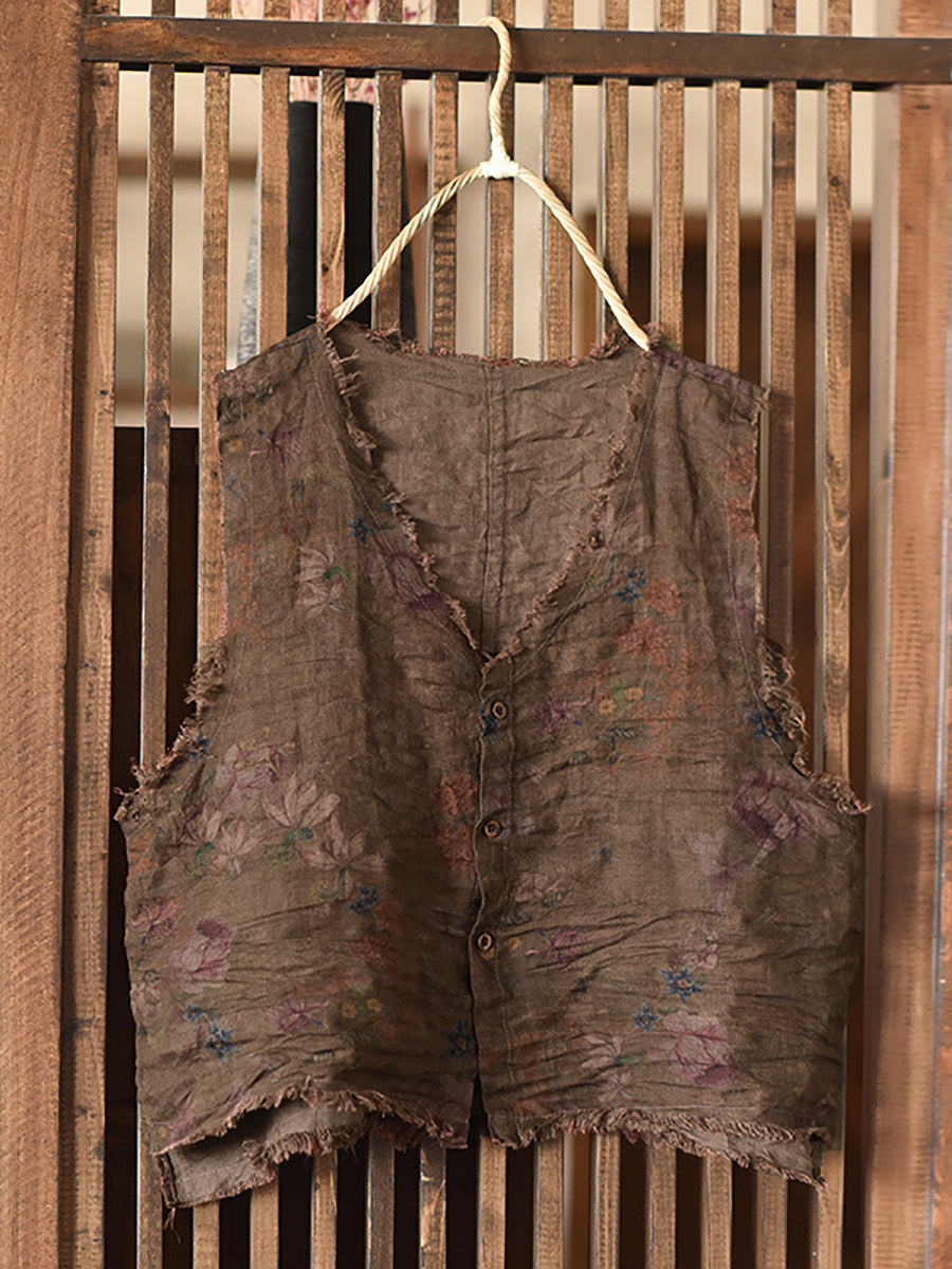 Chaleco de lino con bordes sin rematar, abotonado y estampado floral vintage para mujer