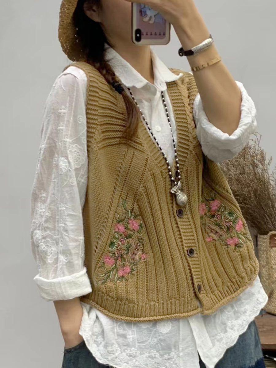 Chaleco de punto con cuello en V y bordado floral vintage para mujer