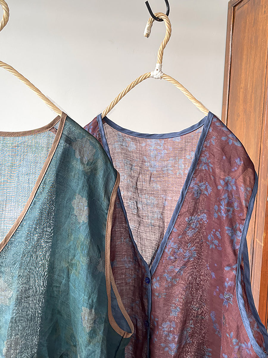 Este chaleco está confeccionado en 100 % ramio y presenta un estampado floral, cuello en V y estilo vintage. Es perfecto para las temporadas de primavera y verano.