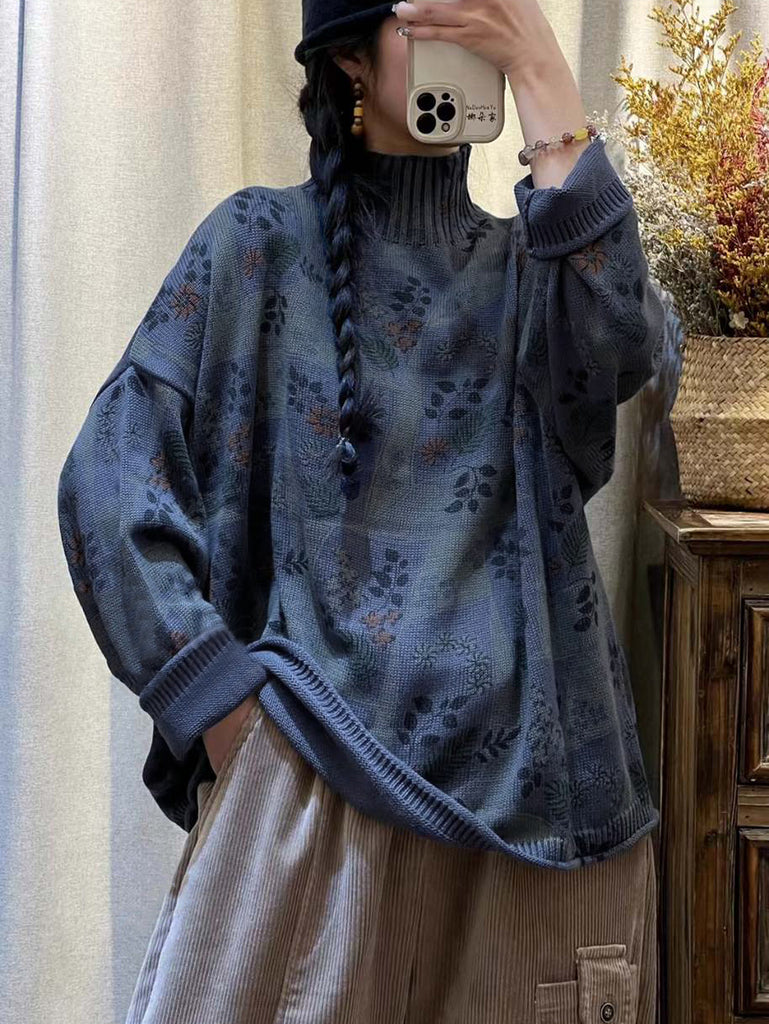 Suéter de cuello alto de punto con flores vintage para mujer