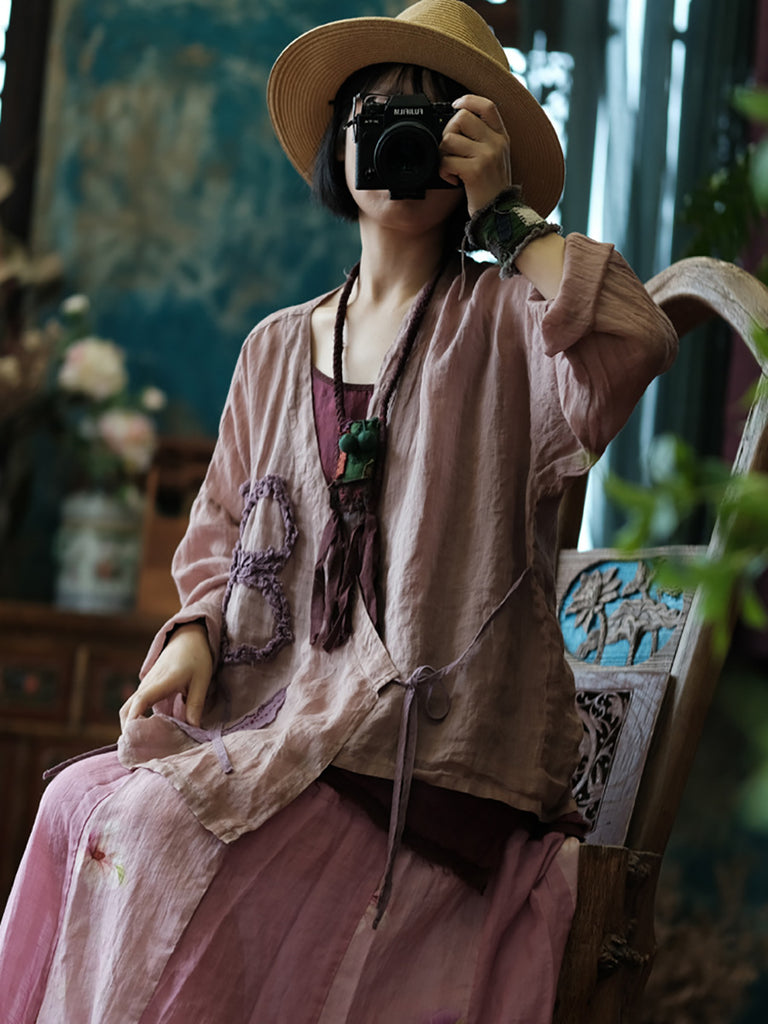 Esta camisa vintage de verano con tirantes de ramio, confeccionada por expertos con tejido 100 % ramio y adornada con un precioso estampado de flores, es una prenda imprescindible para cualquier mujer a la moda. Con un cuello en V clásico y mangas raglán amplias, esta camisa irradia una elegancia atemporal que es perfecta tanto para la primavera como para el verano.
