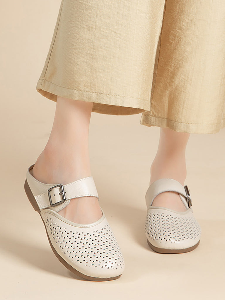 Zapatillas vintage de piel auténtica con tacón bajo para mujer