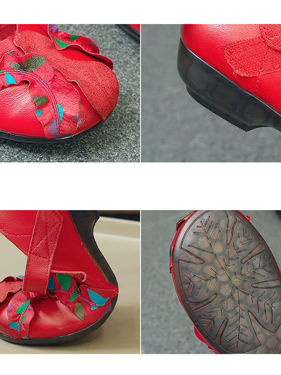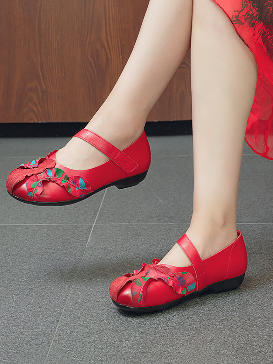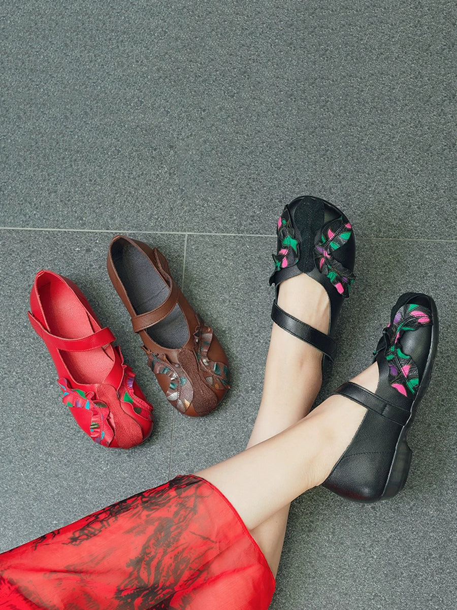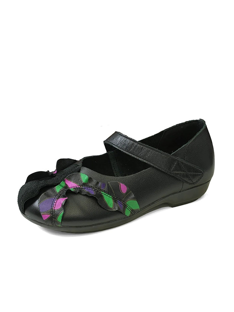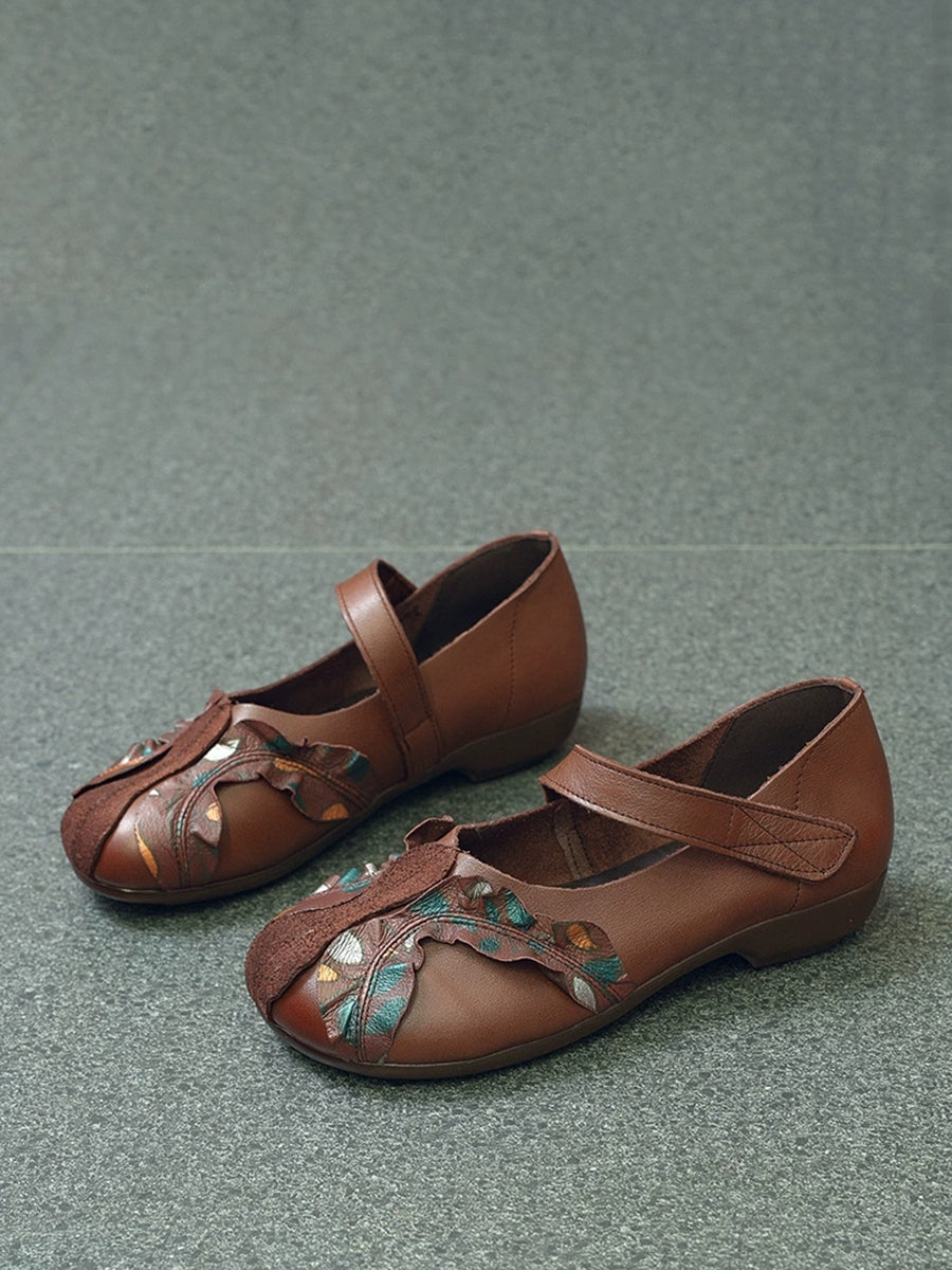 Zapatos de tacón bajo con empalme de piel auténtica vintage para mujer