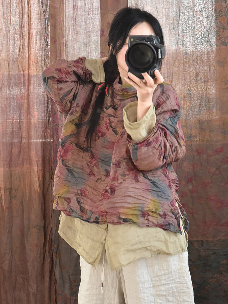 Esta camisa de alta calidad está confeccionada en tejido de ramio y presenta un cuello clásico y mangas raglán largas que le dan un toque vintage. El estampado floral atemporal le aporta un toque de elegancia, lo que la hace perfecta para usar en primavera u otoño.