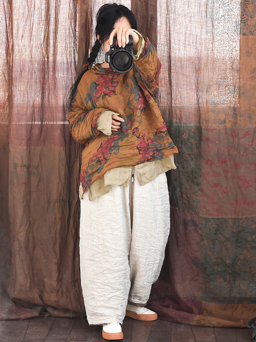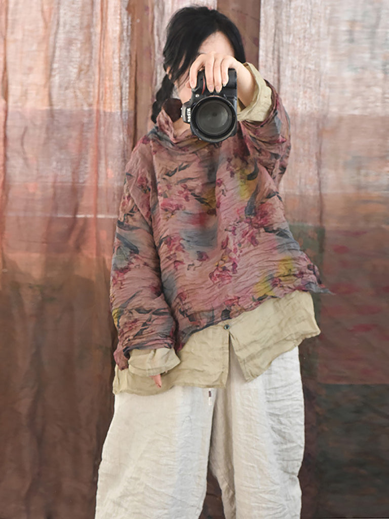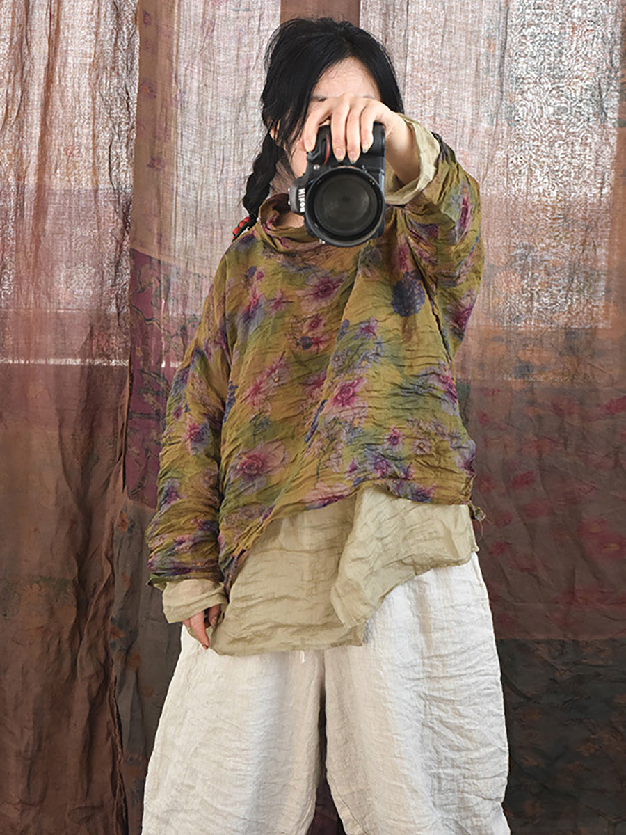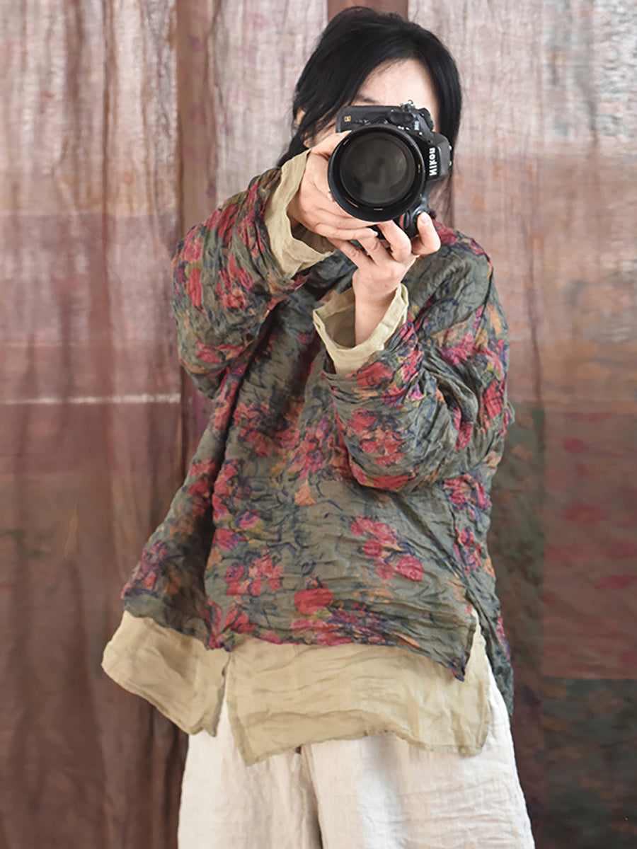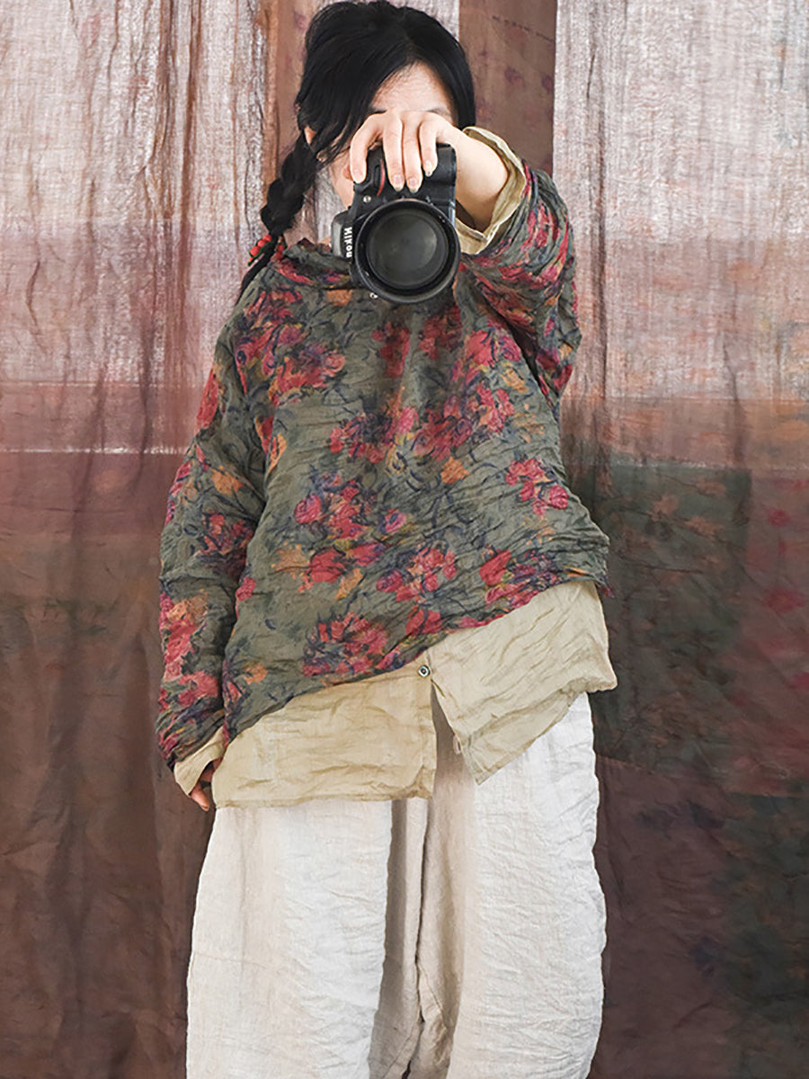 Camisa de ramio con cuello redondo floral vintage de primavera para mujer