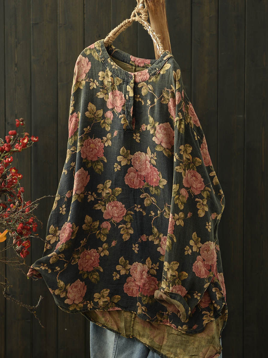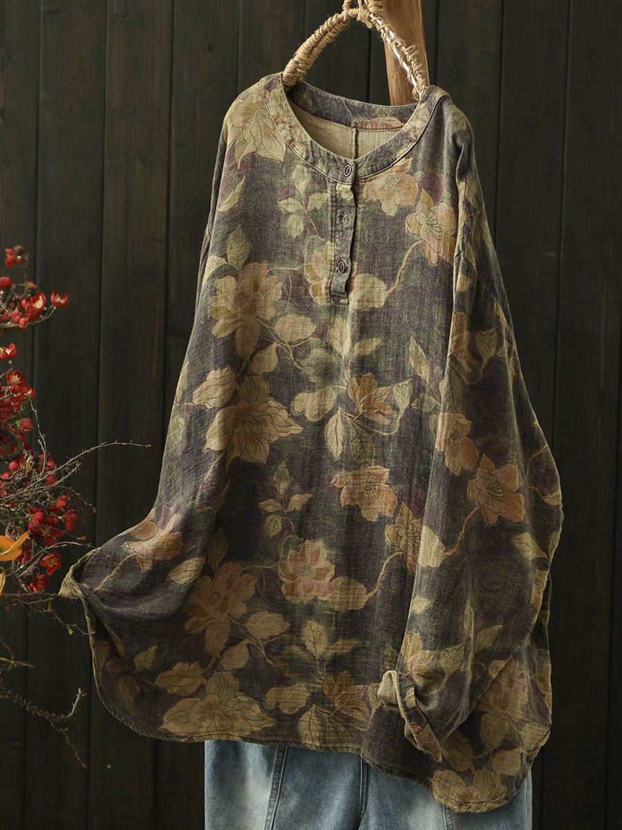 Blusa vintage de algodón con cuello redondo y flores de primavera para mujer