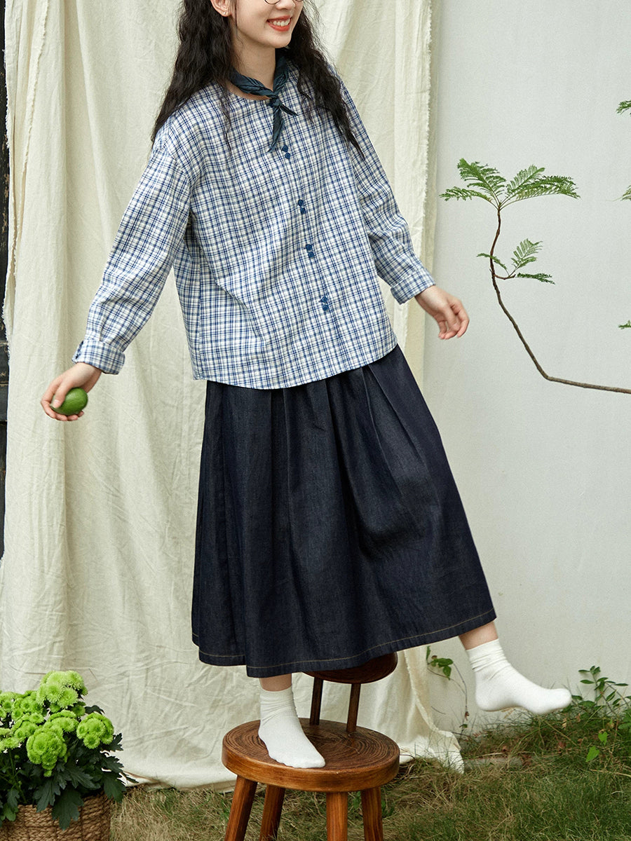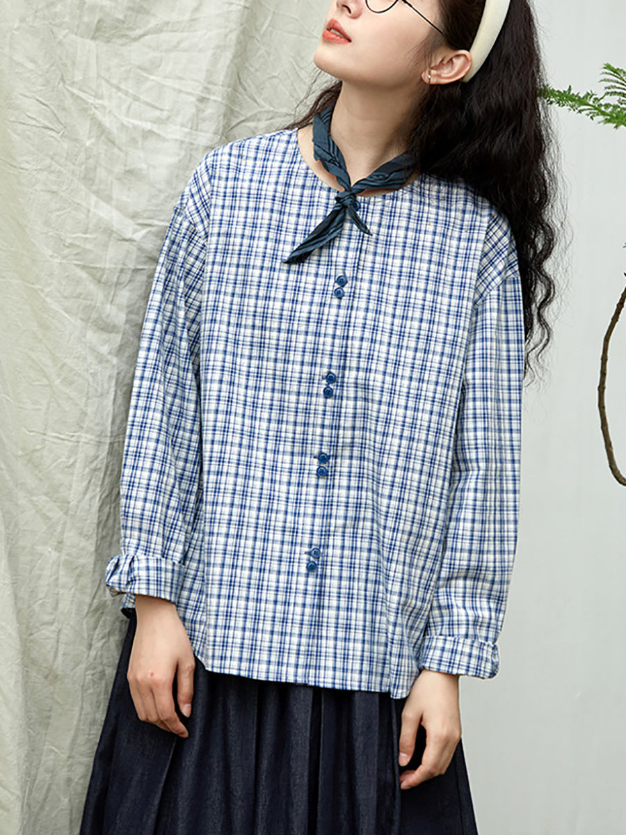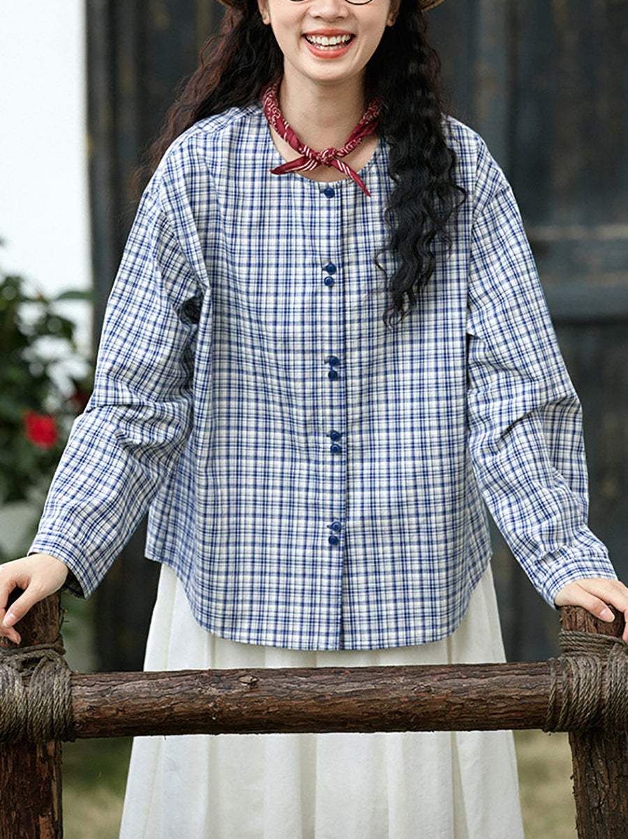 Camisa vintage de cuadros escoceses de primavera para mujer, cuello redondo, 100 % algodón
