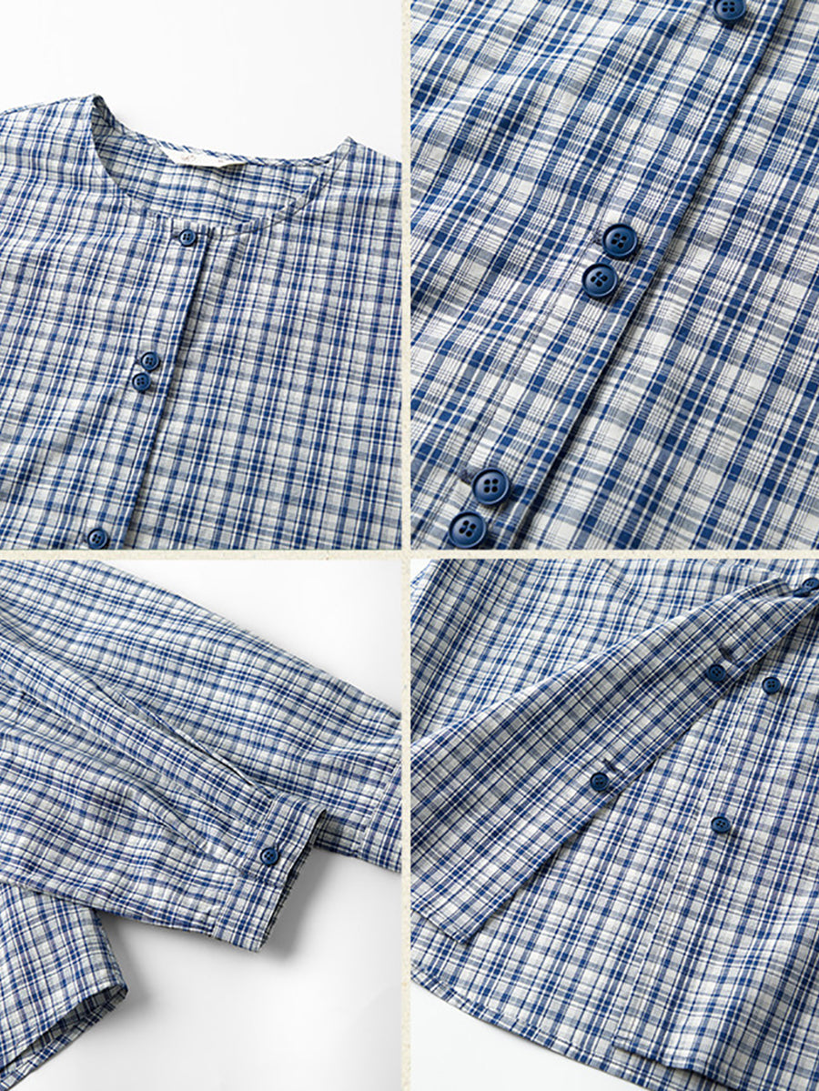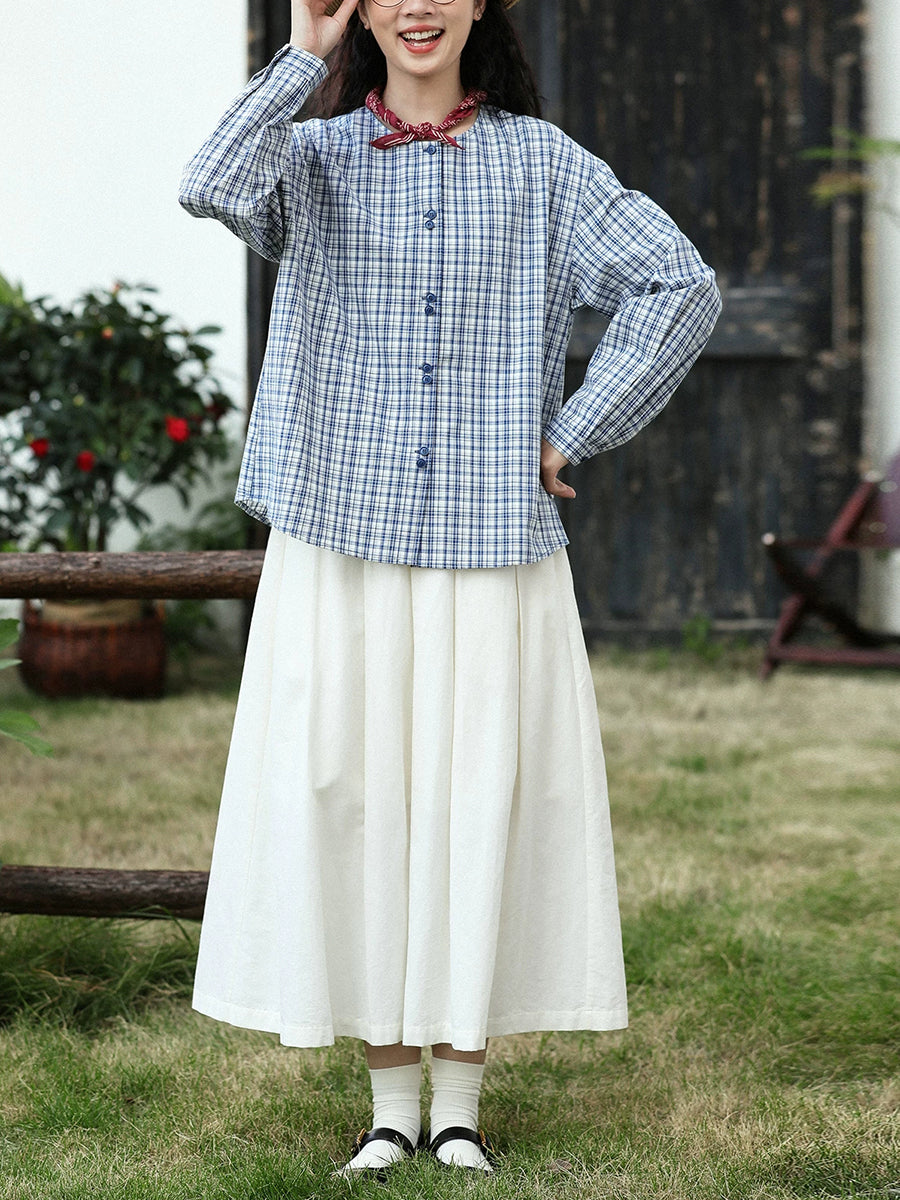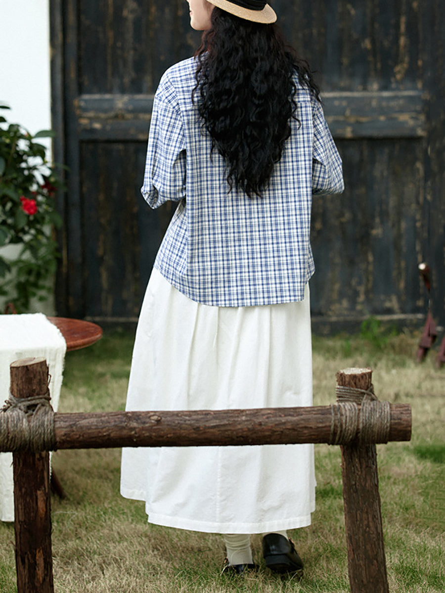 Camisa vintage de cuadros escoceses de primavera para mujer, cuello redondo, 100 % algodón