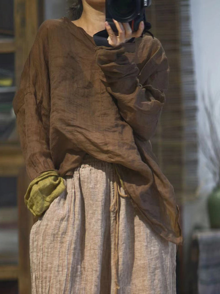 Esta blusa está confeccionada en ramio y presenta un patrón de rayas, cuello en V, mangas raglán largas y un estilo retro perfecto para las estaciones de primavera y otoño. Para un look vintage, esta blusa suelta es una opción ideal.