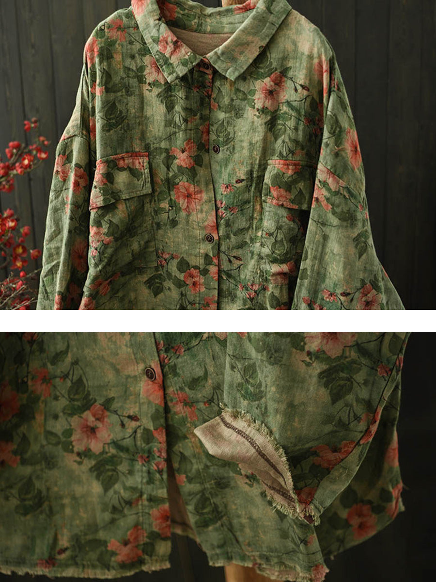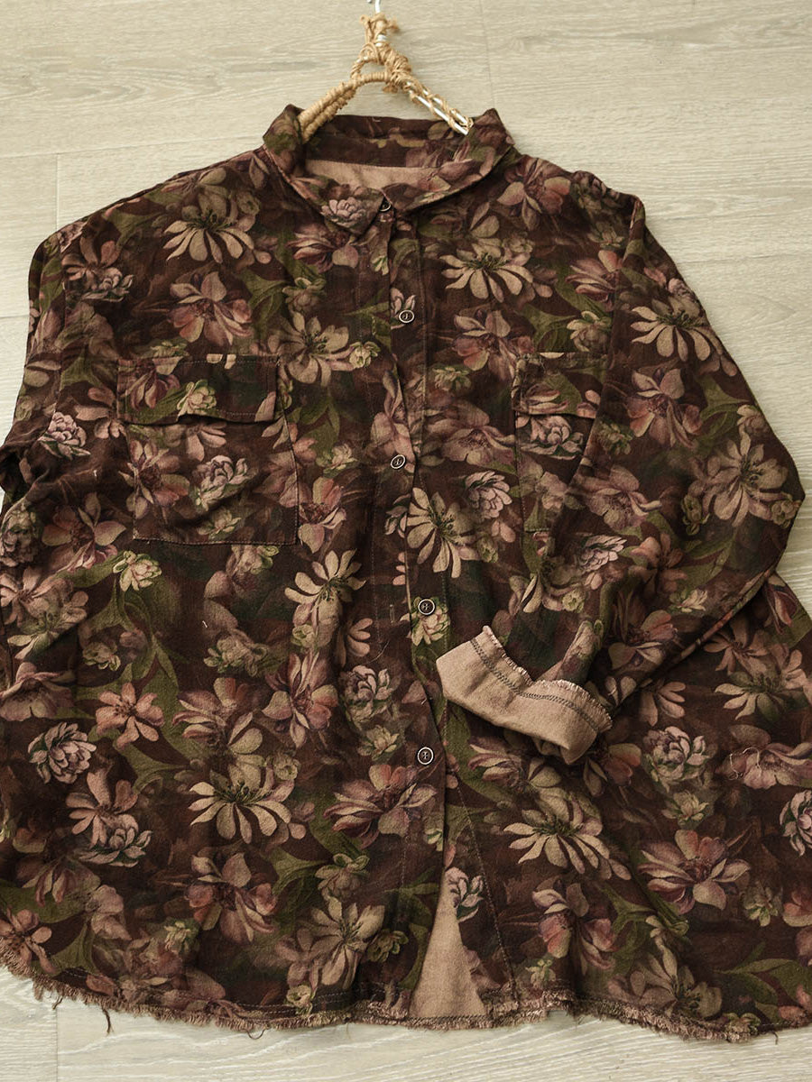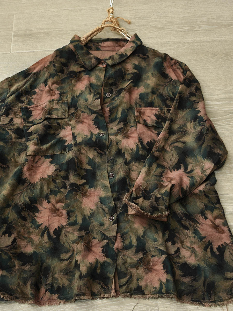 Camisa de algodón con cuello vuelto y estampado floral artístico de invierno para mujer