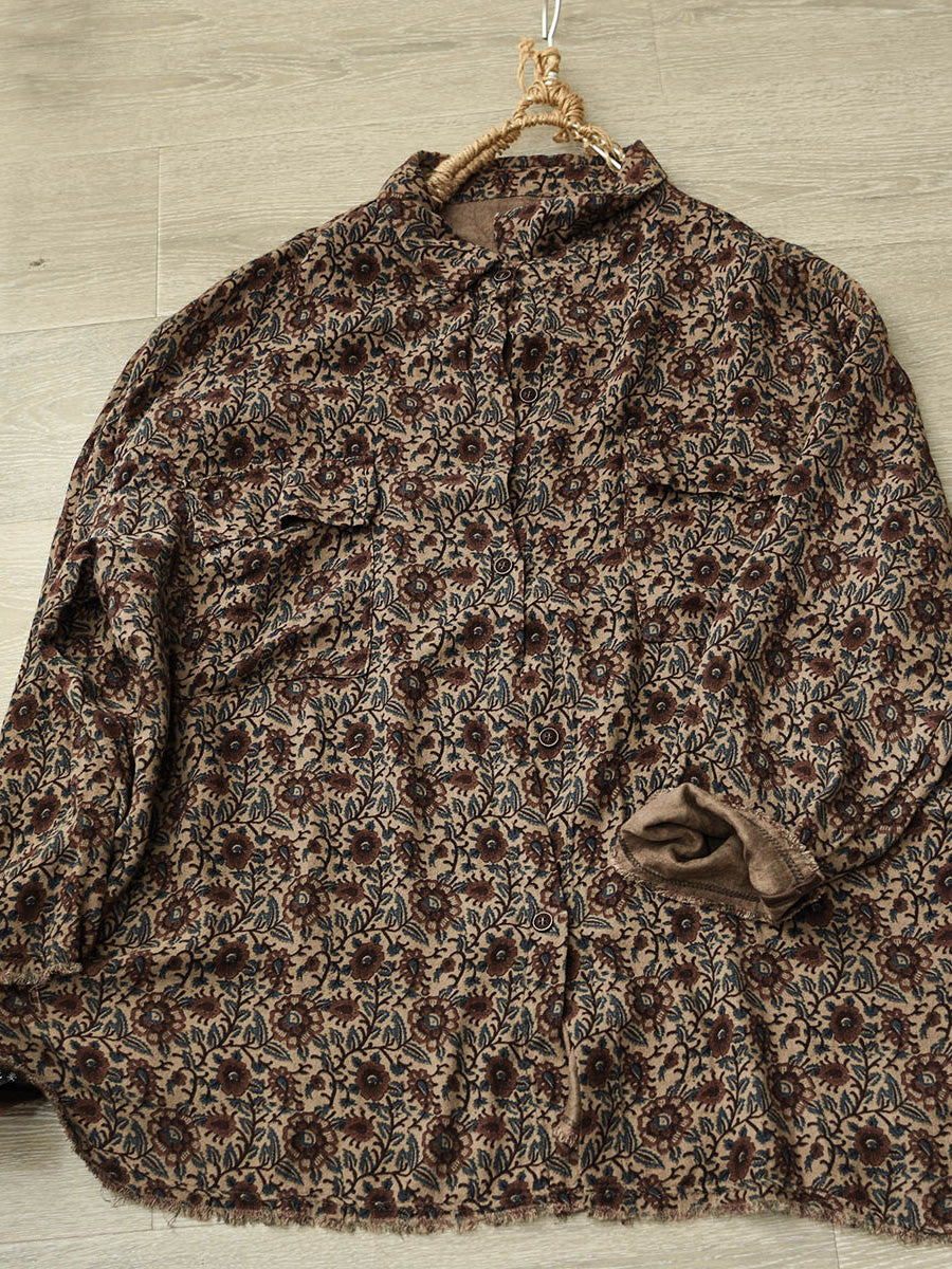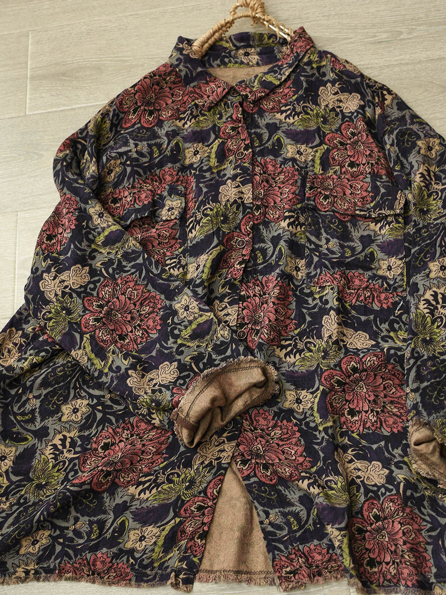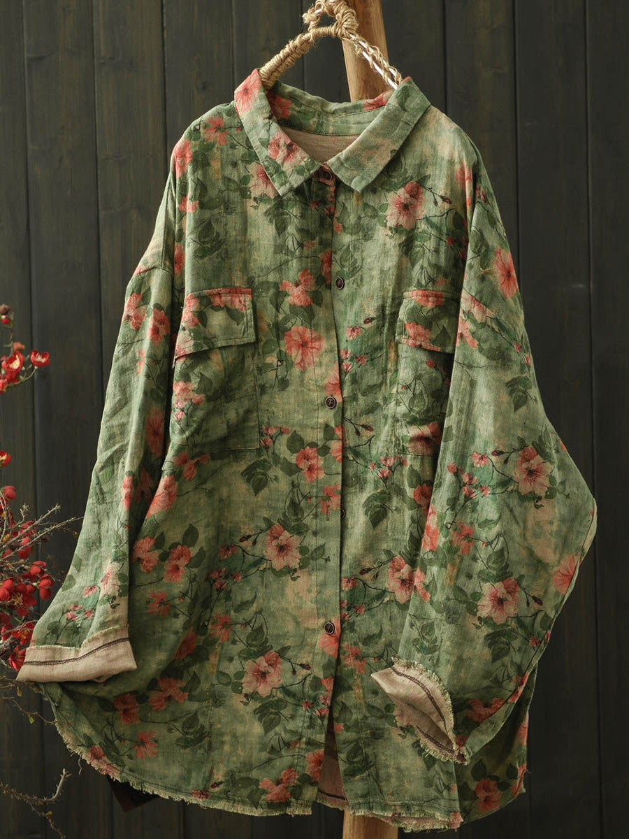 Camisa de algodón con cuello vuelto y estampado floral artístico de invierno para mujer