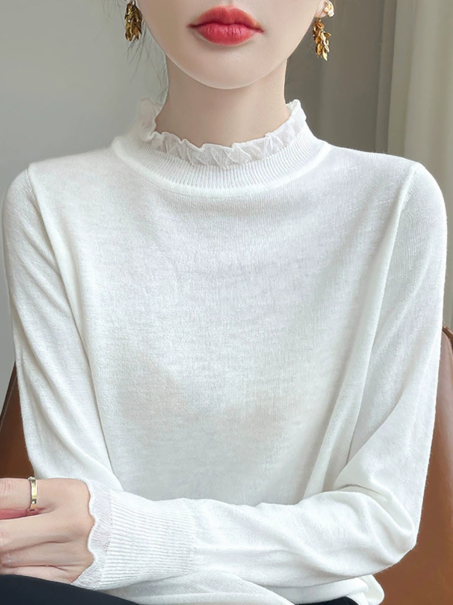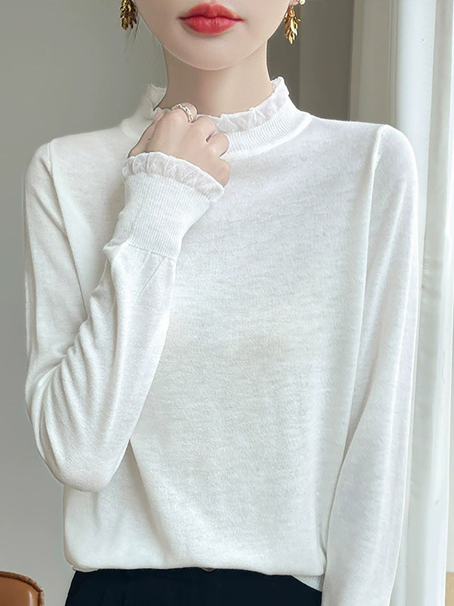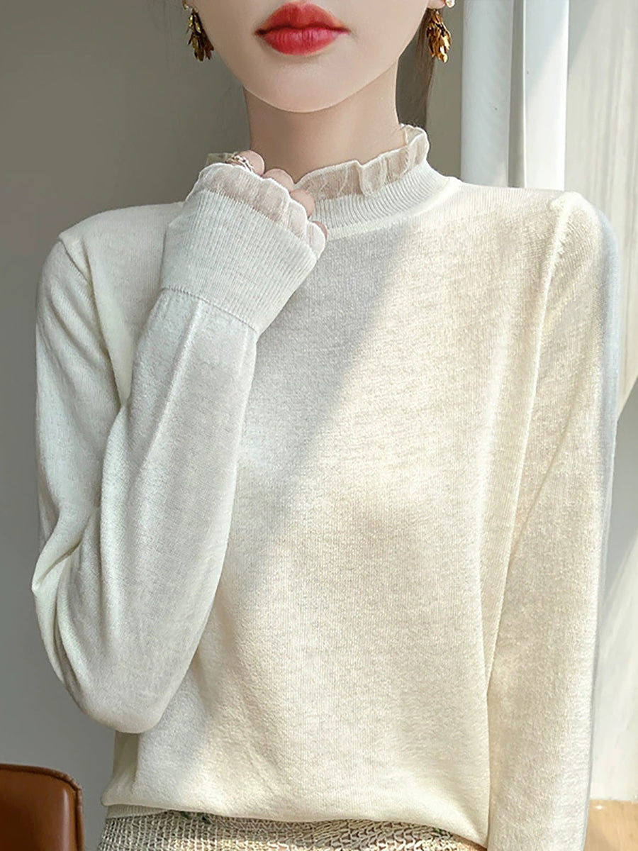 Suéter de invierno con cuello de encaje de color puro y artístico para mujer