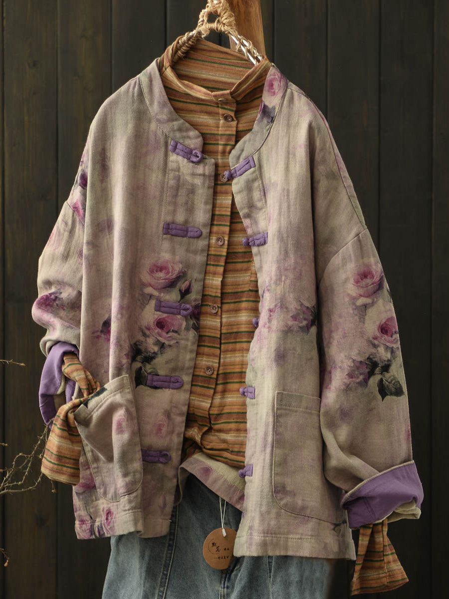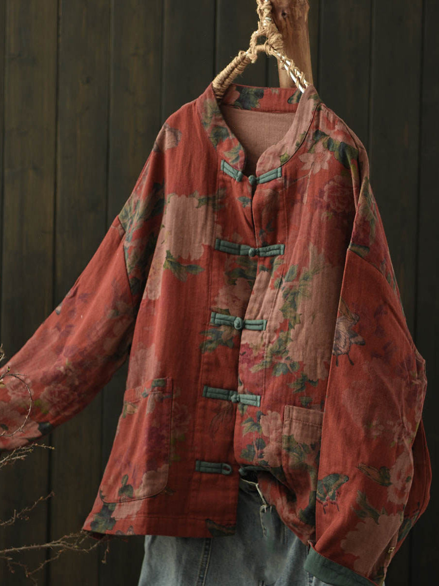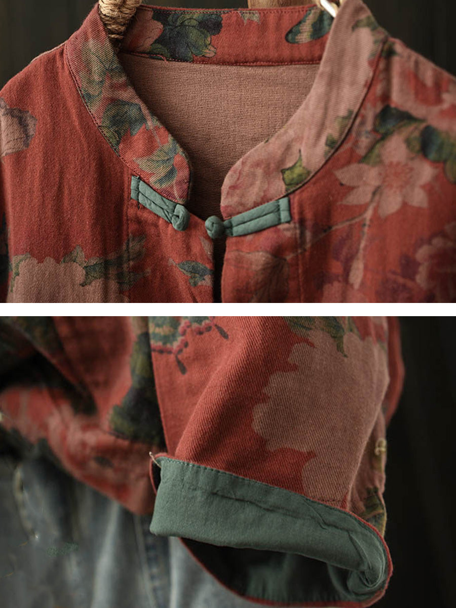 Abrigo de algodón con cuello alto y flores étnicas de invierno para mujer