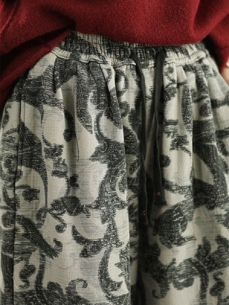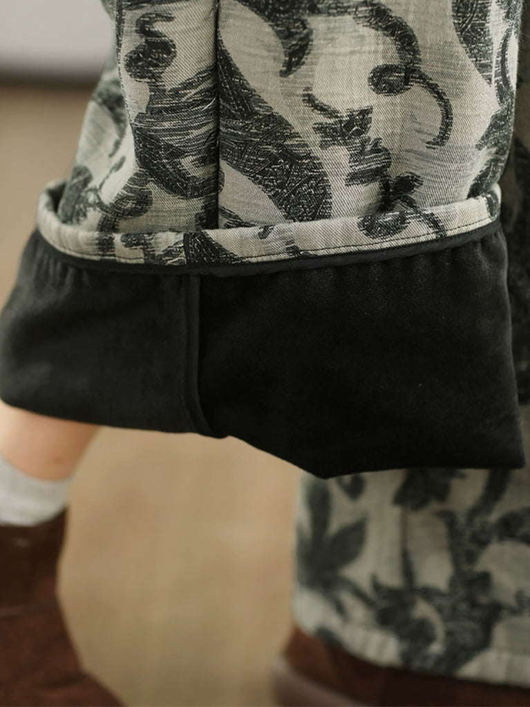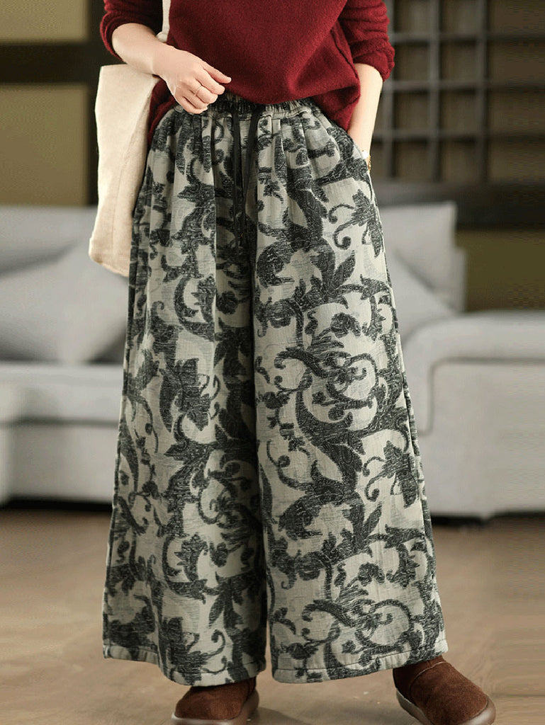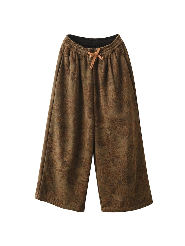 Pantalones anchos de invierno para mujer, 100 % algodón, forrados con vellón y estampado retro