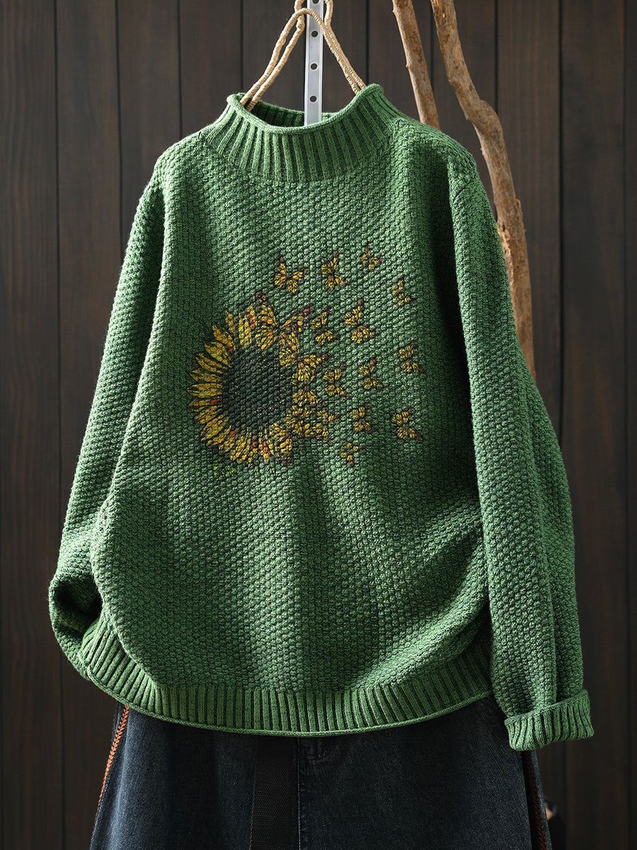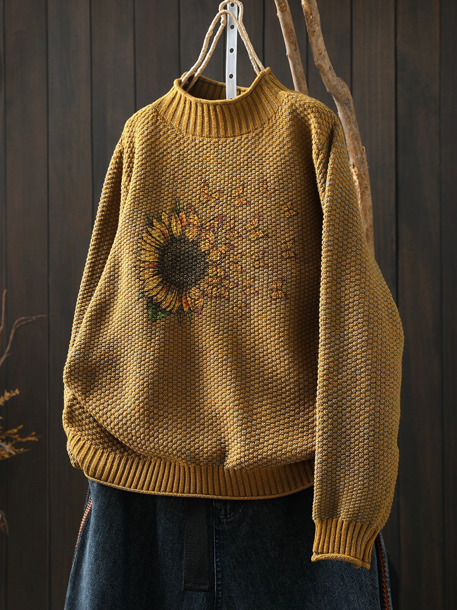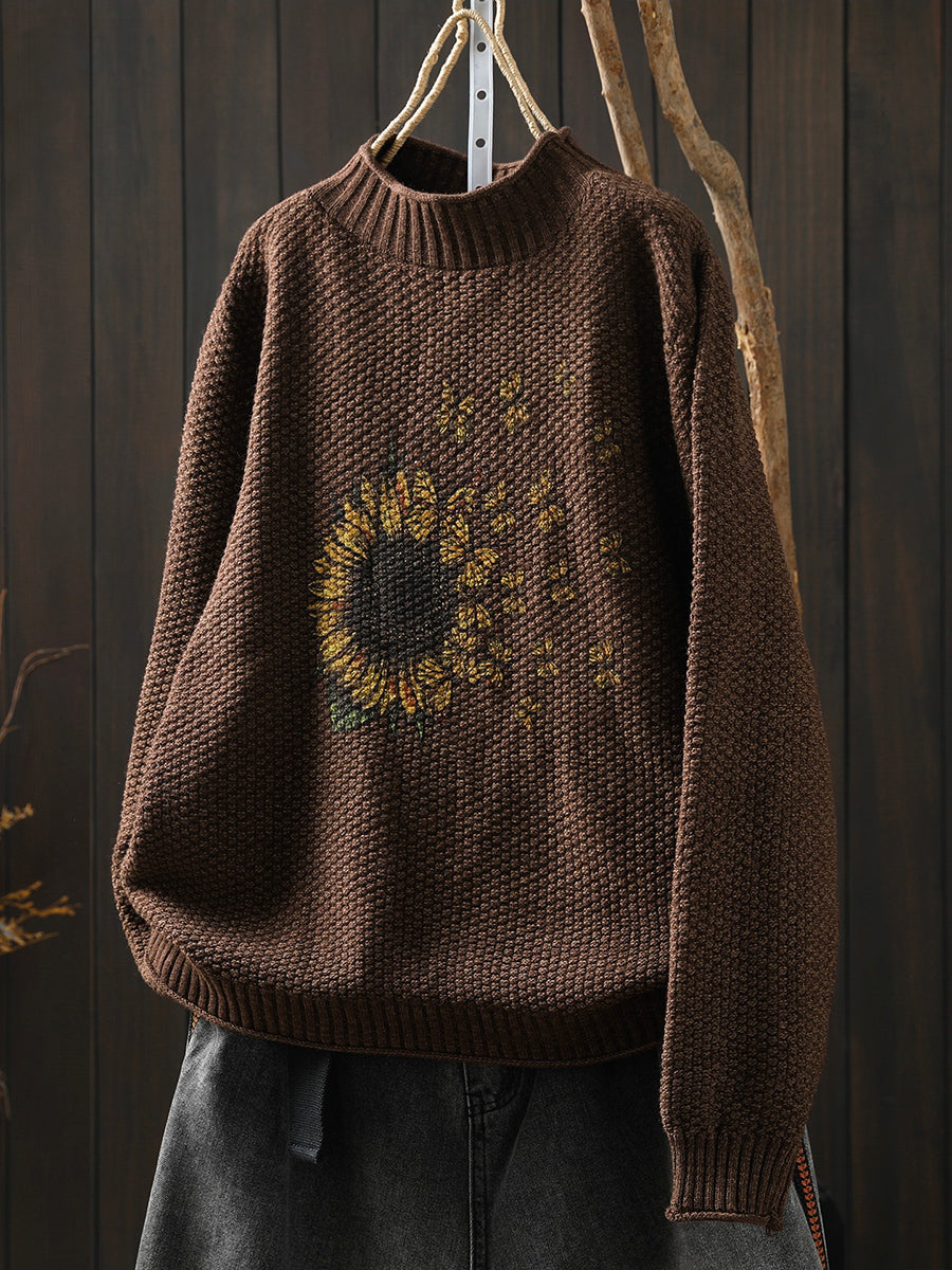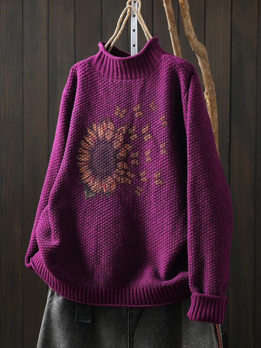 Suéter de cuello alto medio de punto con girasoles de invierno para mujer