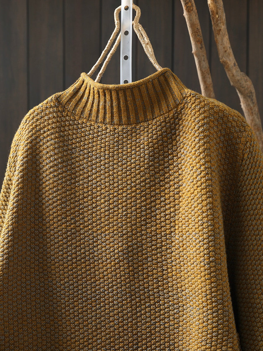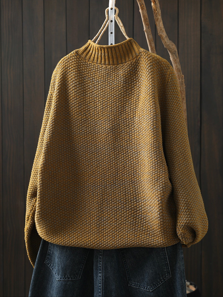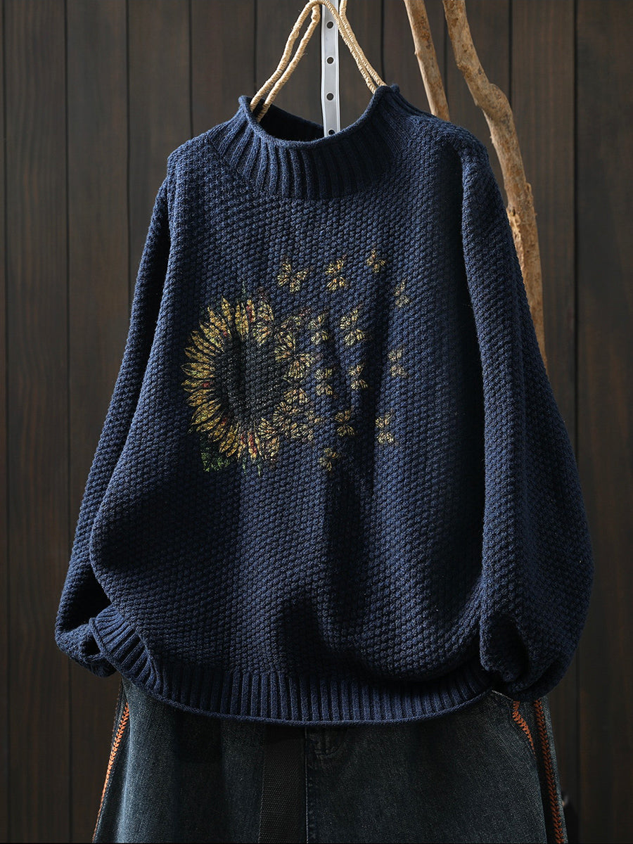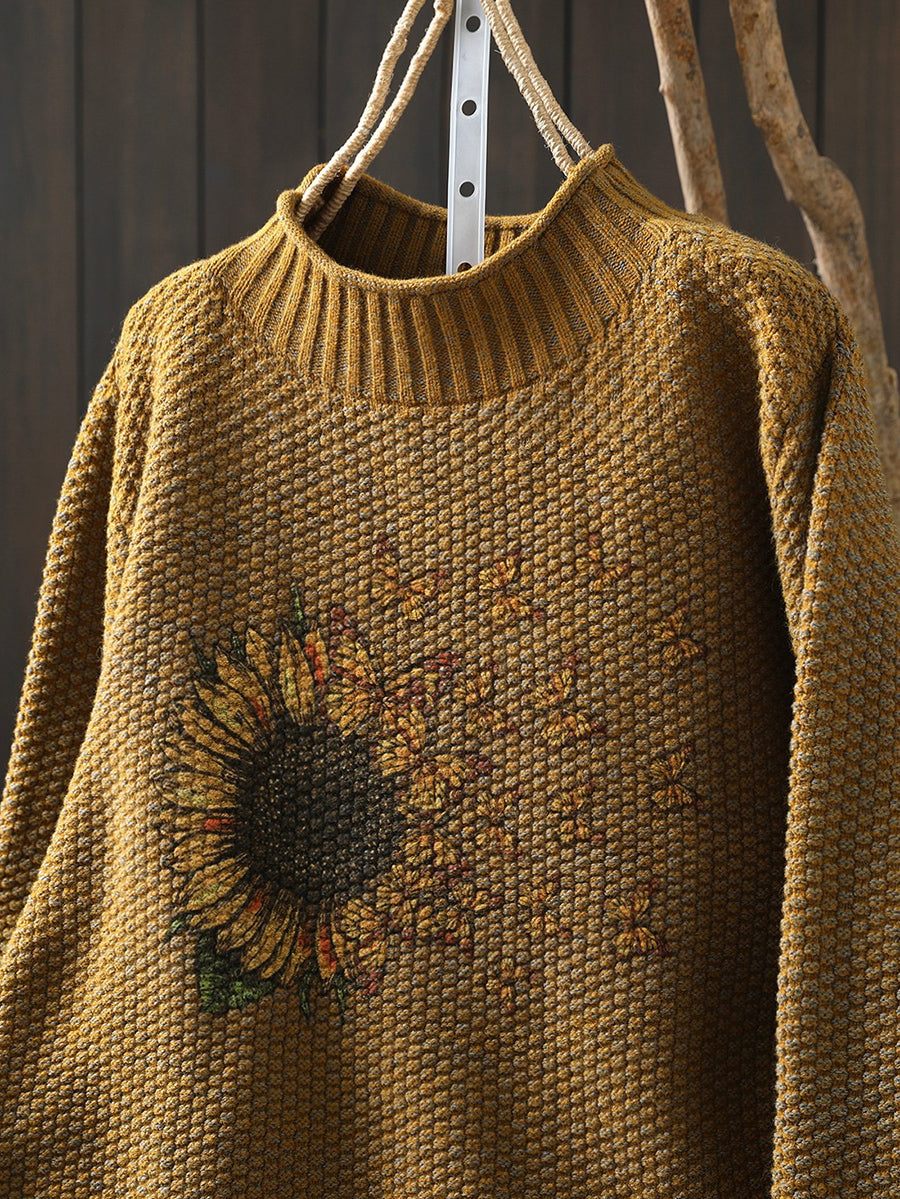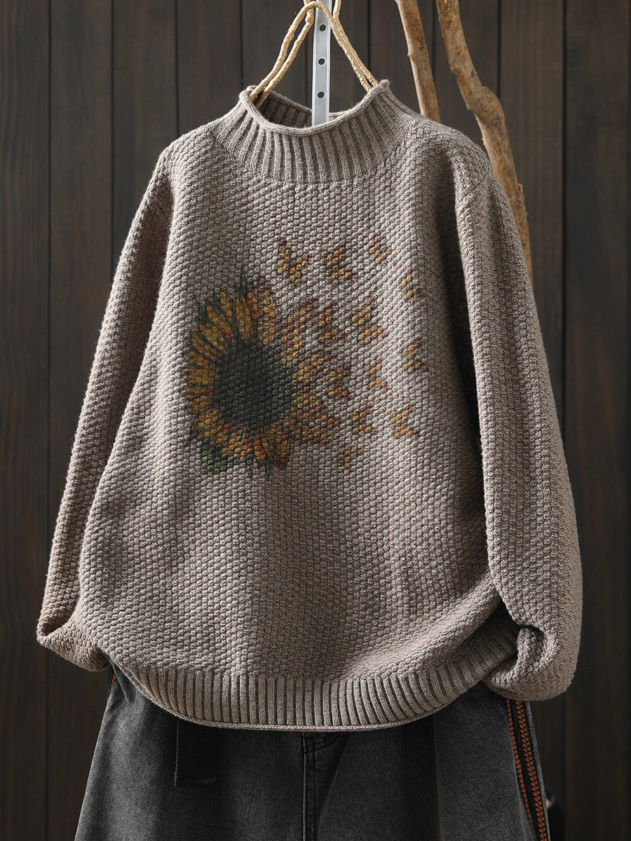Suéter de cuello alto medio de punto con girasoles de invierno para mujer